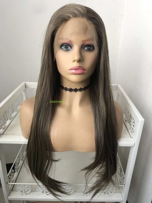Dark Brunette Blend Long Straight Hair Premium Synthetic Lace Frontal Wig Heat Friendly