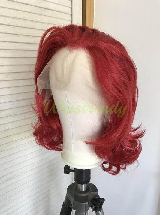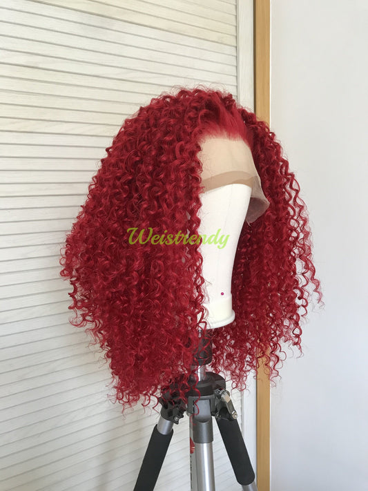Dark Red Medium Length Curls Wavy Hair Synthetic Soft Swiss Lace Front Wig Heat Friendly