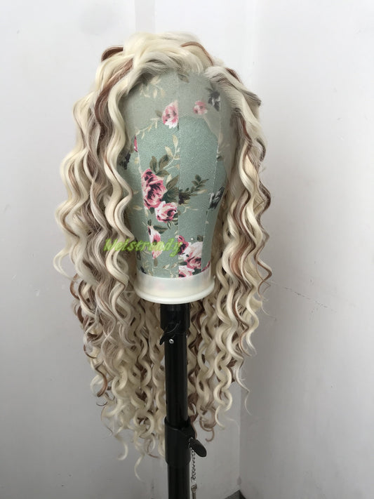 Mixed Blonde Brown Long Curls Wavy Wigs Premium Synthetic Fibre Heat Safe Glueless Lace Frontal Wig