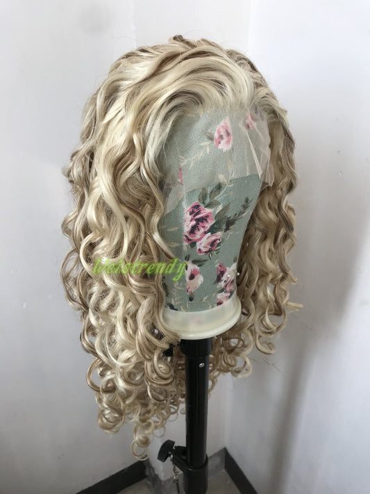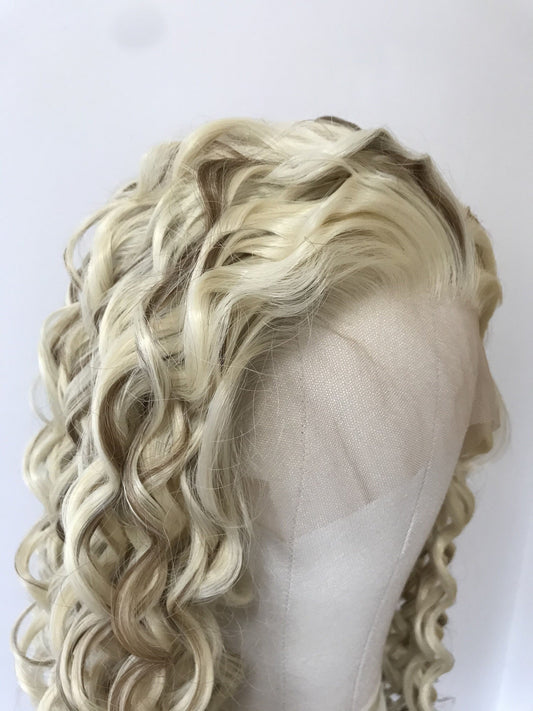 Mixed Blonde With White Tint Hair Medium Length Curls Wavy Hair Premium Synthetic Soft Swiss Lace Front Wigs