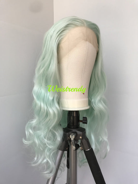 Mint Green Pastel Green Long Curls Wavy Hair Premium Synthetic Swiss Lace Front Wigs Heat Safe