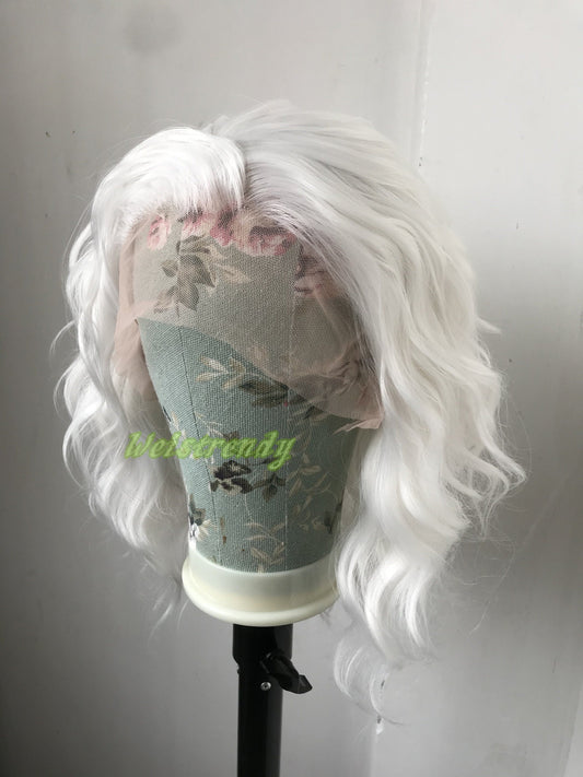 Platinum Blonde Medium Length Waves Hair Premium Synthetic Soft Swiss Lace frontal Wig Free Part Heat Friendly