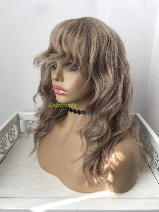 Mixed Brown Blonde Ombre Platinum Blonde Long Wavy Wigs with Fringes/Bangs Synthetic Wigs Heat Safe