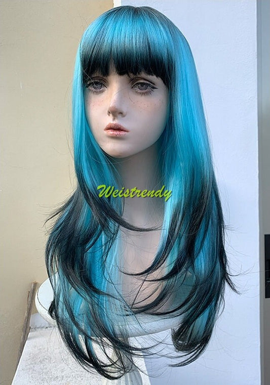 Blue Ombre Black Wig Butterfly Cut and Long Straight Hair with Dip Dyed Bangs Synthetic No lace Cosplay Wig Fun Wigs Heat Safe