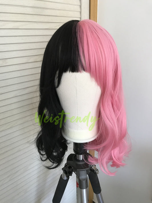 Half and Half Pink Black 16in Body Wave Hair Premium Synthetic No Lace Wig with Bangs Heat Ok