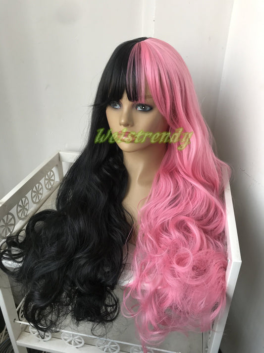Half and Half Pink | Black Long Straight Waves Hair Premium Synthetic No Lace Wig with Bangs Heat Ok