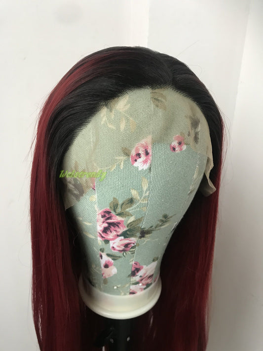Ombré Dark Red Long Straight Hair with Black Roots Premium Synthetic Soft Swiss Lace Frontal Wig Multi Parting