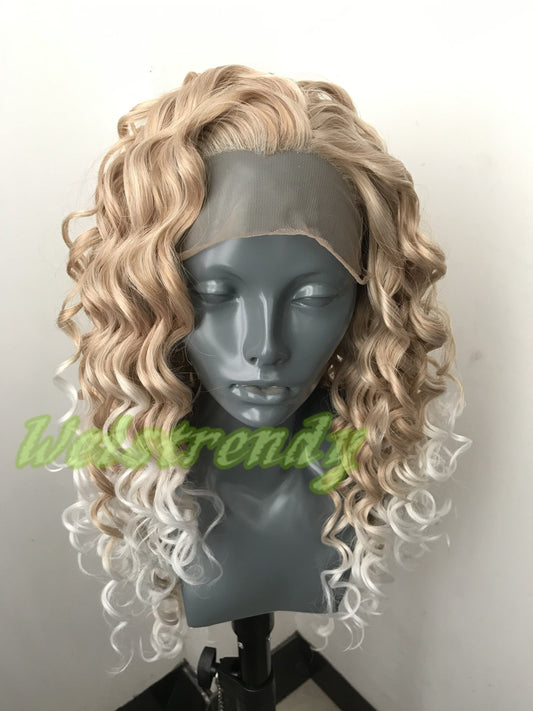 Mixed Blonde Ombre White Blonde Medium Length Curls Wavy Hair with White Frame | Premium Synthetic Lace Front Wig Free Part Heat Safe