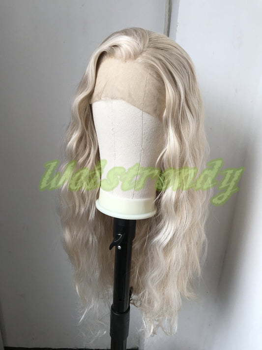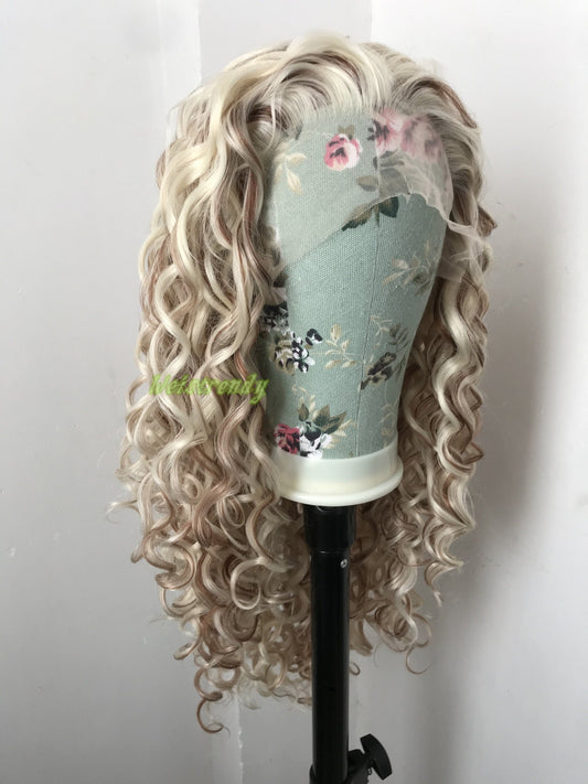 Mixed Blonde With White Tint Hair Medium Length Curls Wavy Hair Premium Synthetic Soft Swiss Lace Front Wigs