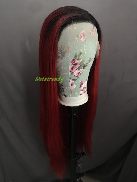 Ombré Dark Red Long Straight Hair with Black Roots Premium Synthetic Soft Swiss Lace Front Wig Multi Parting