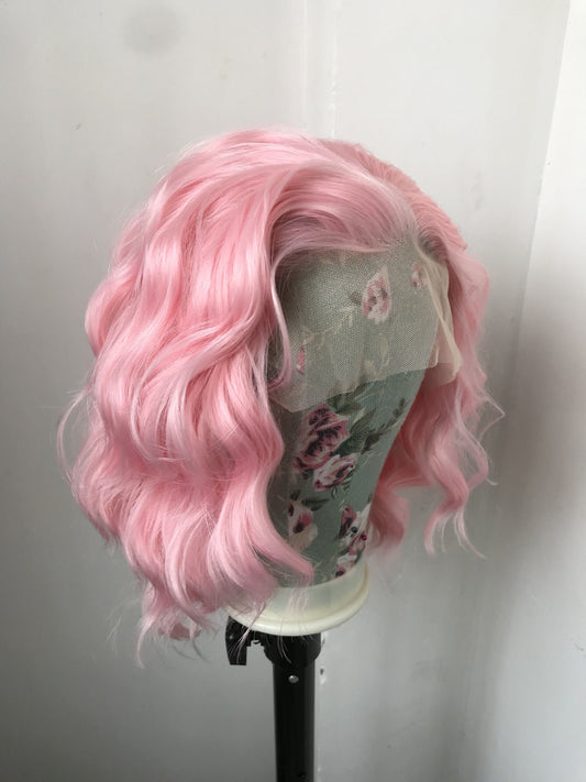 Ice Pink Wigs Beachy Wavy Short Bob Premium Synthetic Swiss Lace Front Wig Free Partting Heat Safe