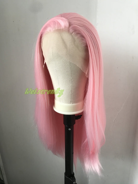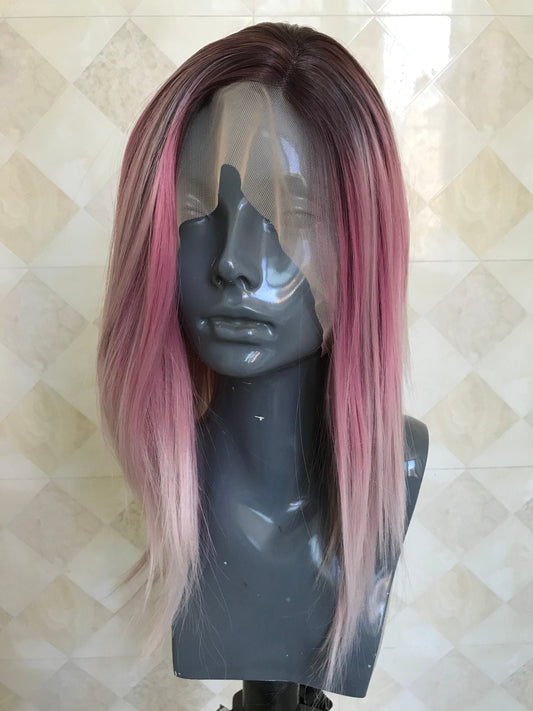 Rooted Blush Pink OmbreShort Straight Hair Premium Synthetic Lace frontal Wig Heat Safe Side Parting
