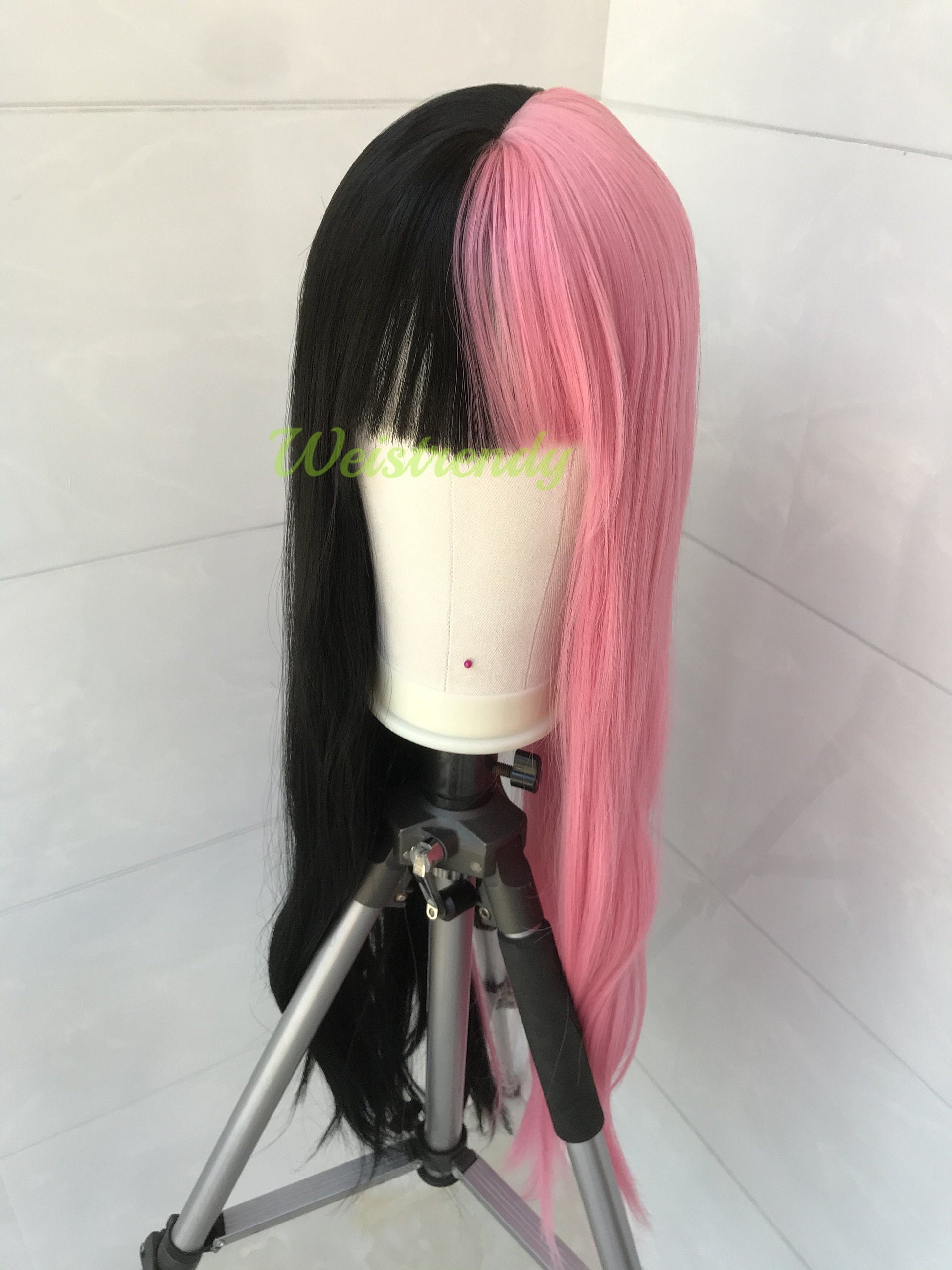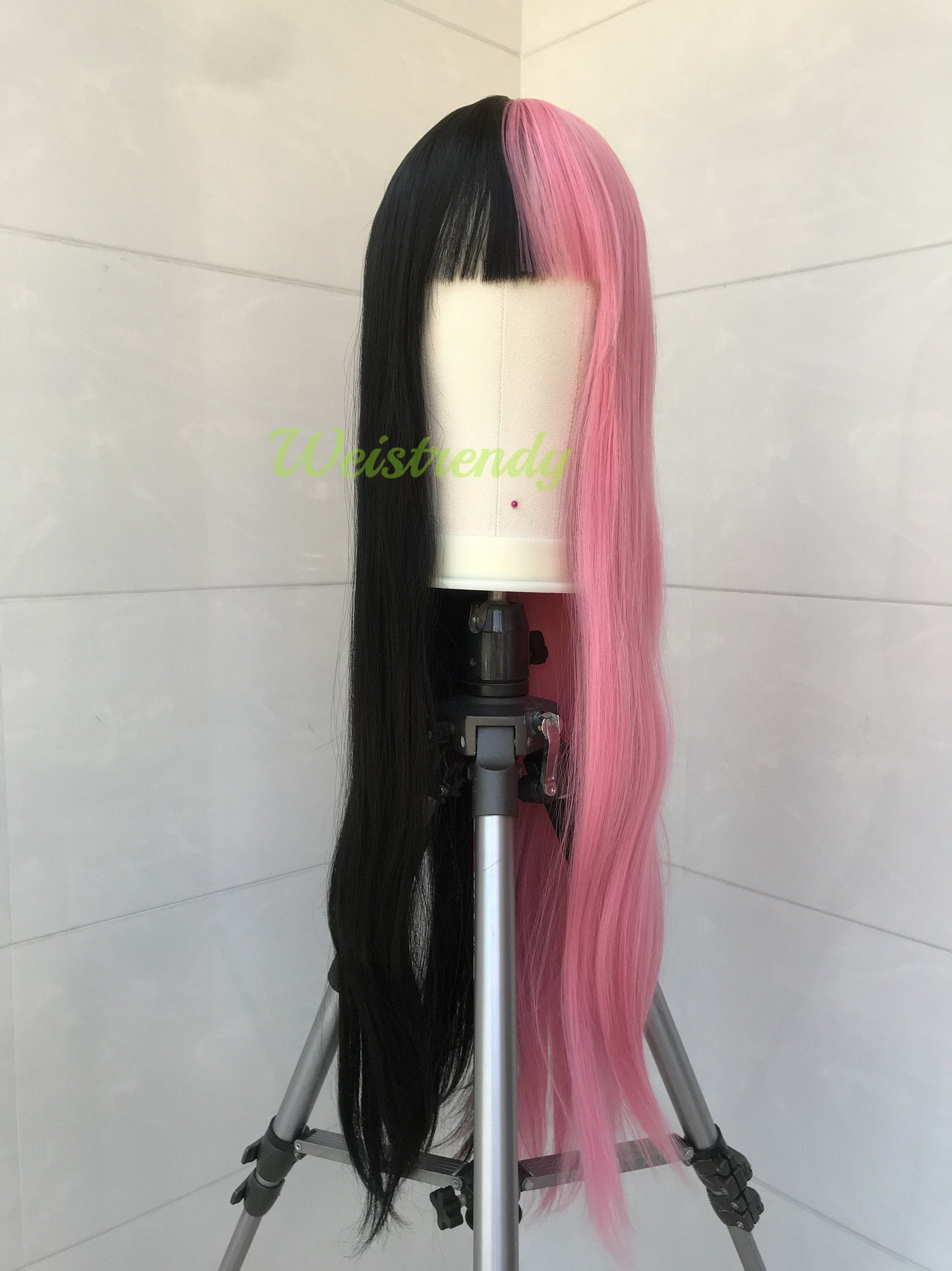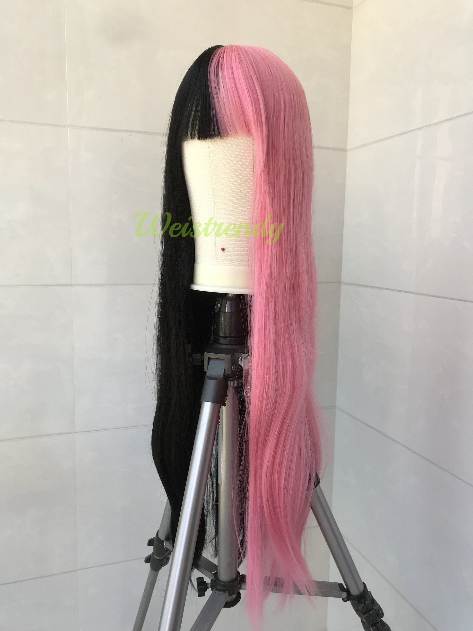 30in Split Dye Pink Black Long Straight Hair Premium Synthetic No Lace Wig with Bangs Heat Ok