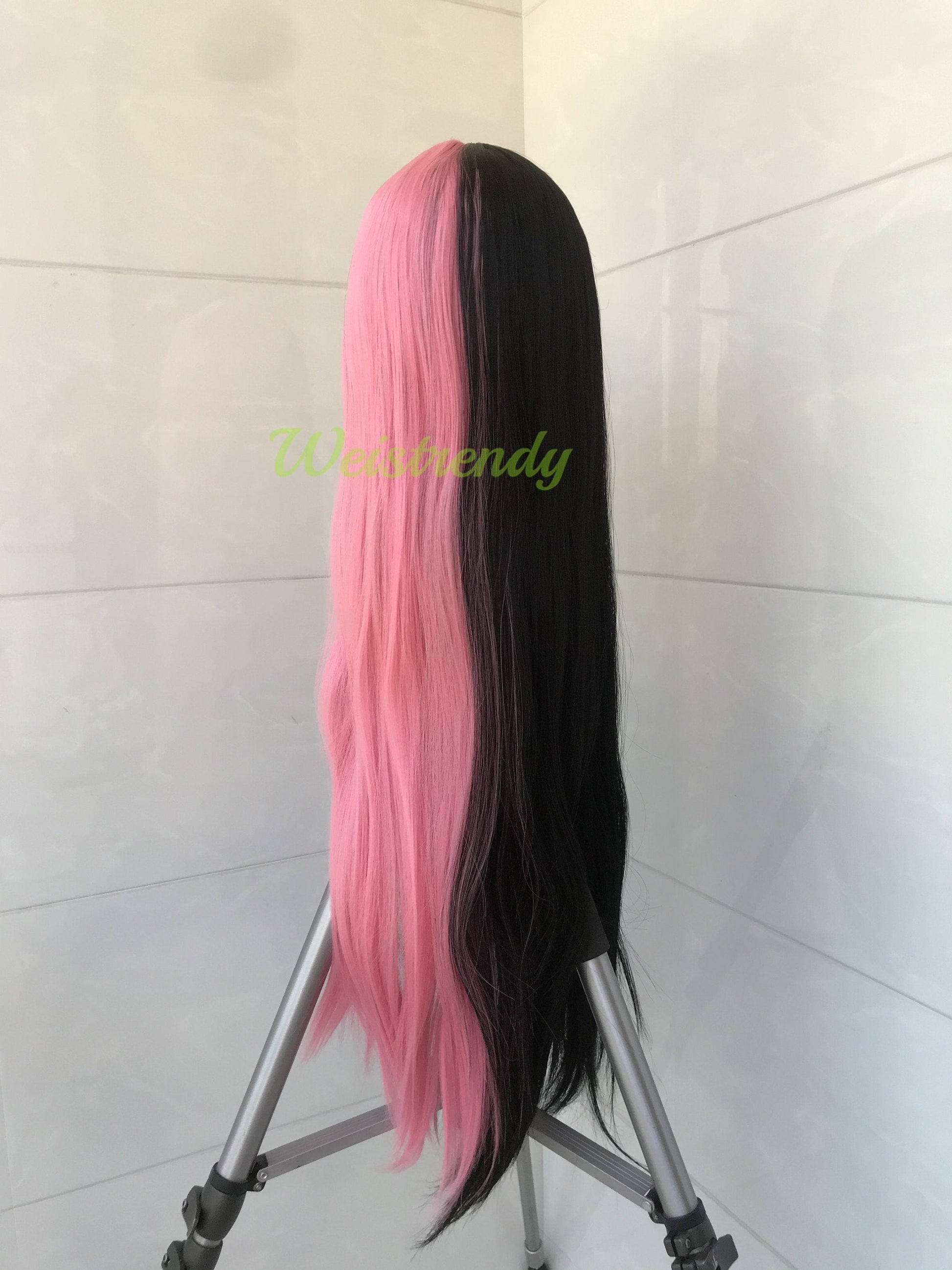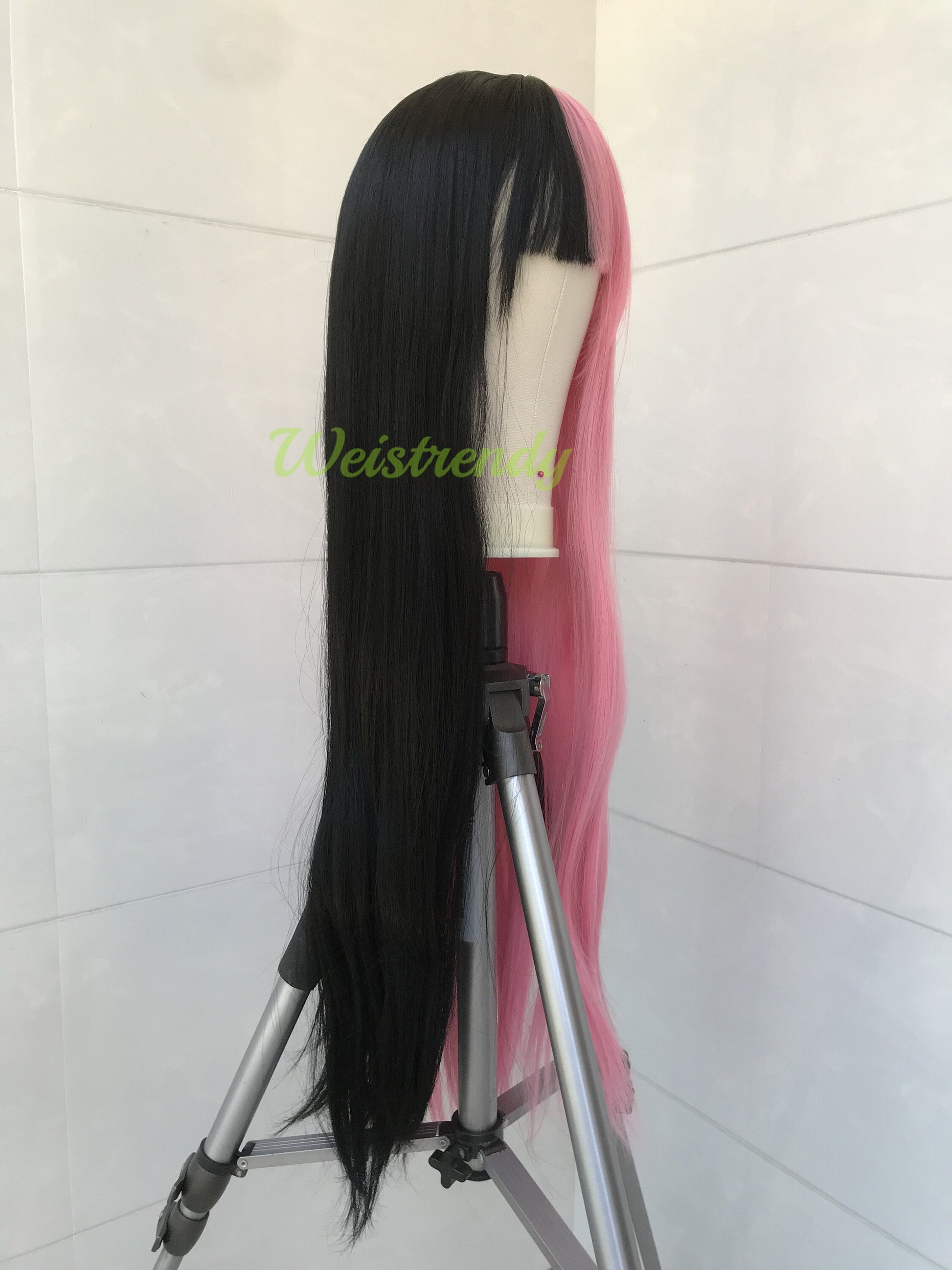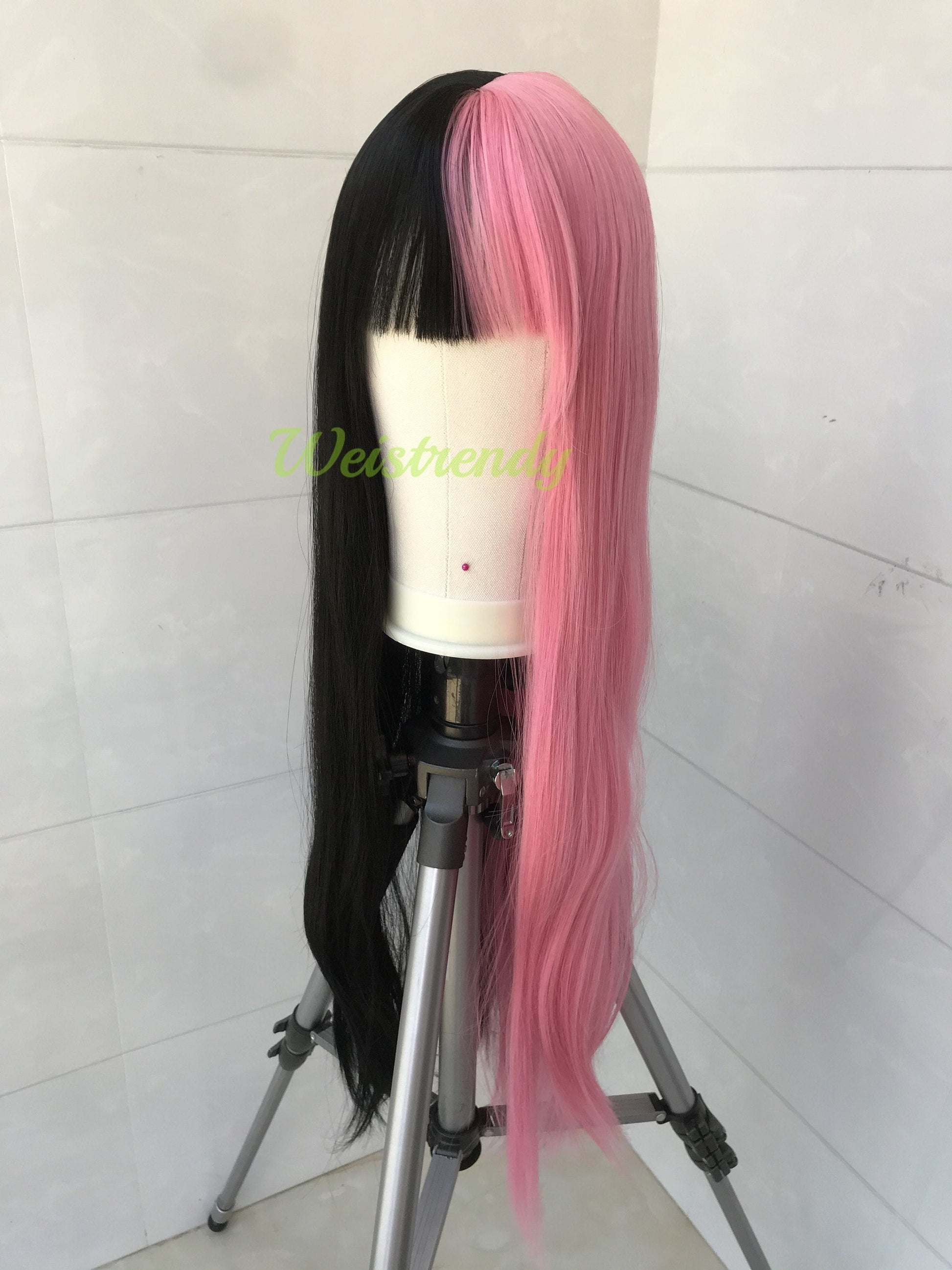 30in Split Dye Pink Black Long Straight Hair Premium Synthetic No Lace Wig with Bangs Heat Ok
