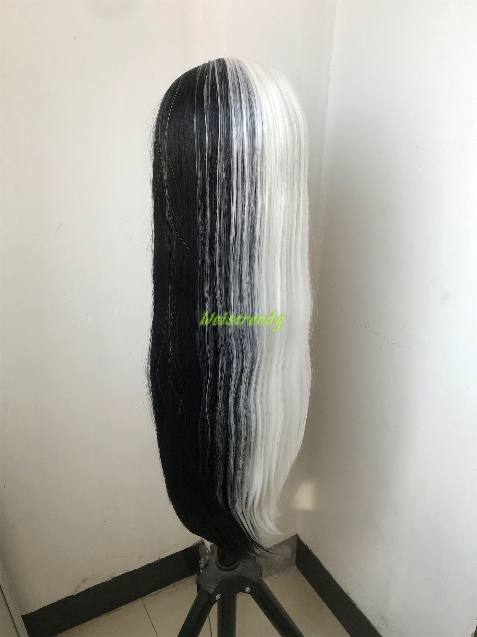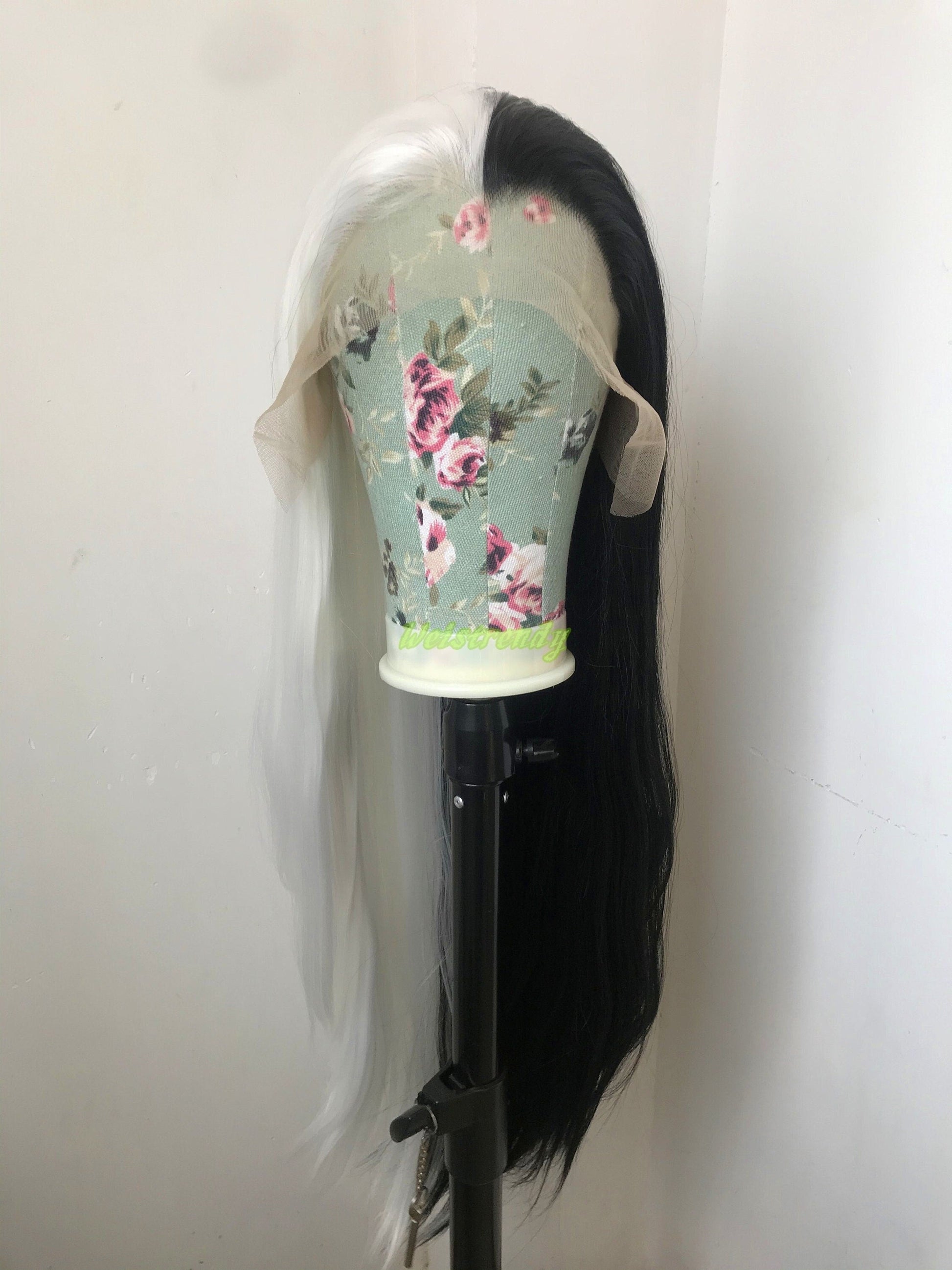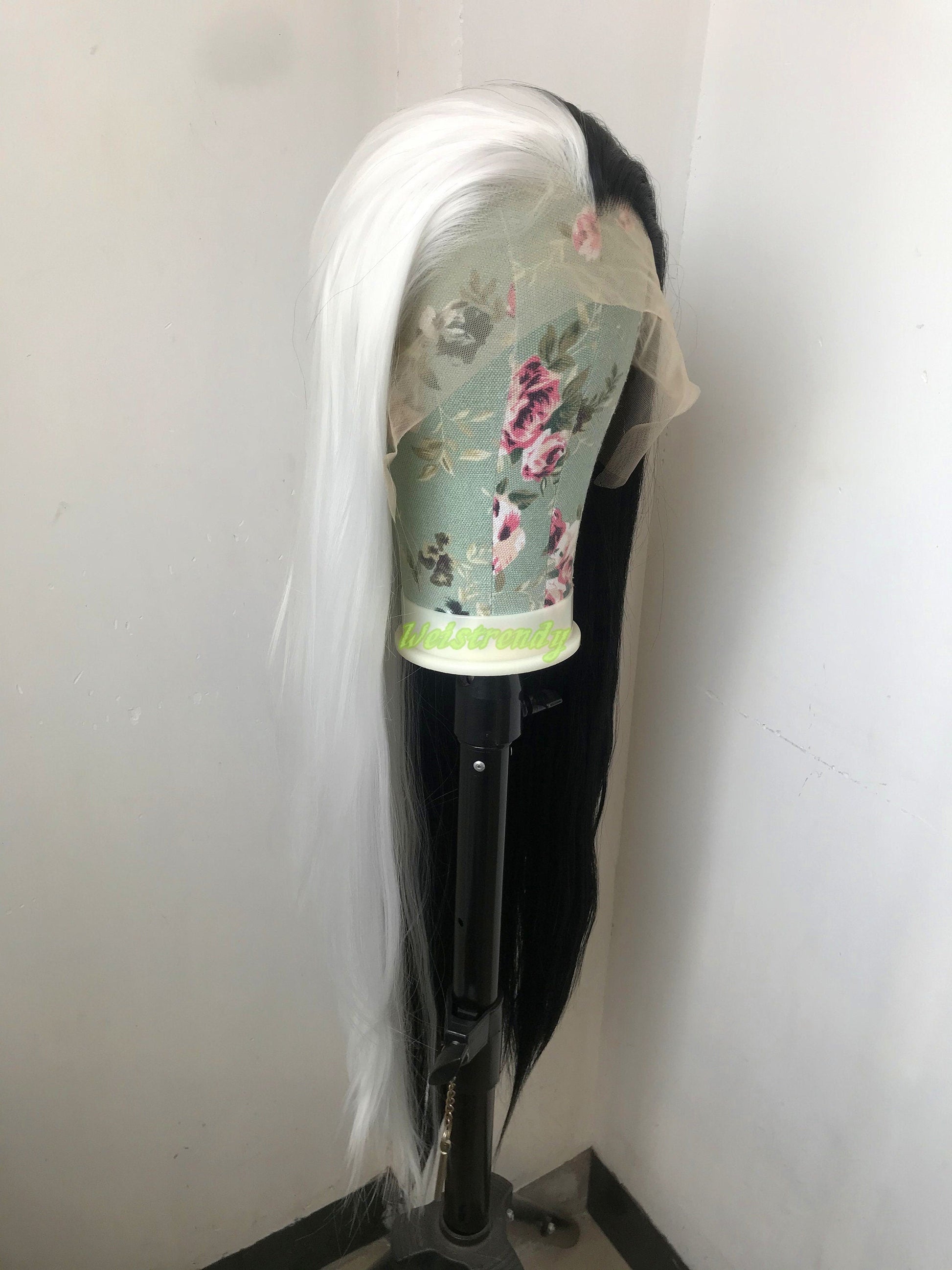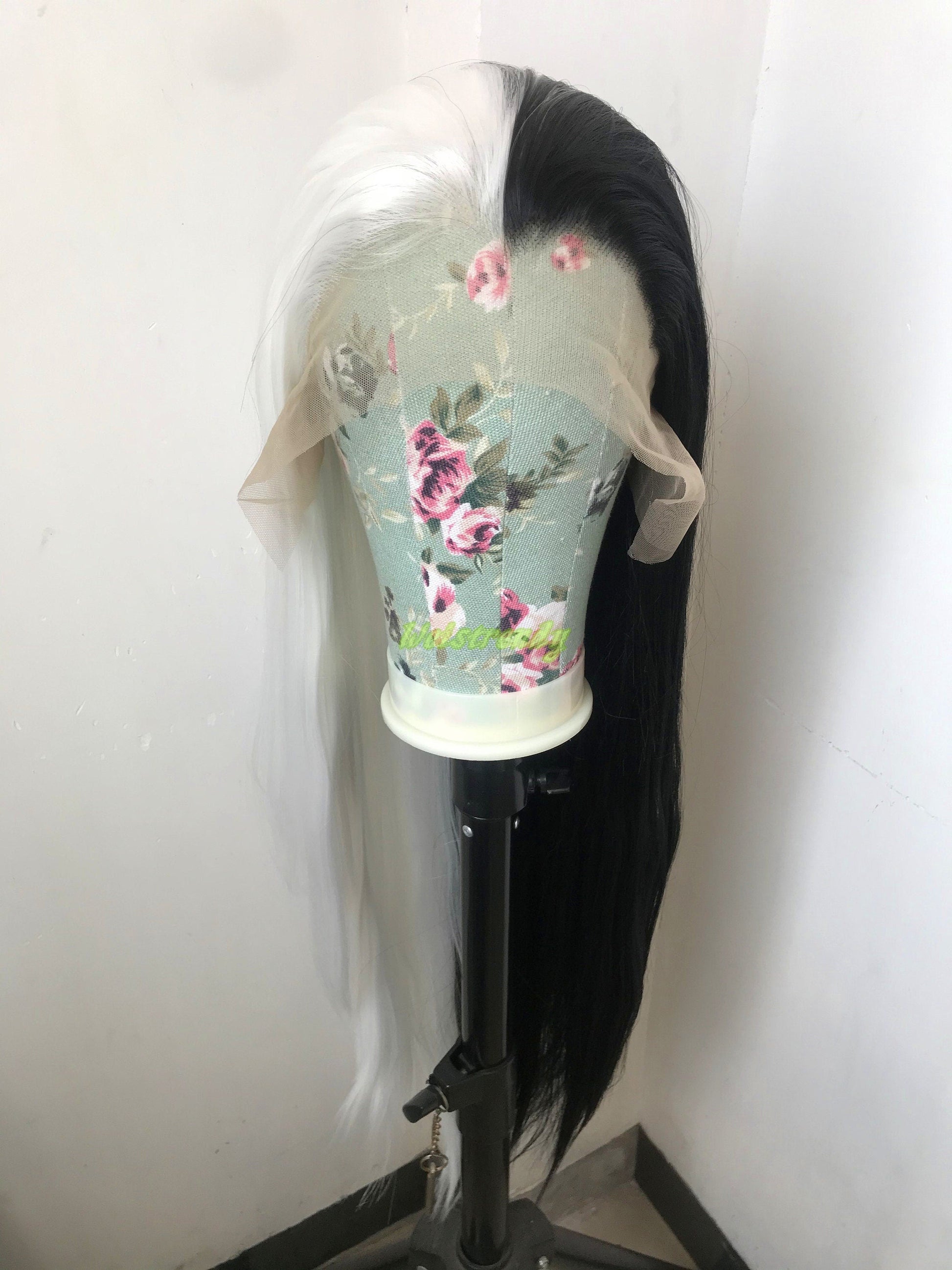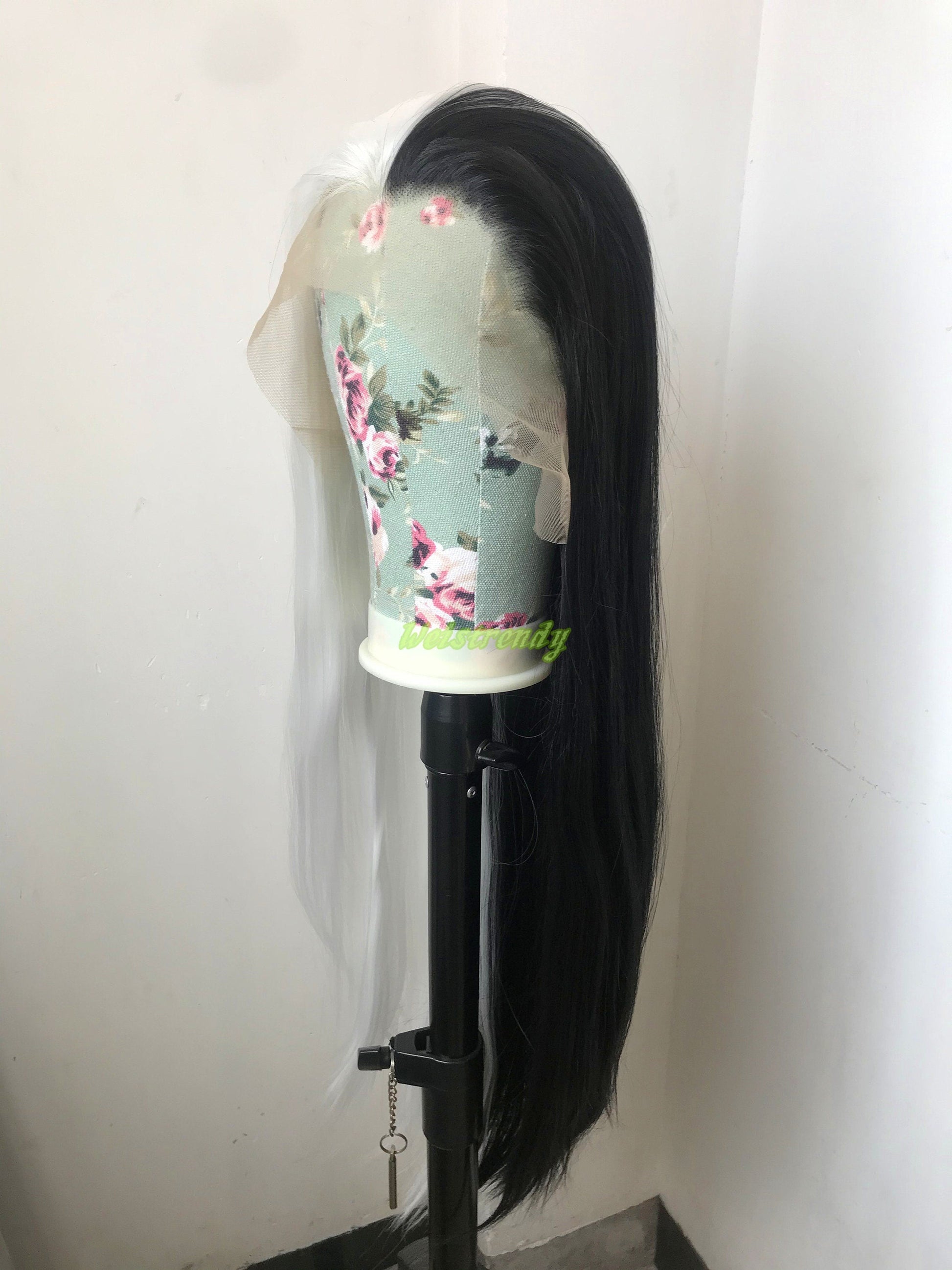 32in Half and Half Black White Long Straight Hair Synthetic Lace Frontal Wig with Natural Hairline