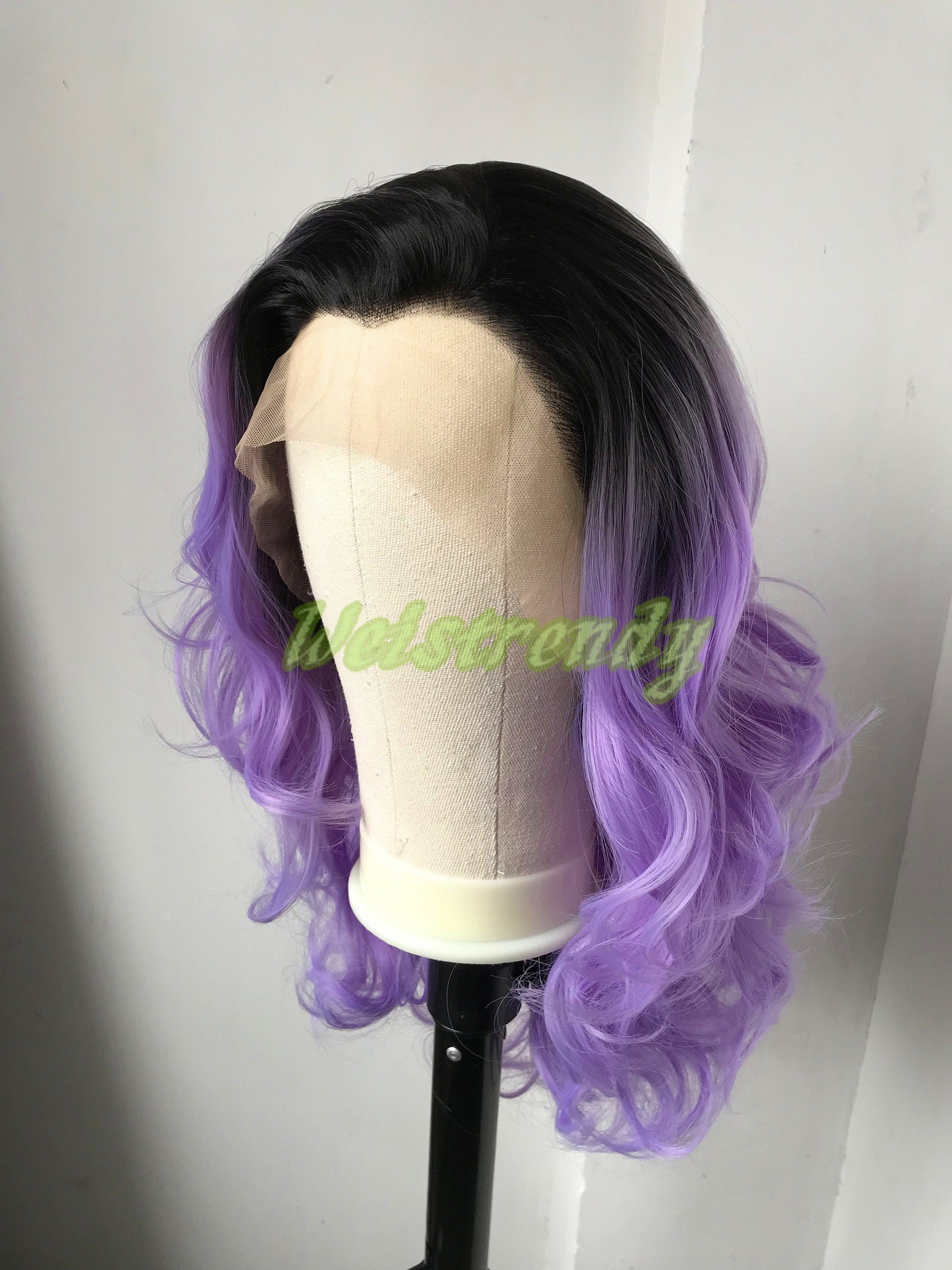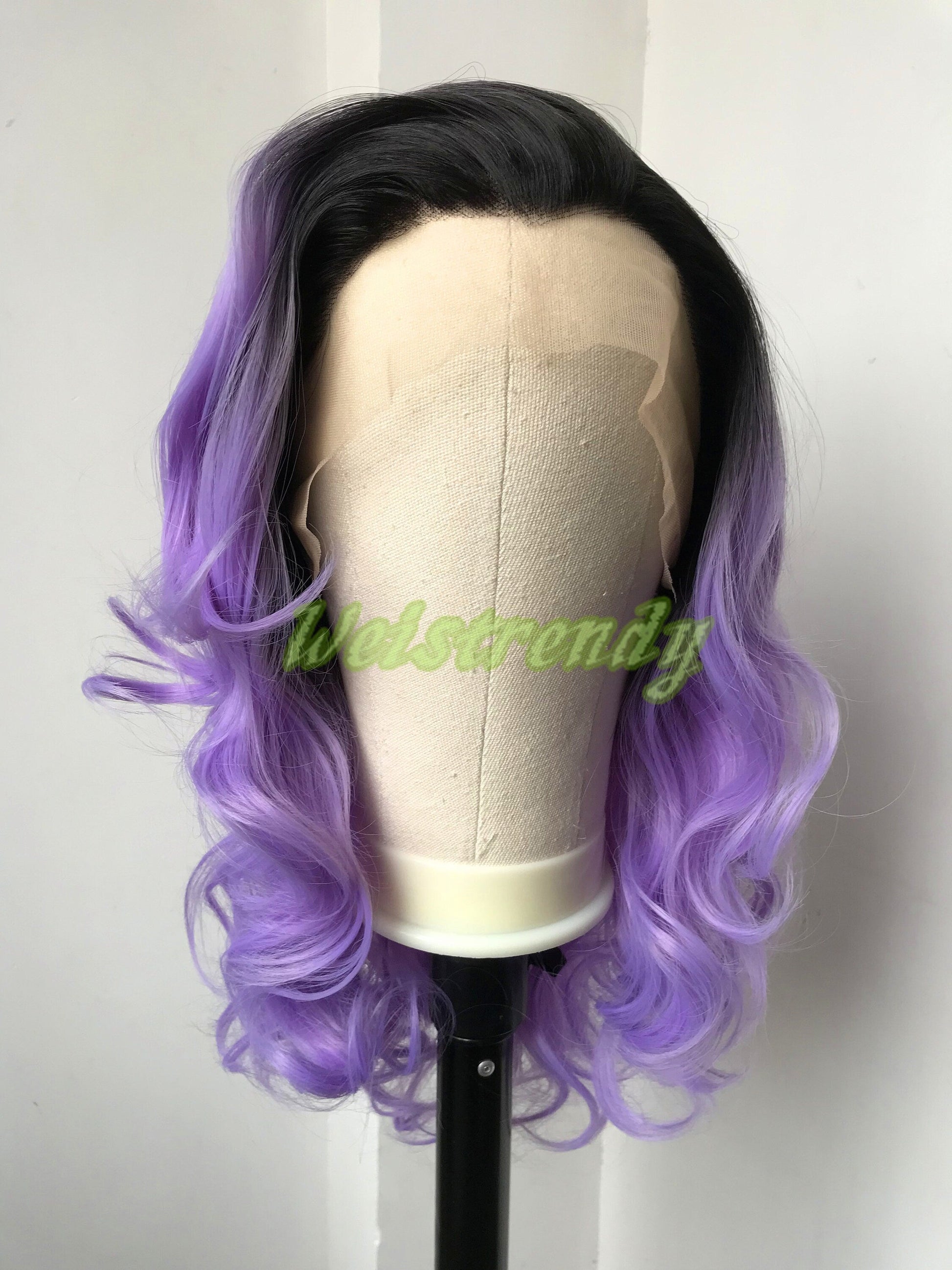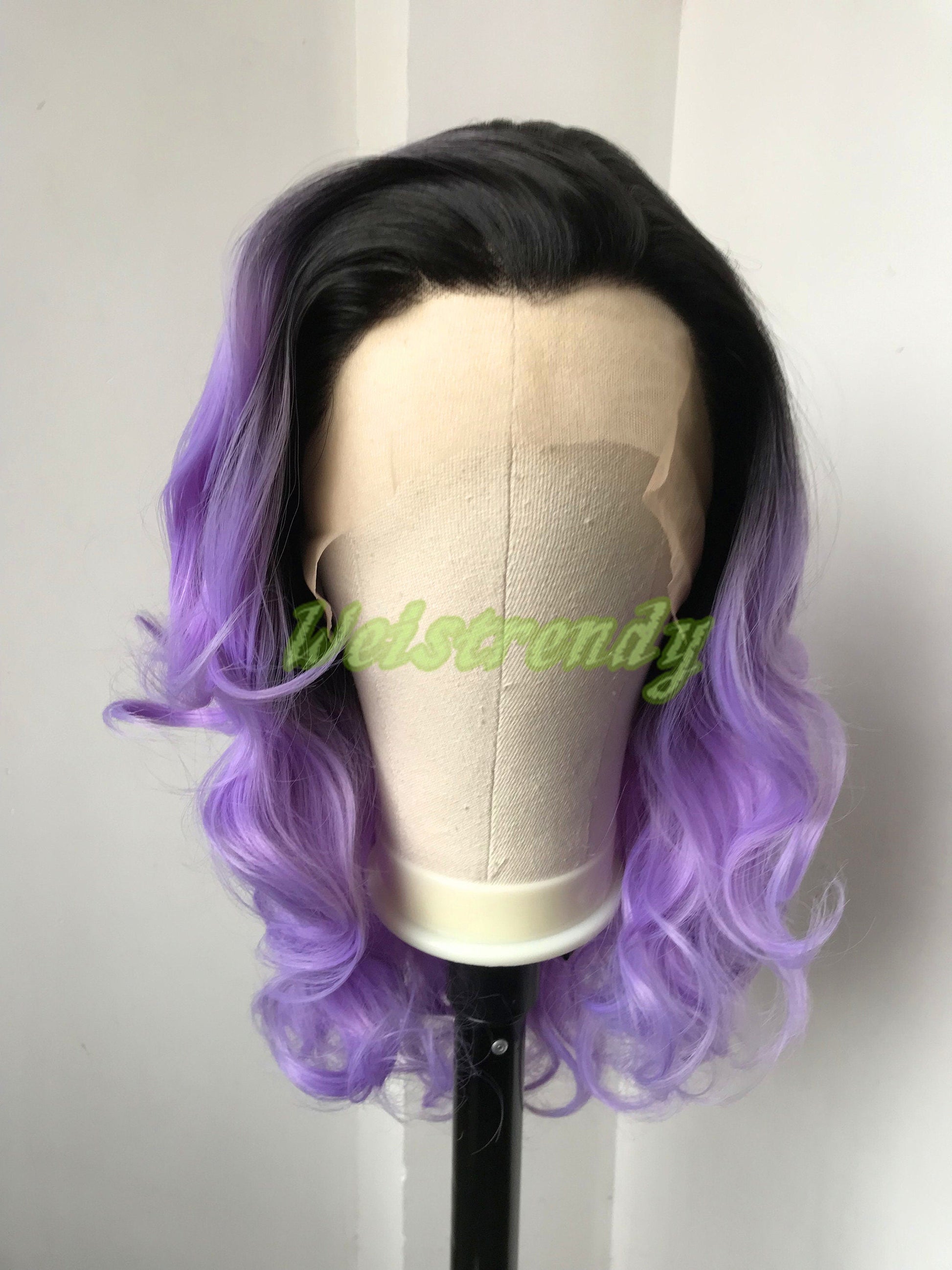 Black Rooted Purple | lavender 16in Short Curls Wigs Premium Synthetic Lace Frontal Ombré Wig Free Part | Realistic
