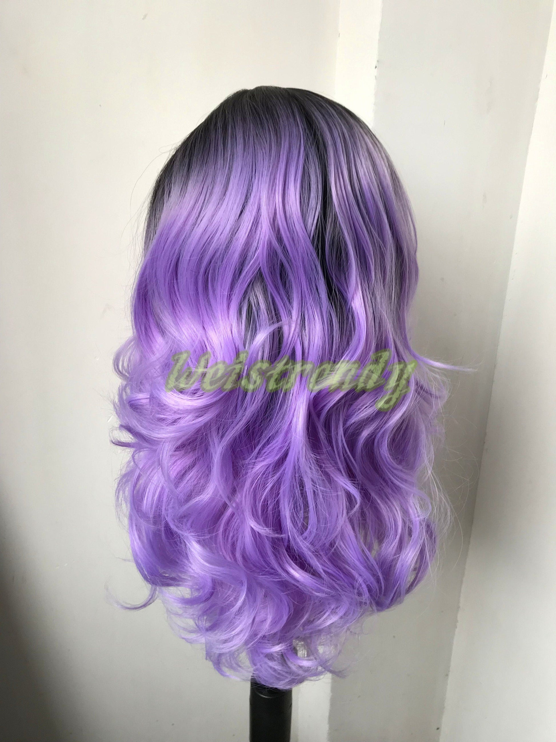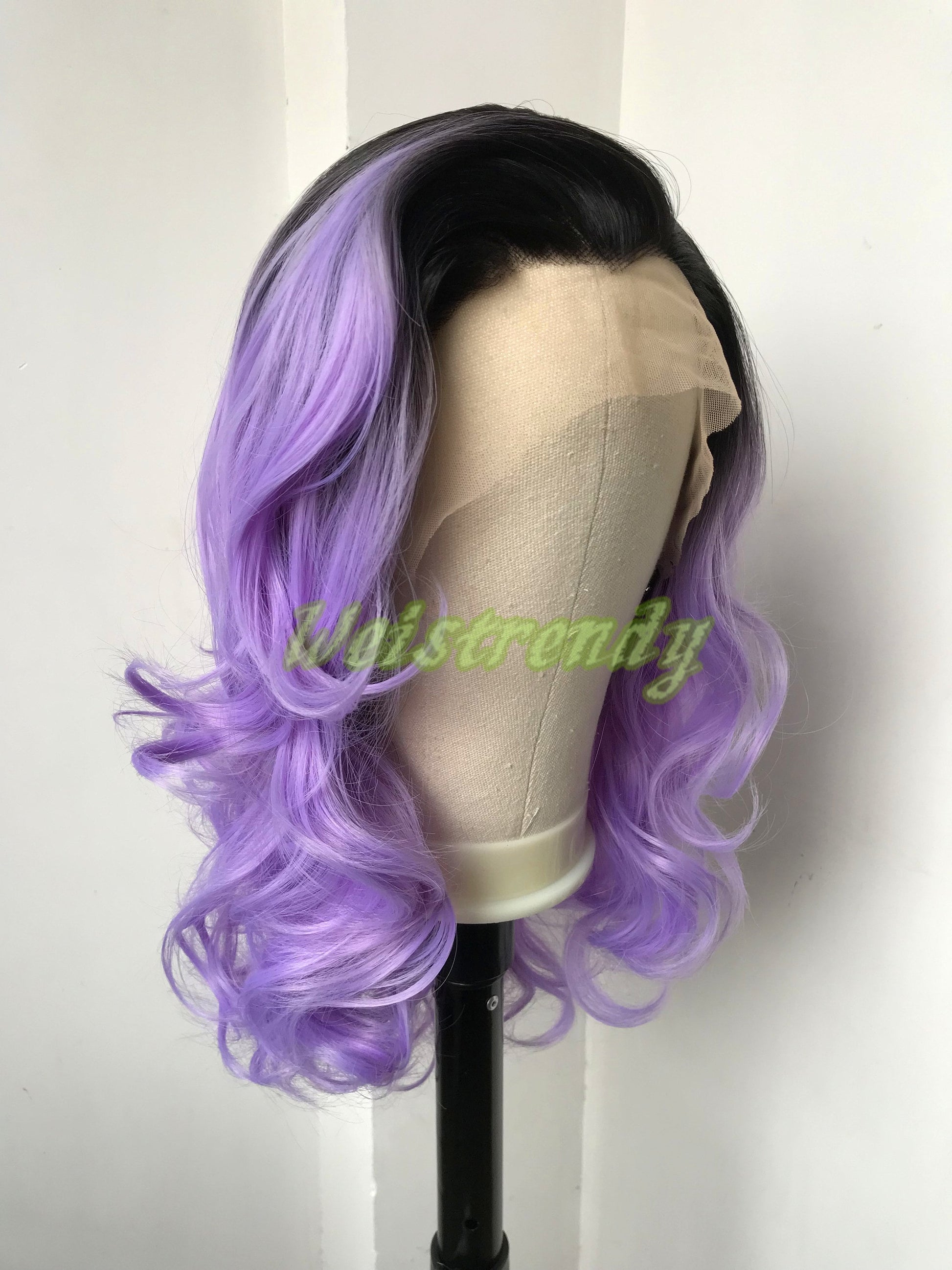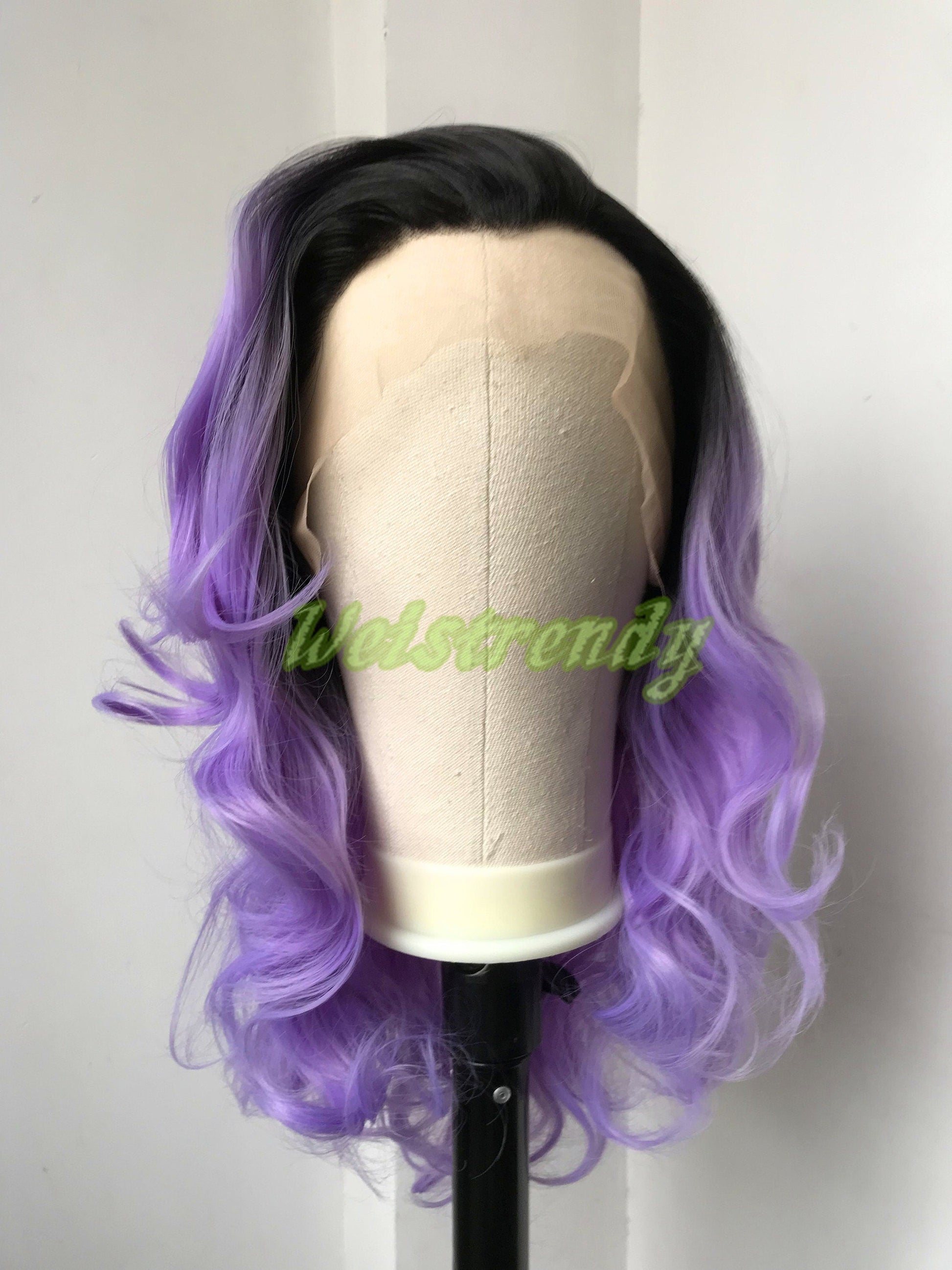 Black Rooted Purple | lavender 16in Short Curls Wigs Premium Synthetic Lace Frontal Ombré Wig Free Part | Realistic