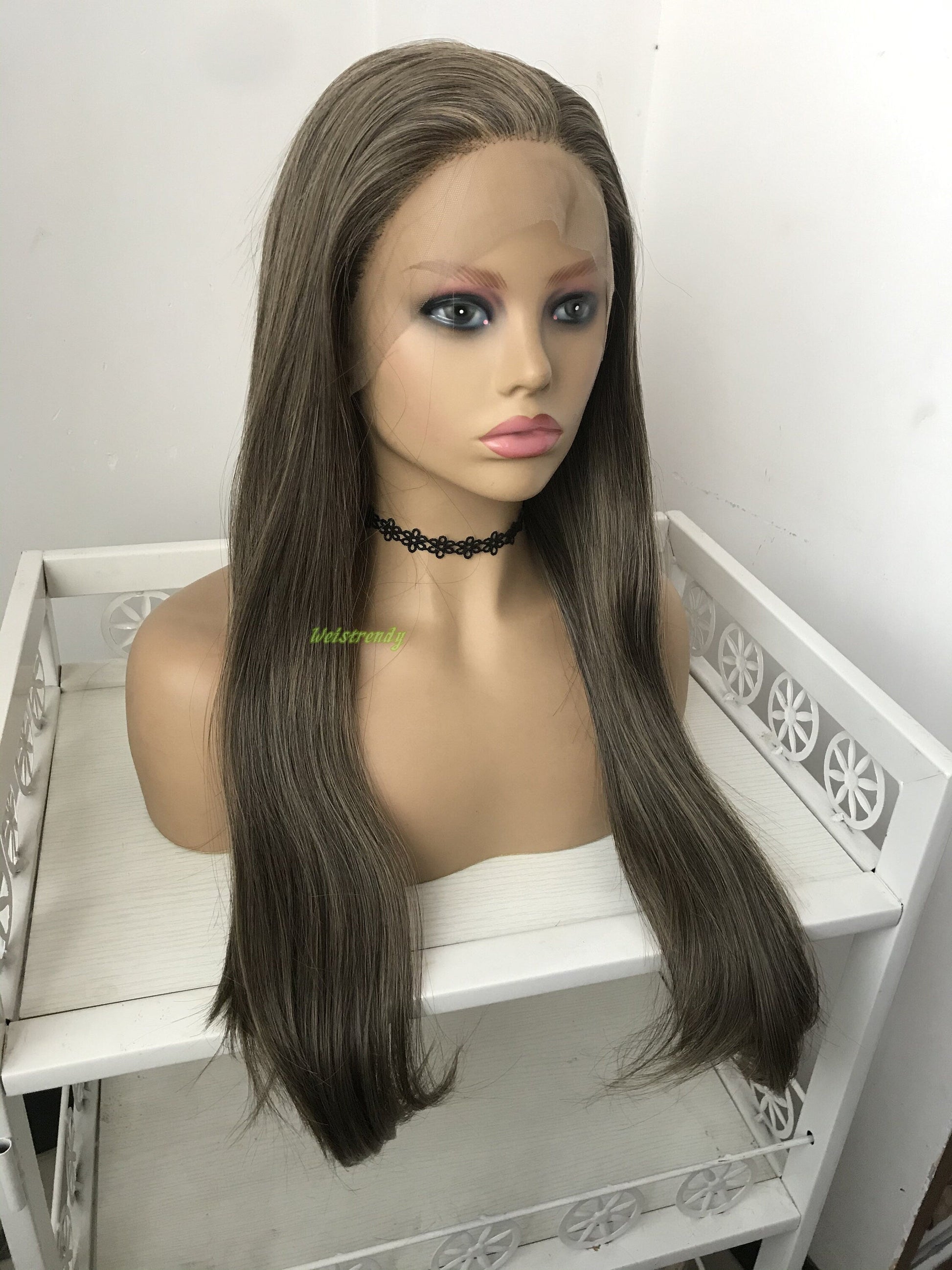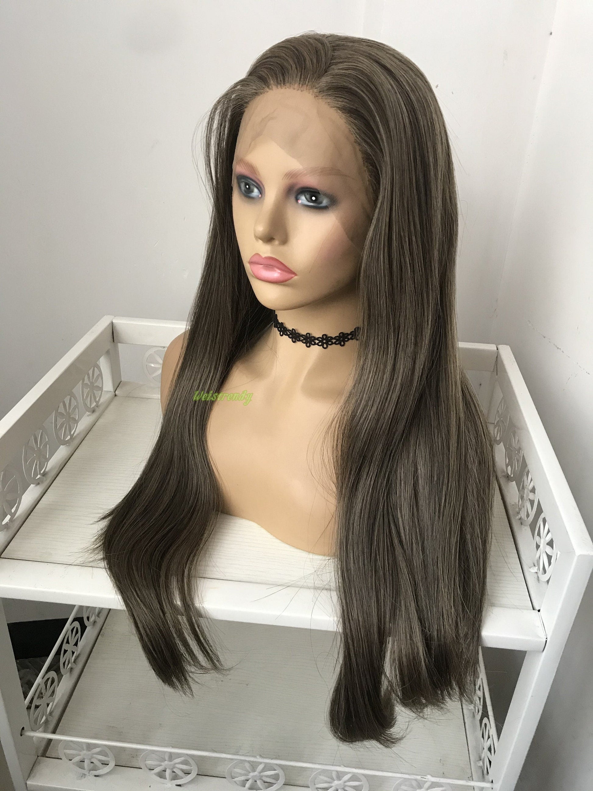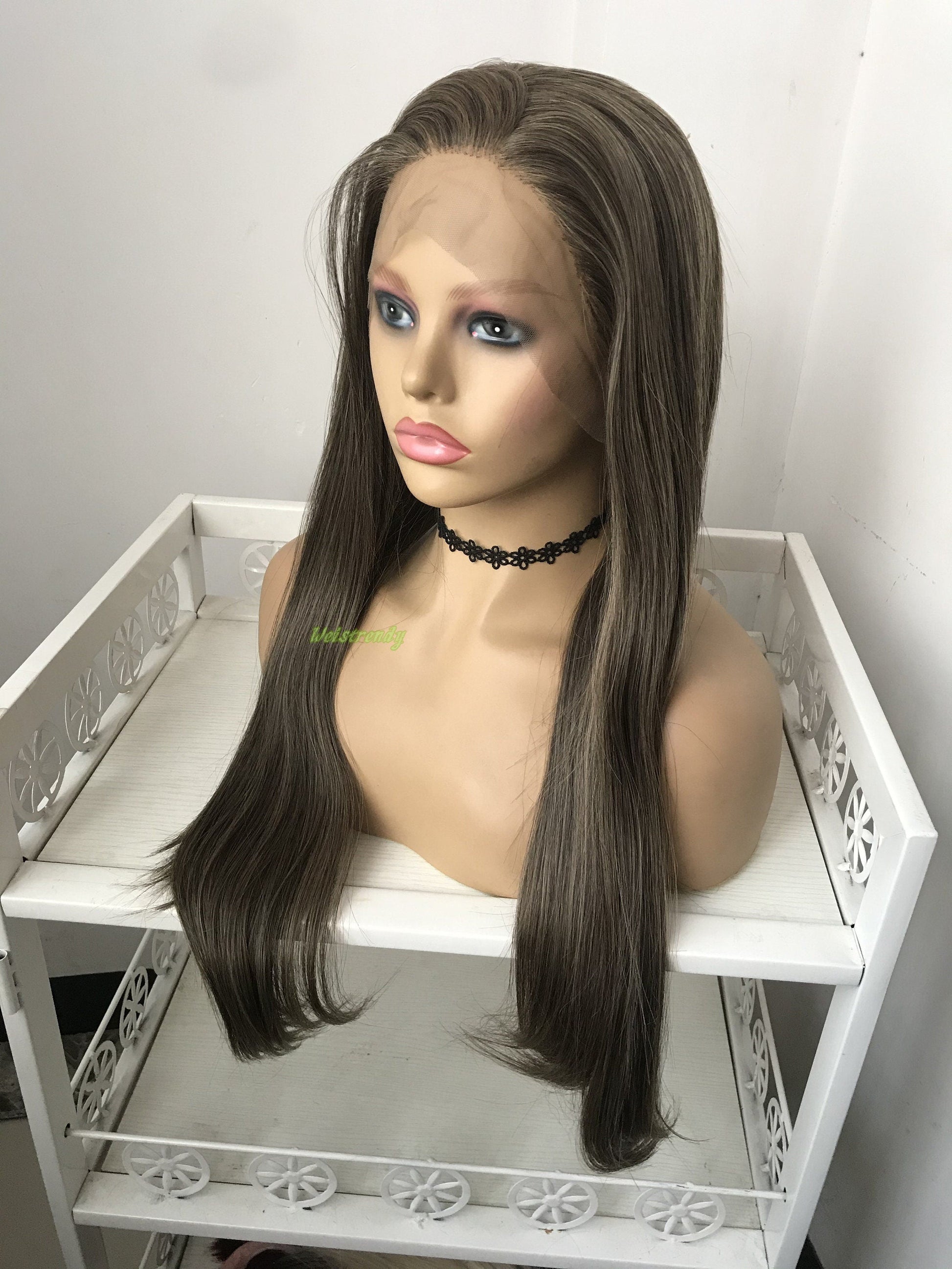 Dark Brunette Blend Long Straight Hair Premium Synthetic Lace Frontal Wig Heat Friendly