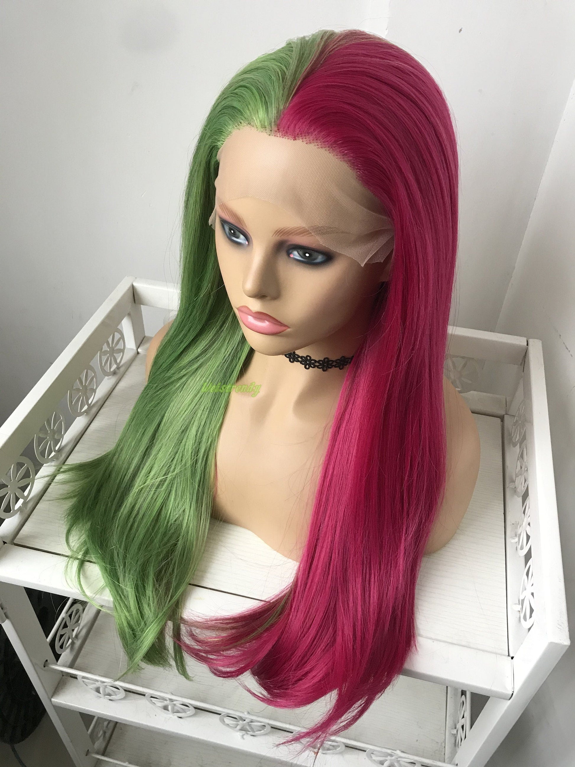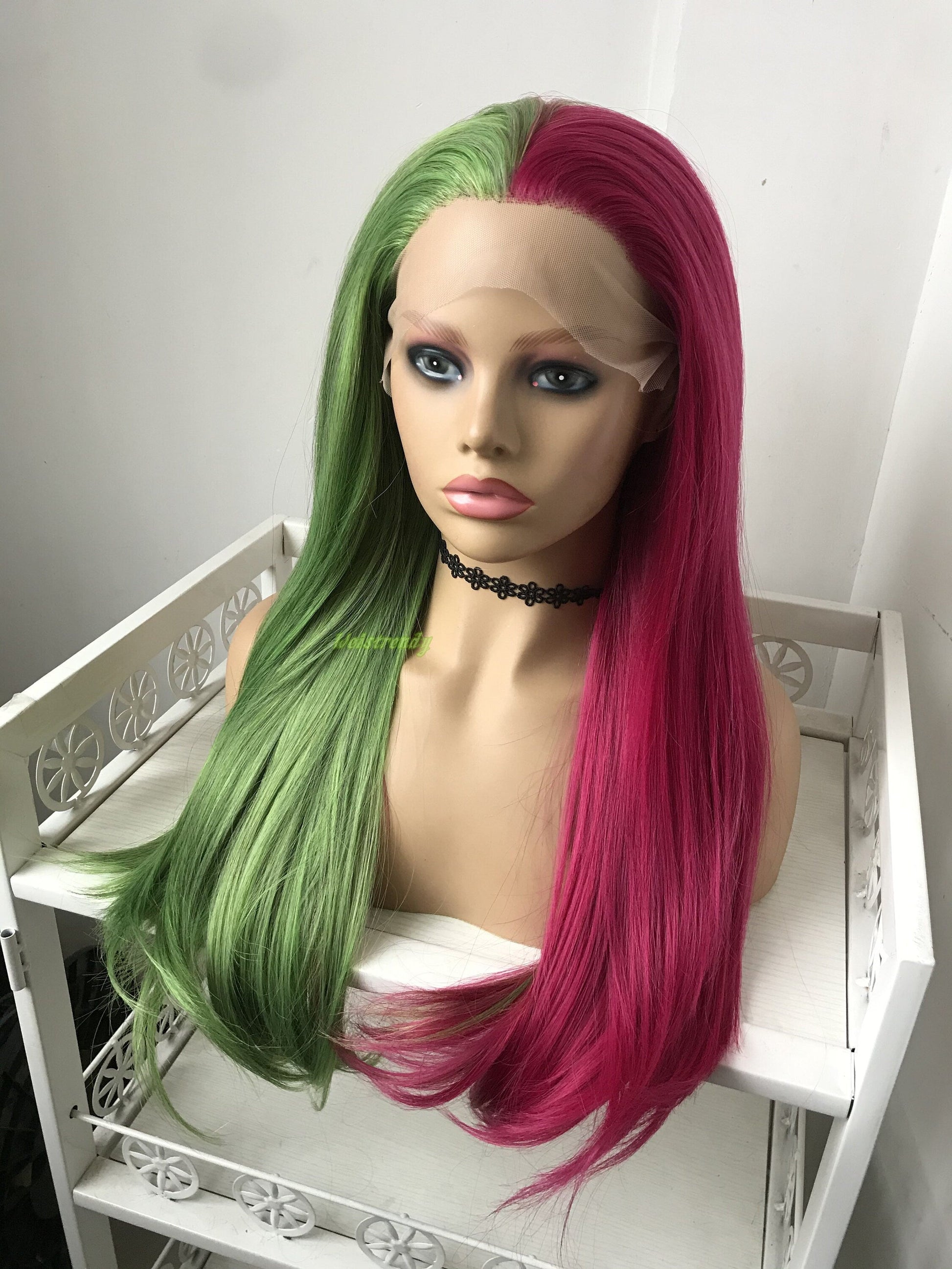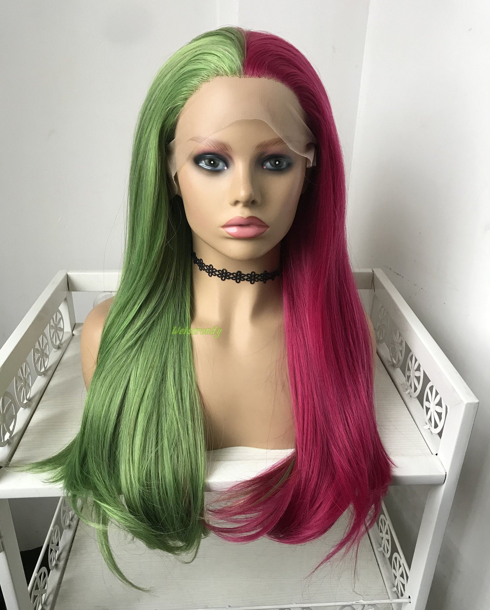 Half and Half Mixed Green Pink Long Straight Hair Premium Synthetic Lace Frontal Ombre Wig Multi Part