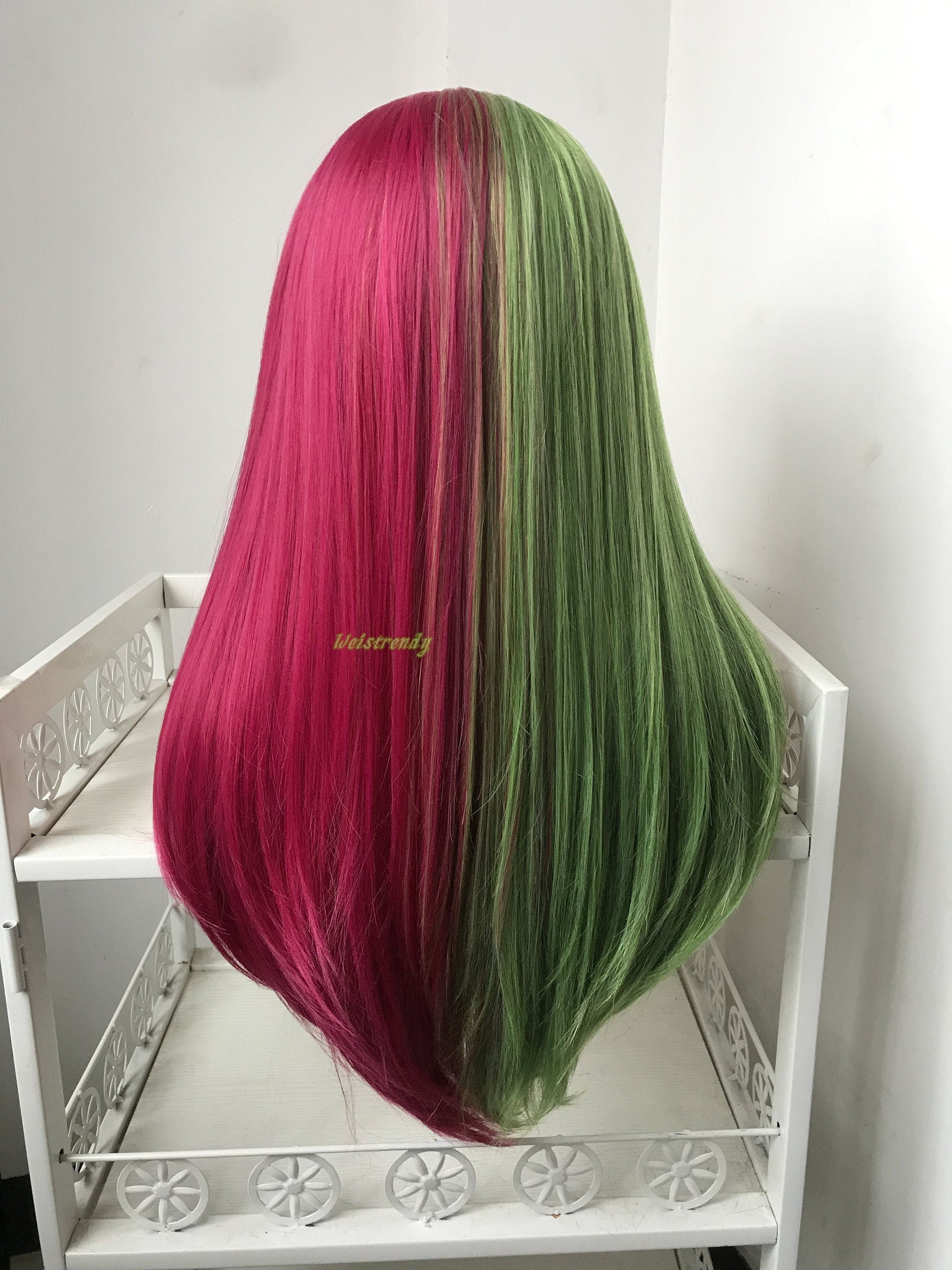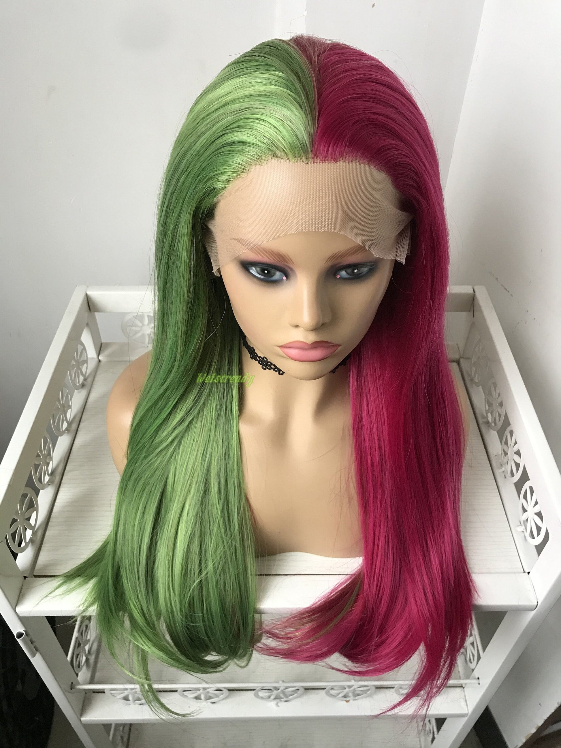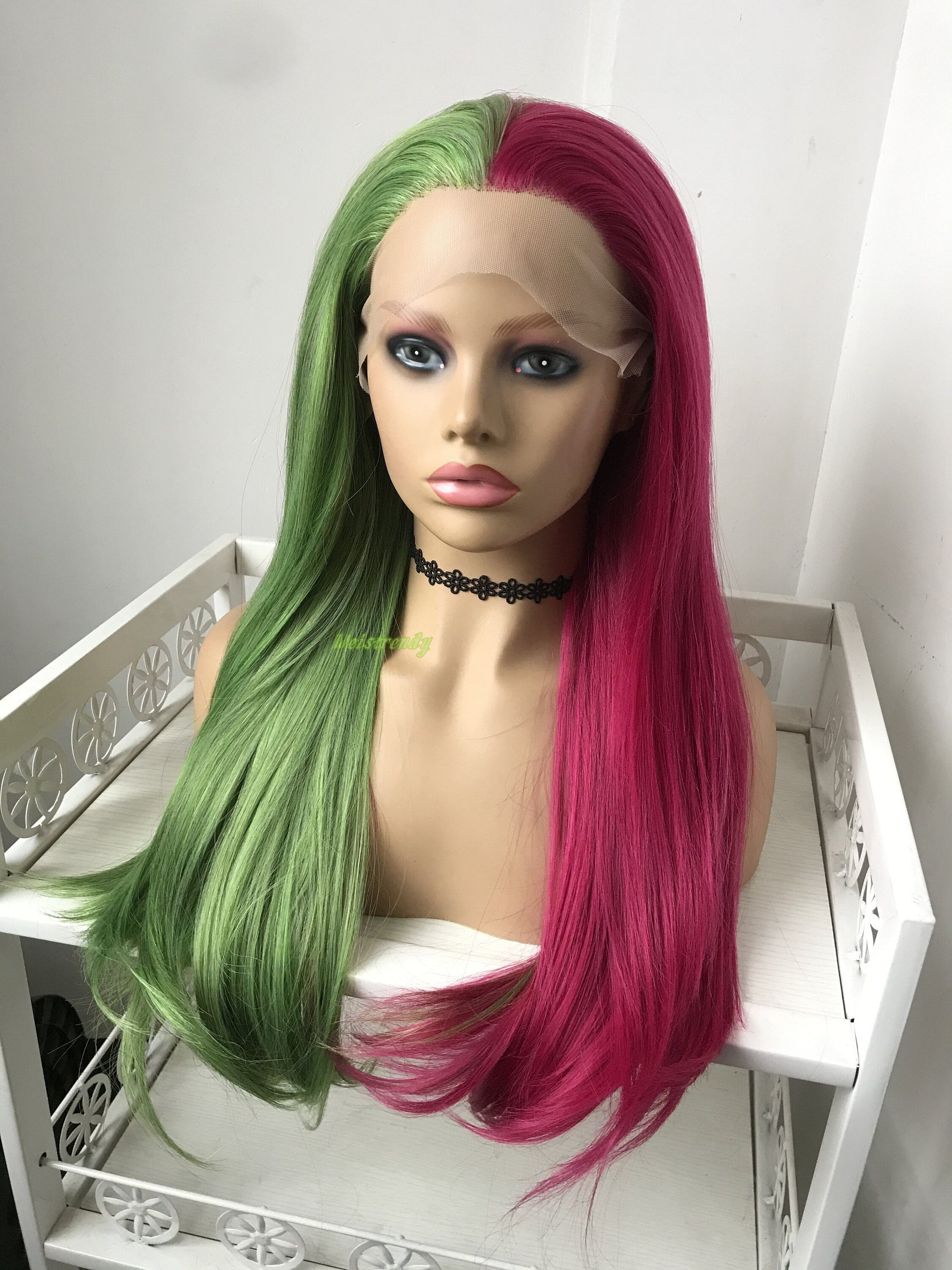 Half and Half Mixed Green Pink Long Straight Hair Premium Synthetic Lace Frontal Ombre Wig Multi Part