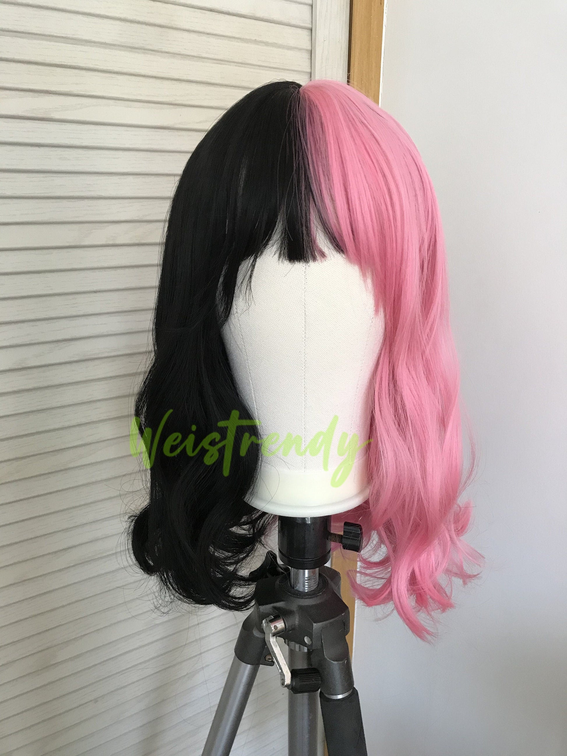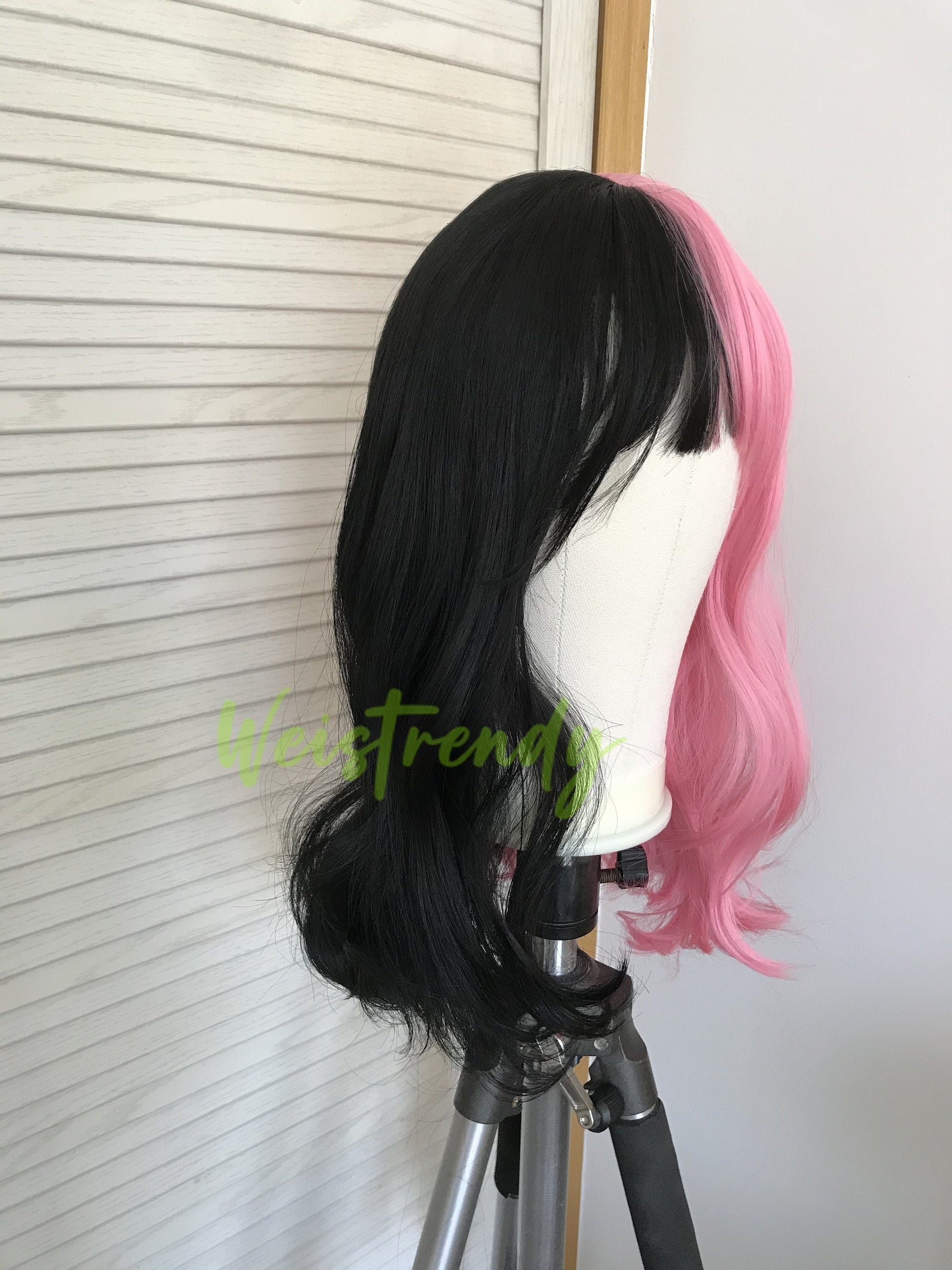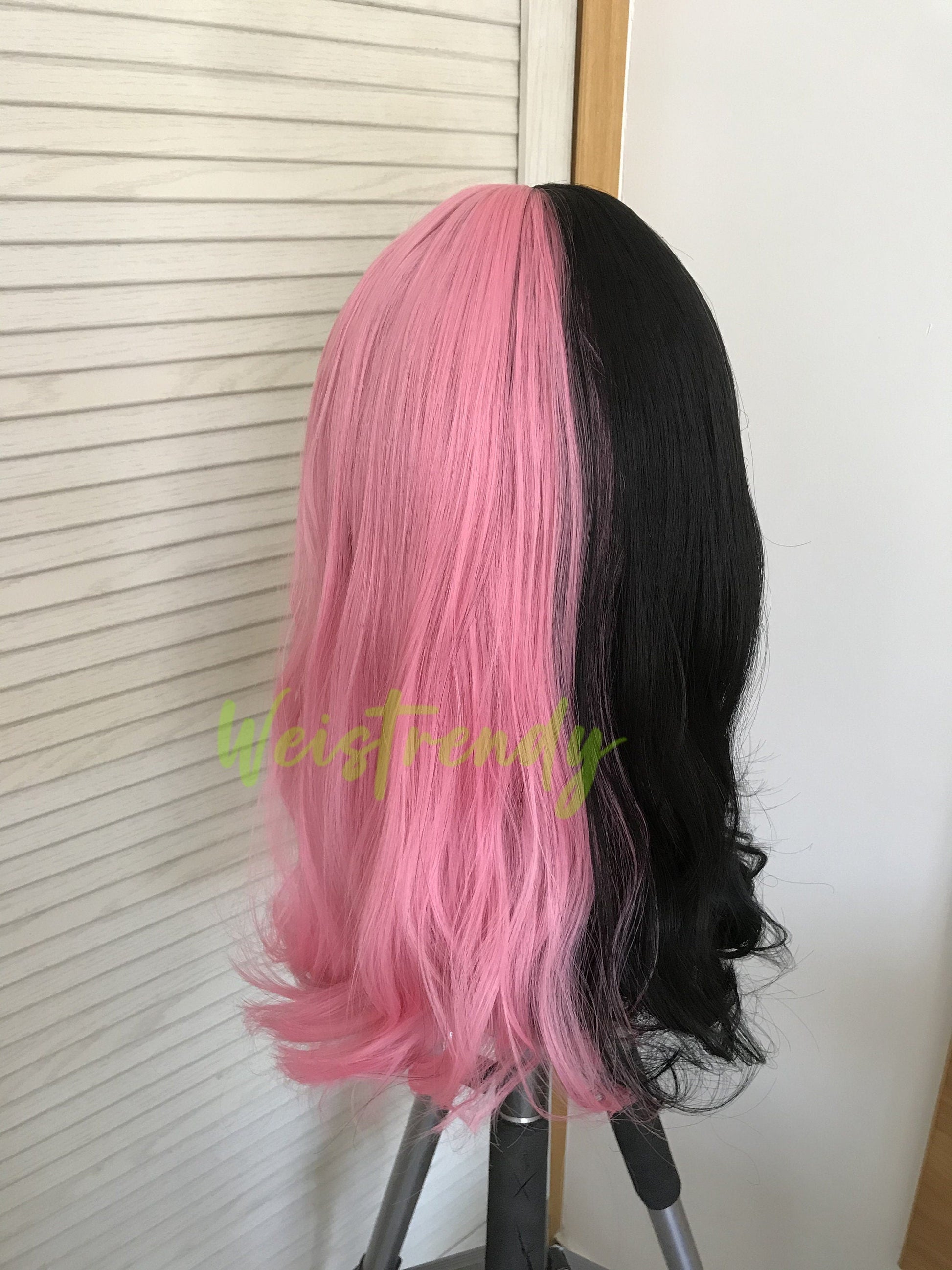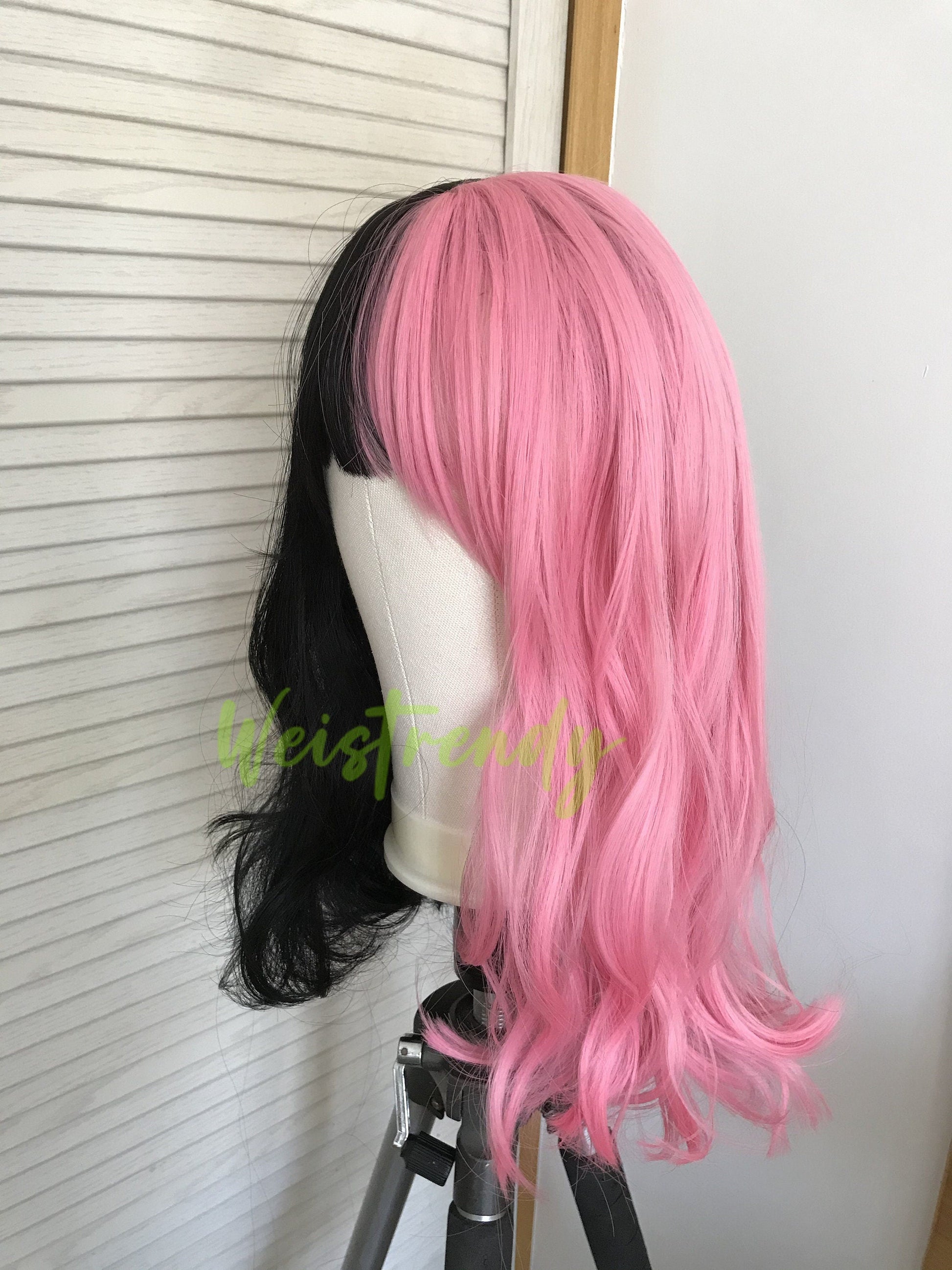 Half and Half Pink Black 16in Body Wave Hair Premium Synthetic No Lace Wig with Bangs Heat Ok