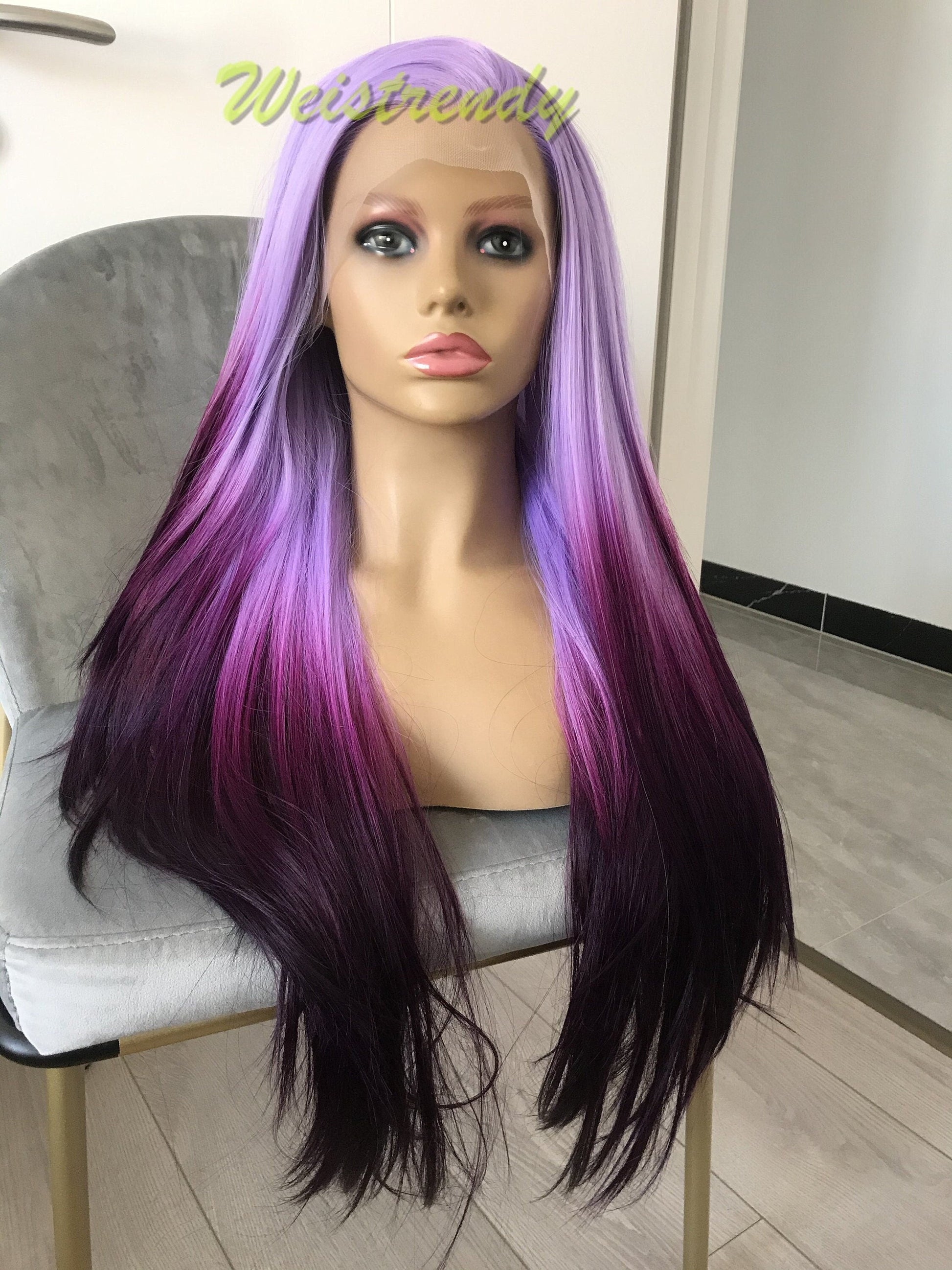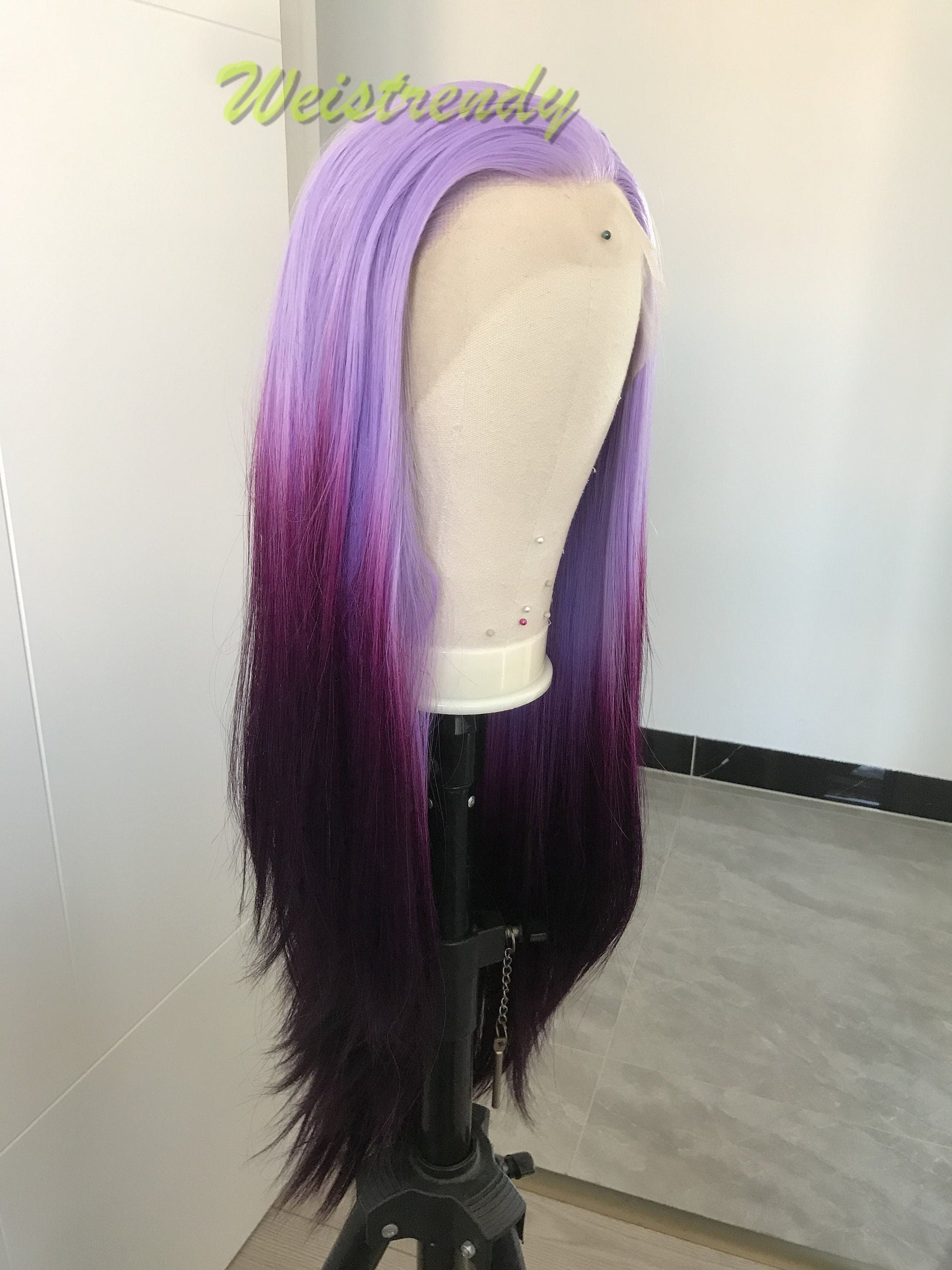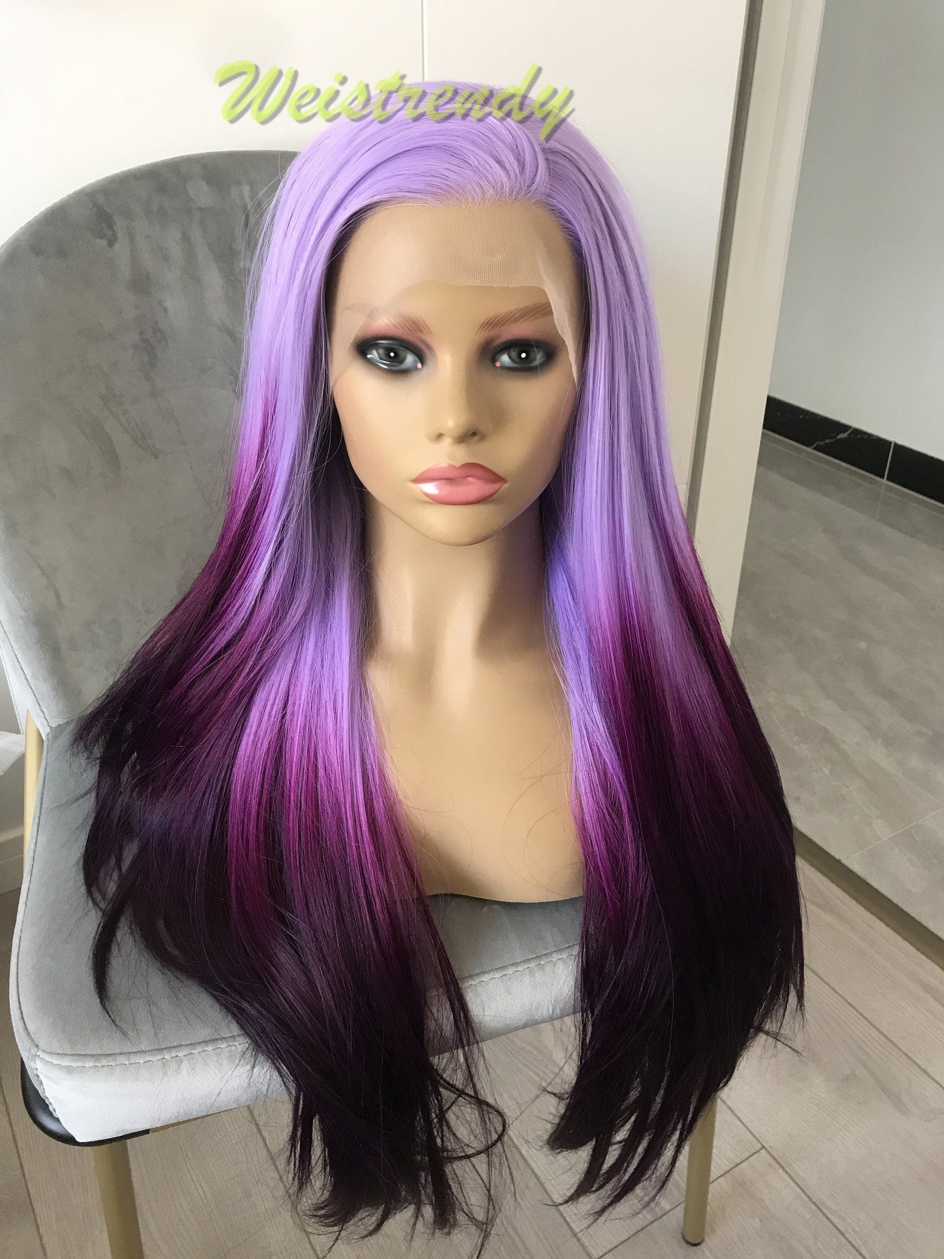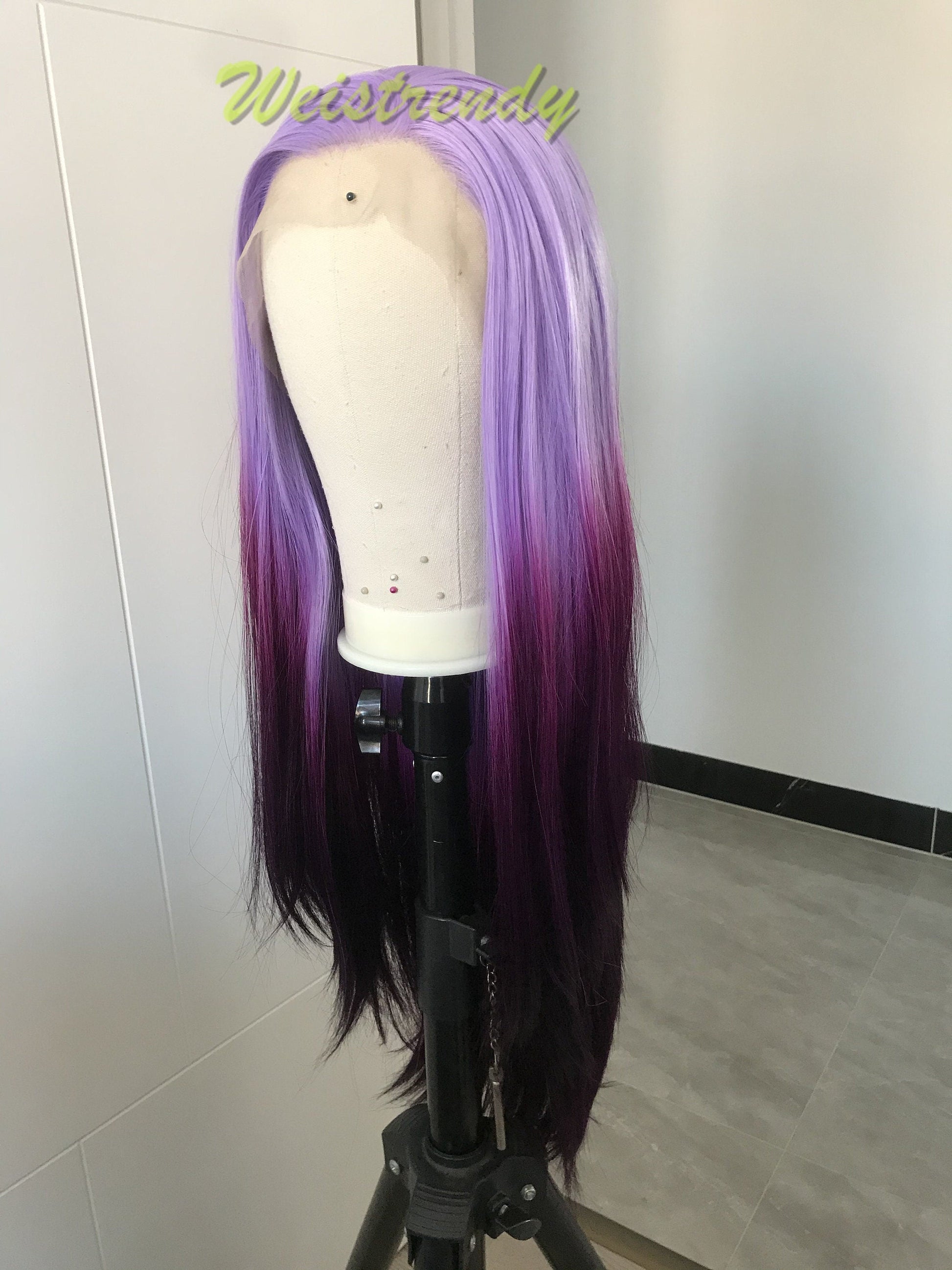 Inspired by Morning Glory Lilac into Dark purple Ombre Wigs Long Straight hairstyle wigs Synthetic Swiss Lace frontal Wigs Heat Safe