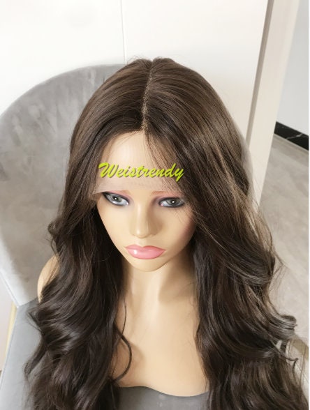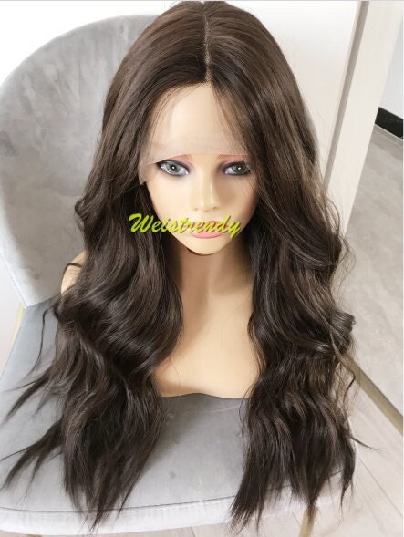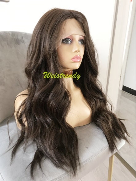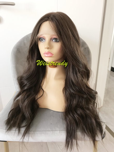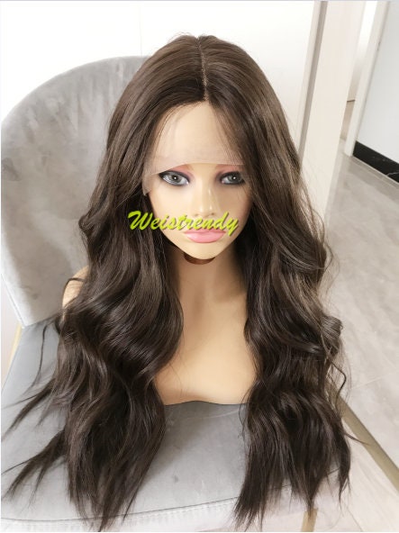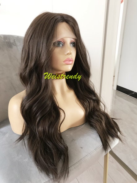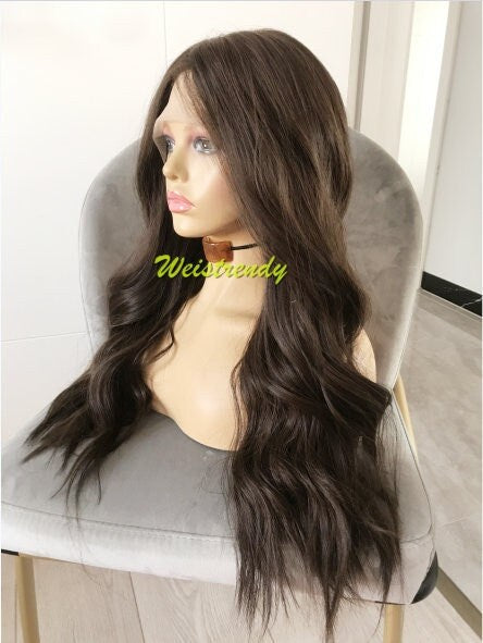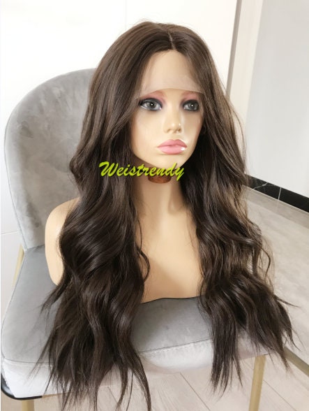 Light Weight Dark Brown Loose Wavy Long Straight Layered Centre Part Premium Synthetic Soft Swiss Lace Wig 6" Deep Part