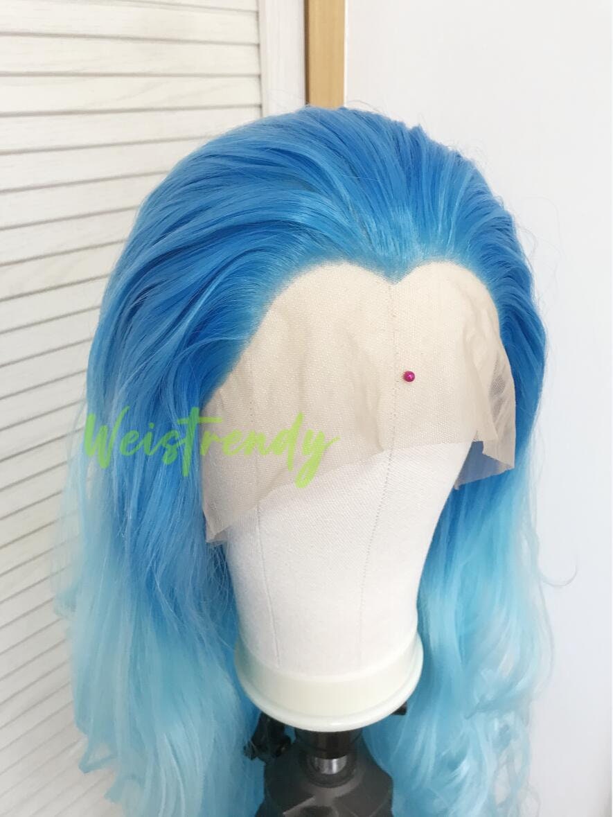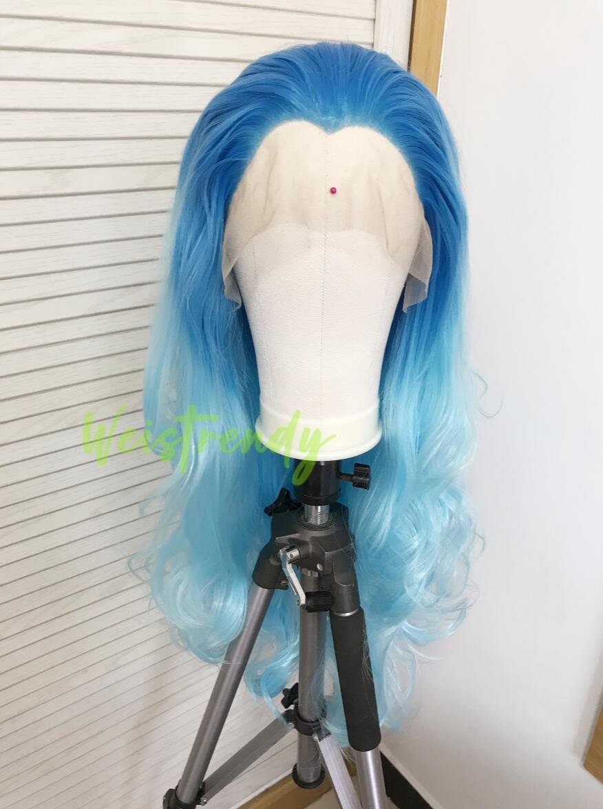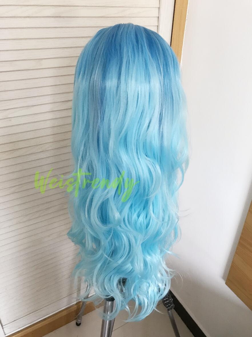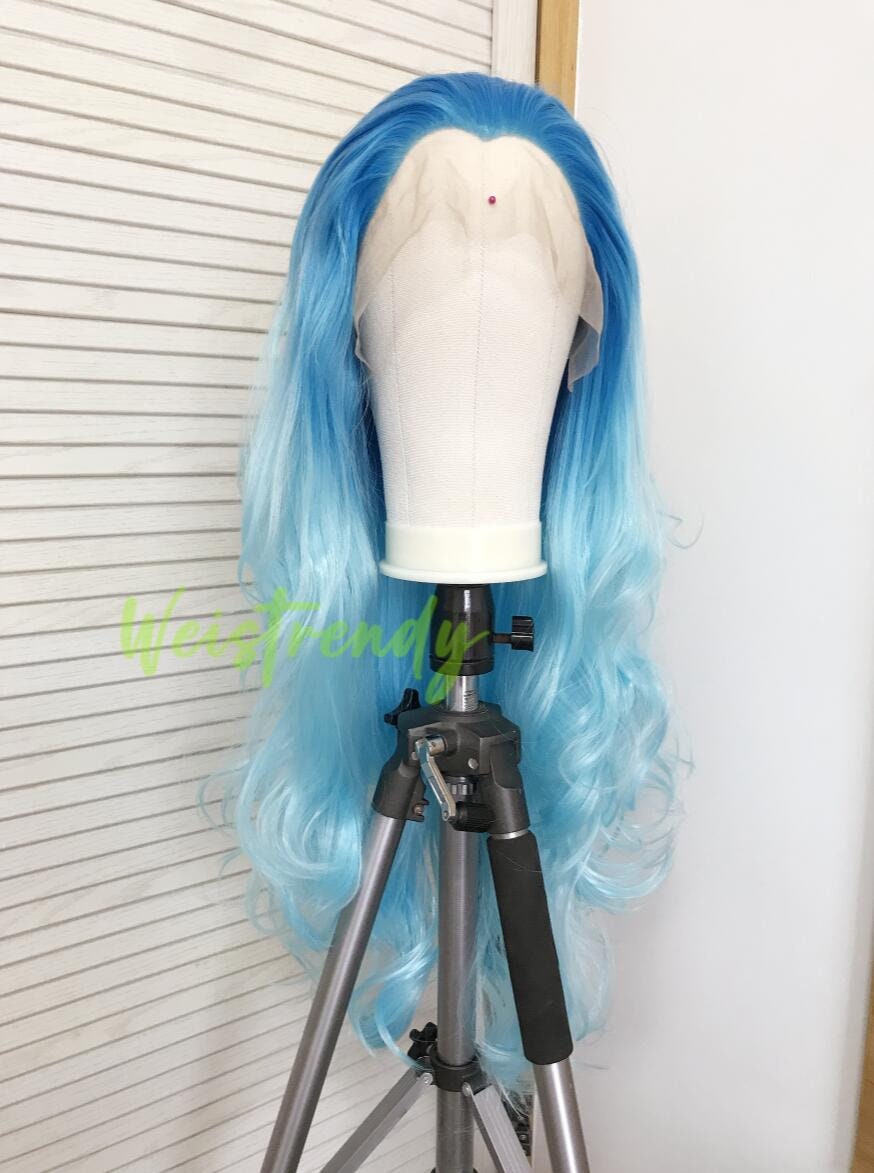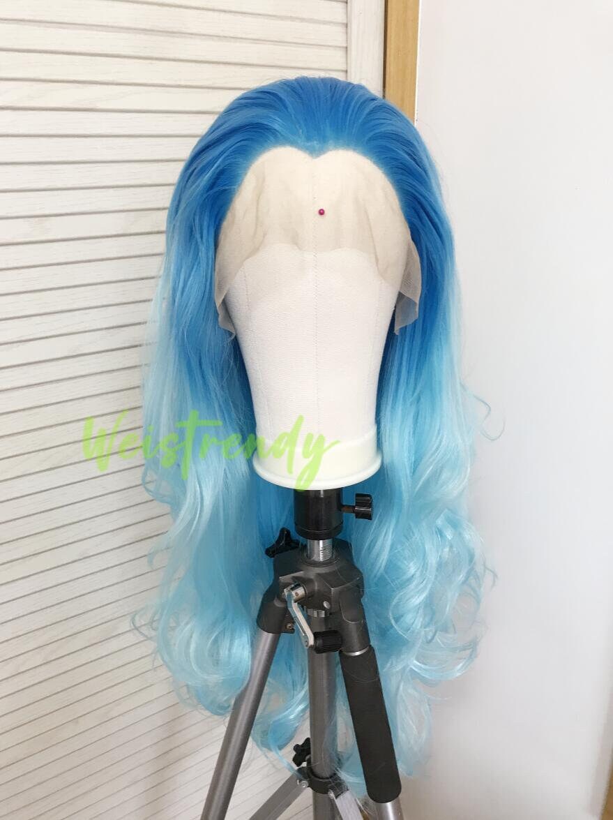 Medium Blue to Light Blue Ombré Long Curls Wavy Hair Wigs Premium Synthetic Lace Front Wigs Heat Freindly