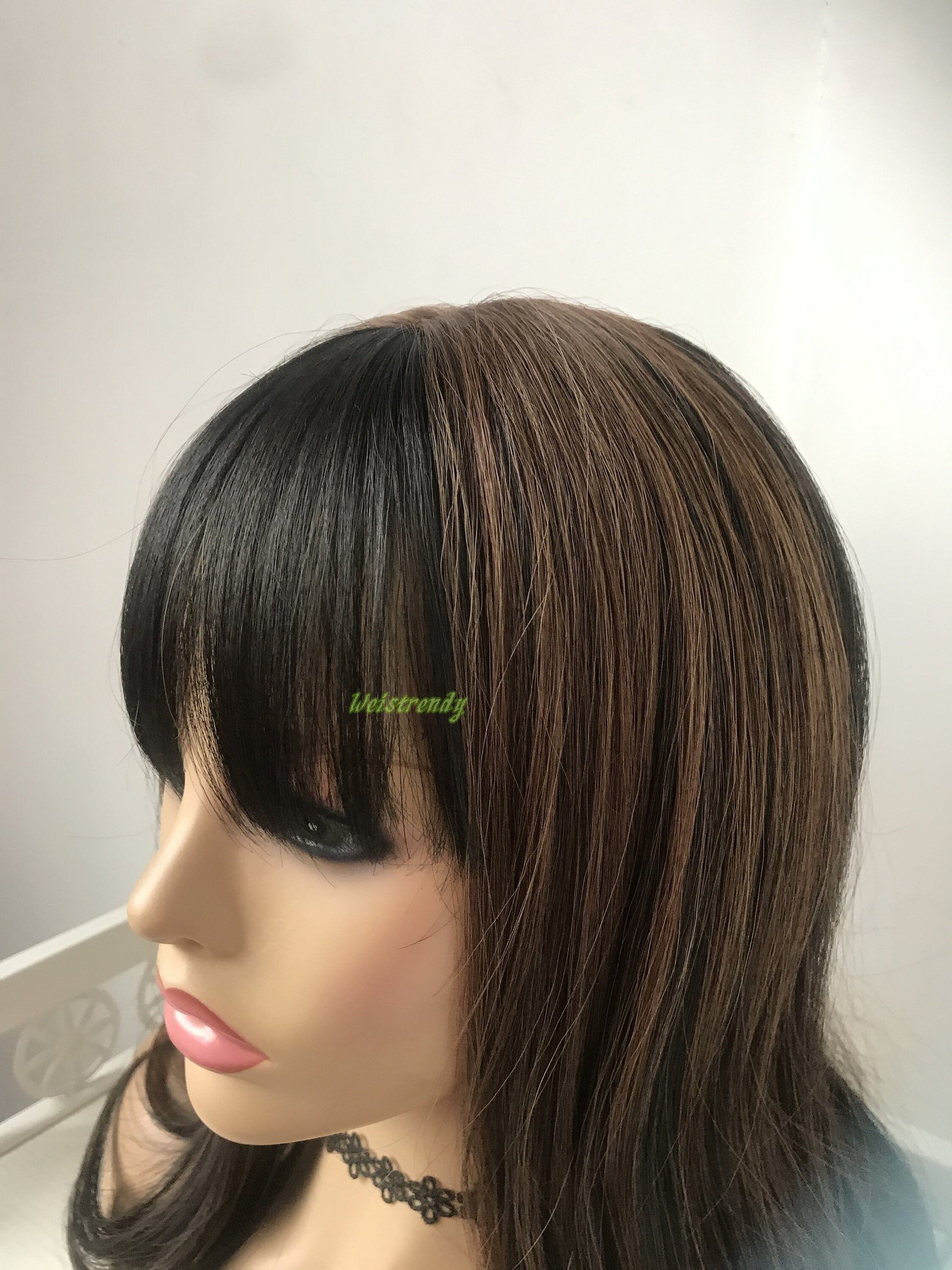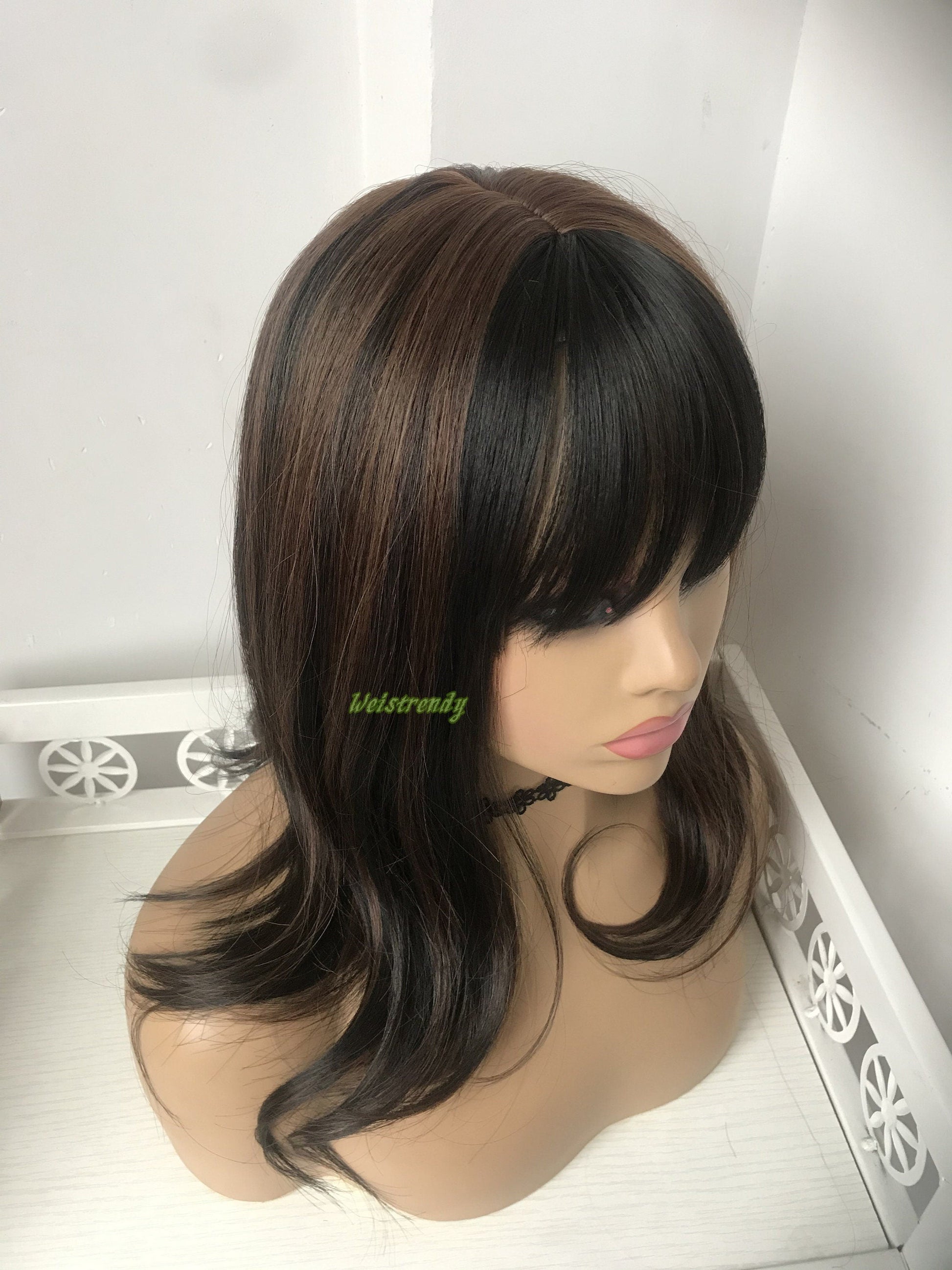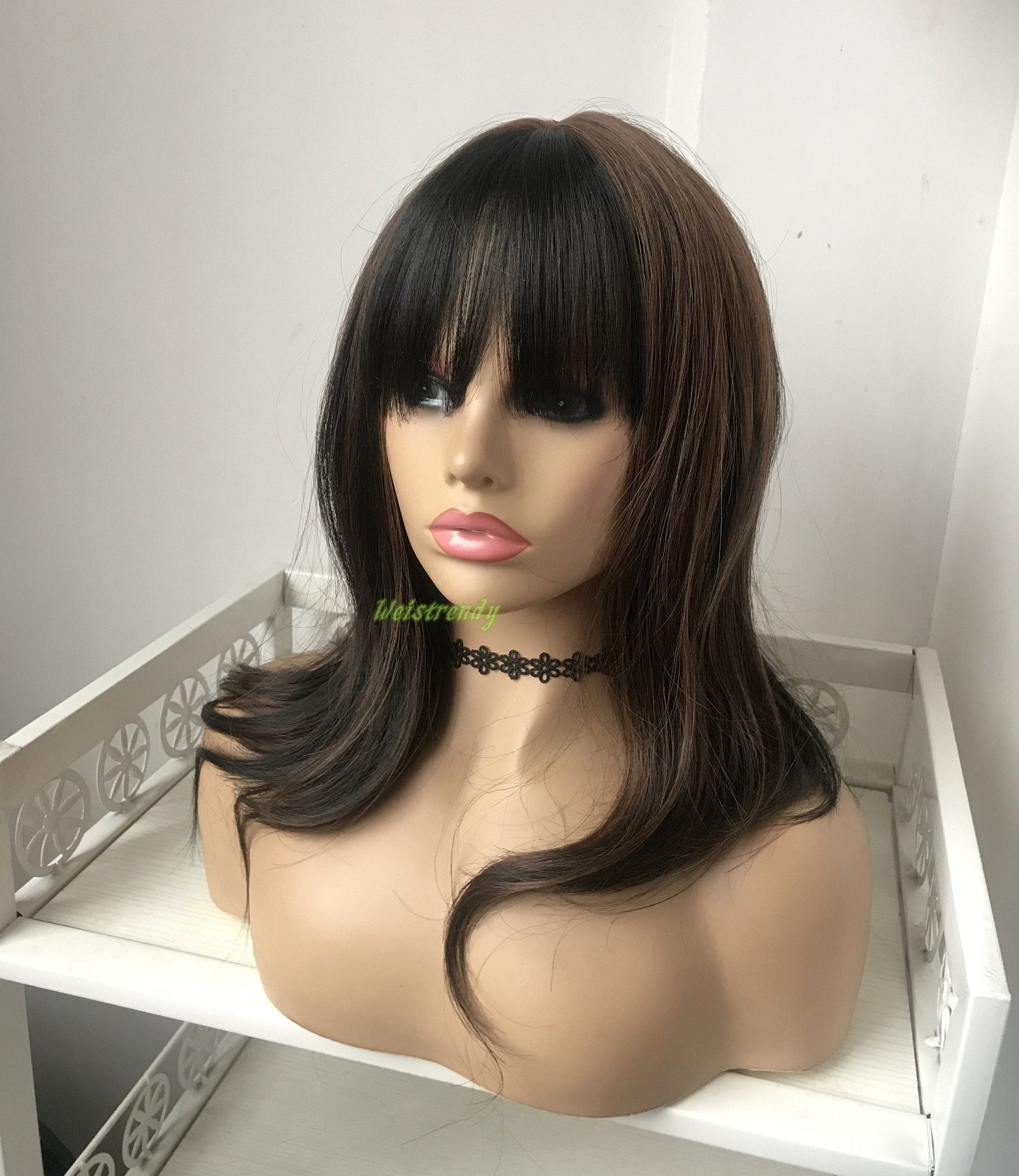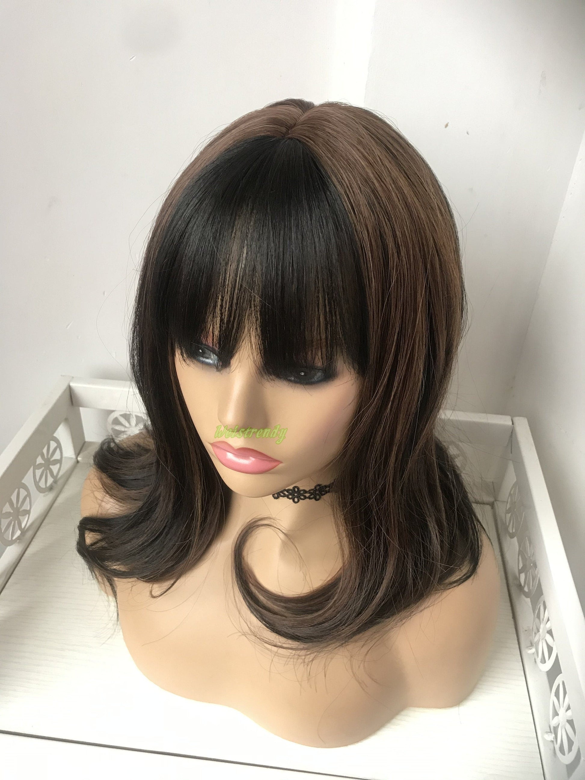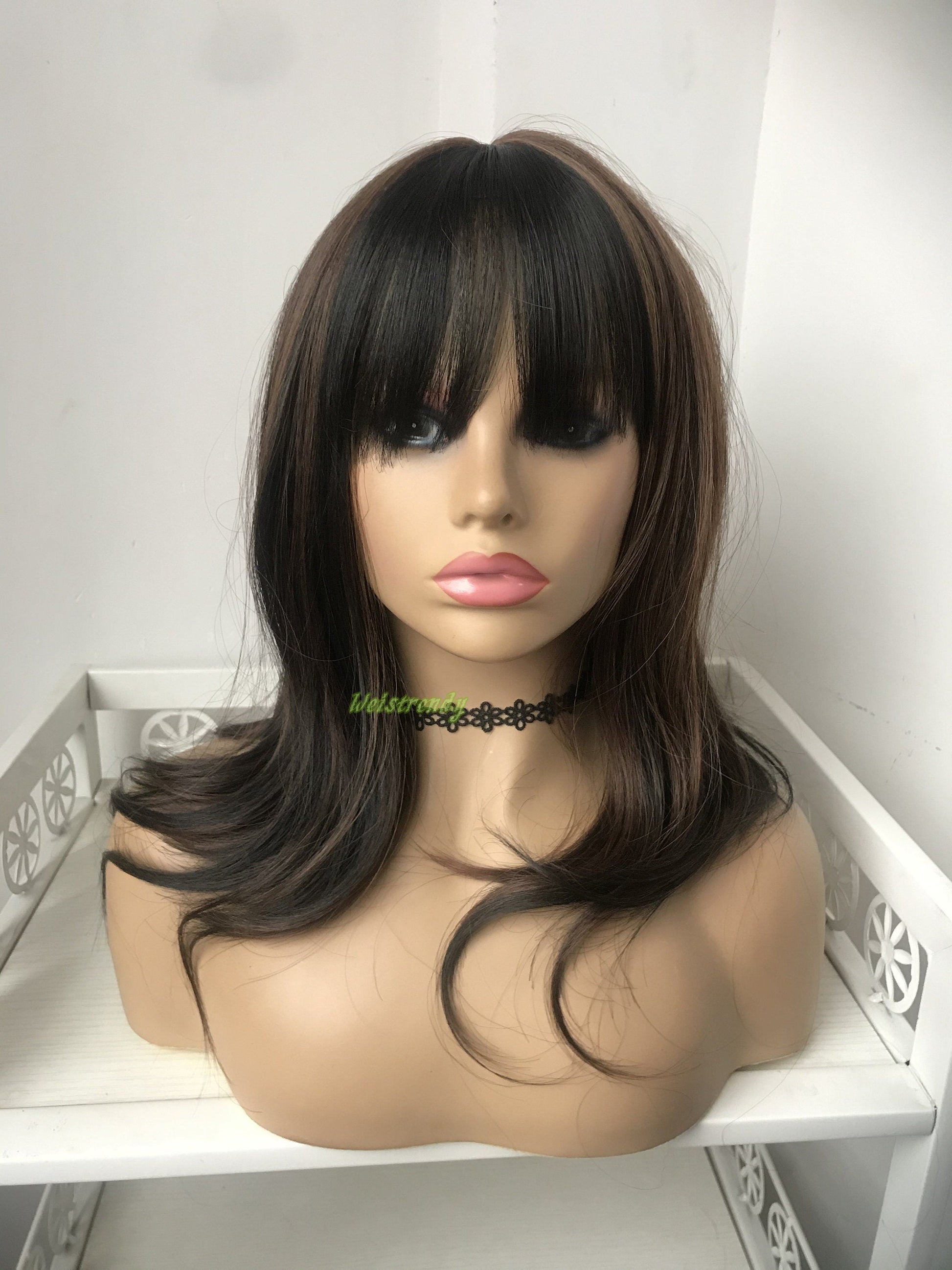 Mixed Black Brown Medium Length Straight Curl | Bangs/Fringe | Premium Synthetic Heat Safe Fibre Full cap Wig Realistic Wigs