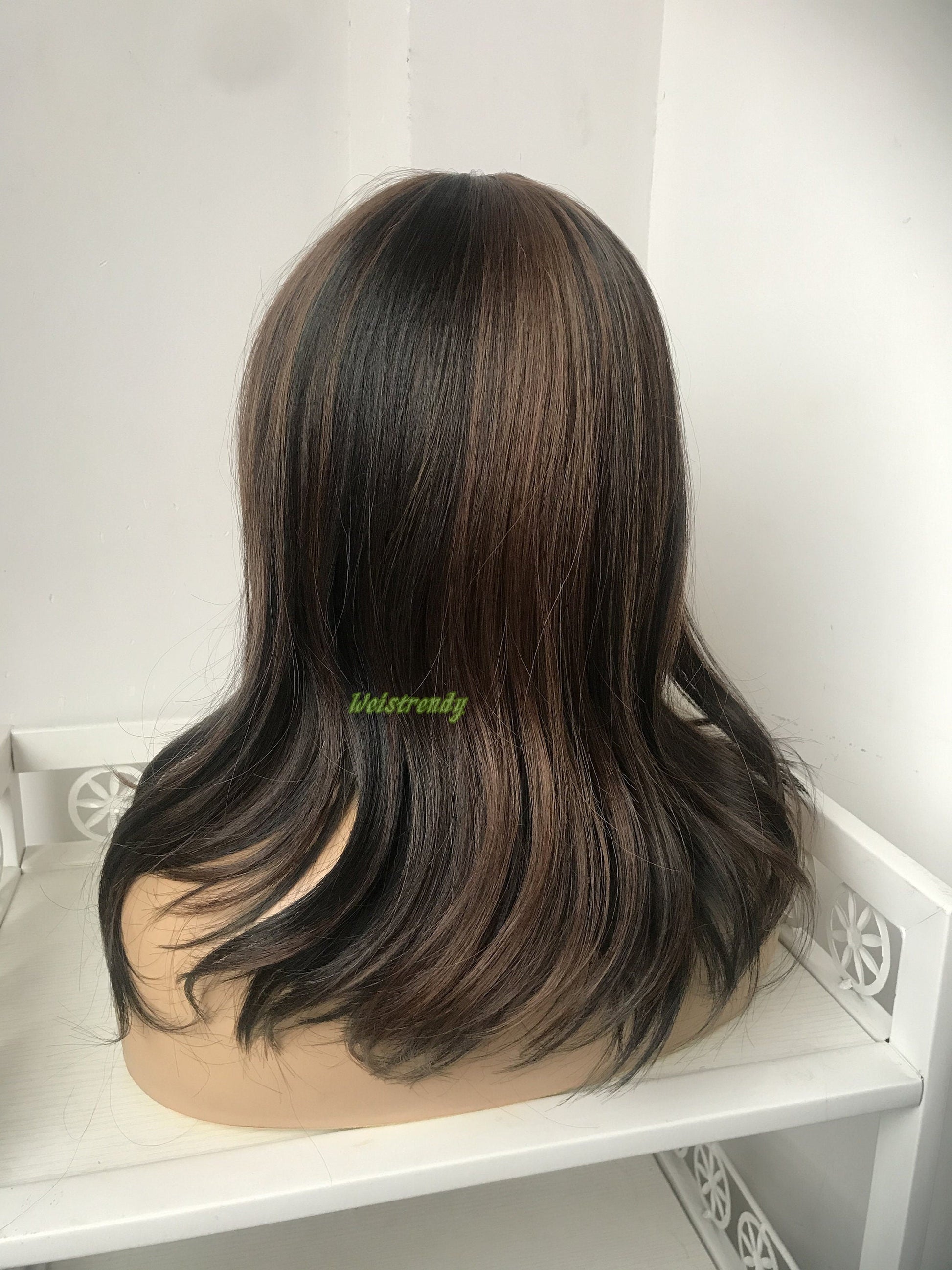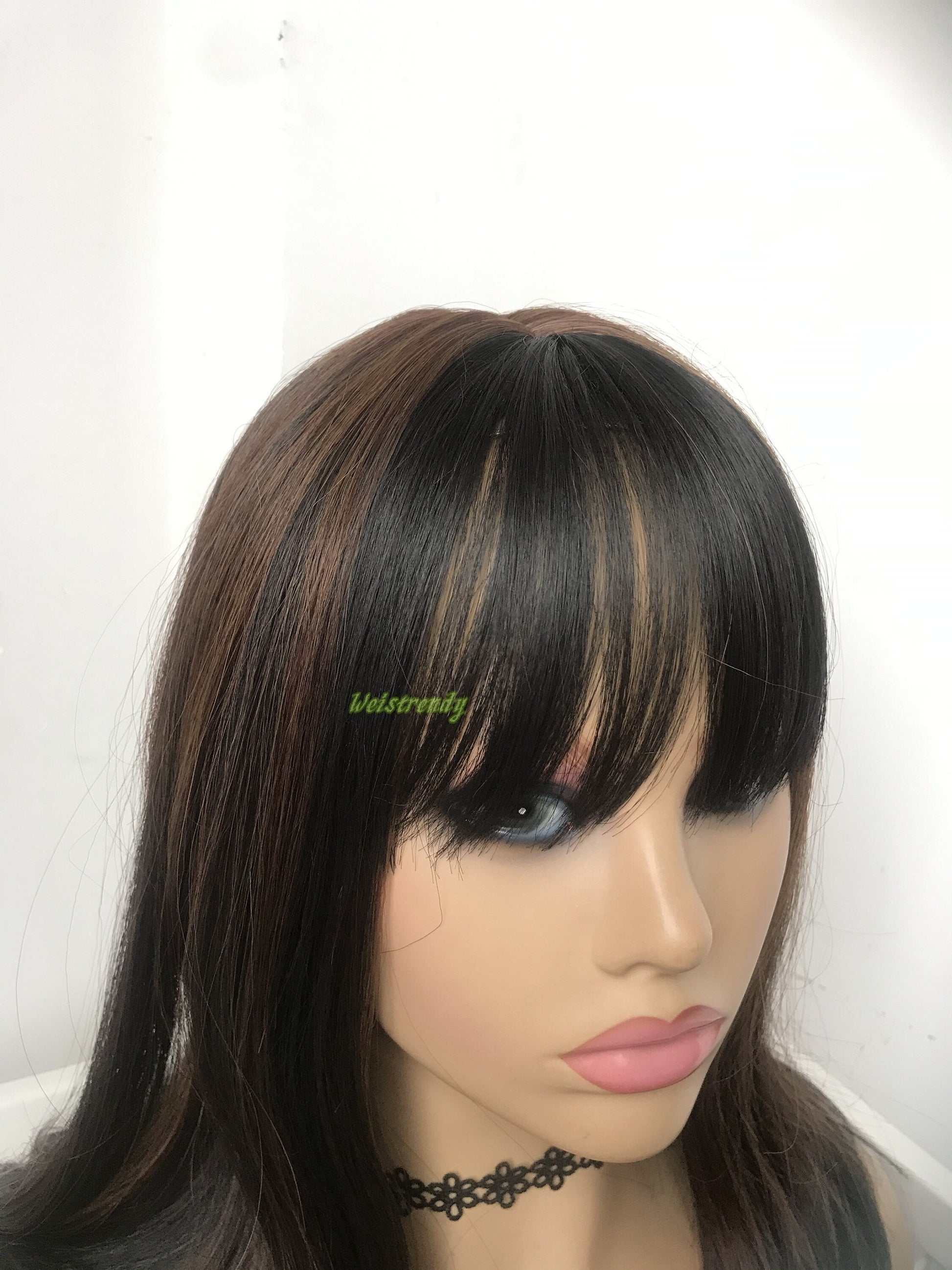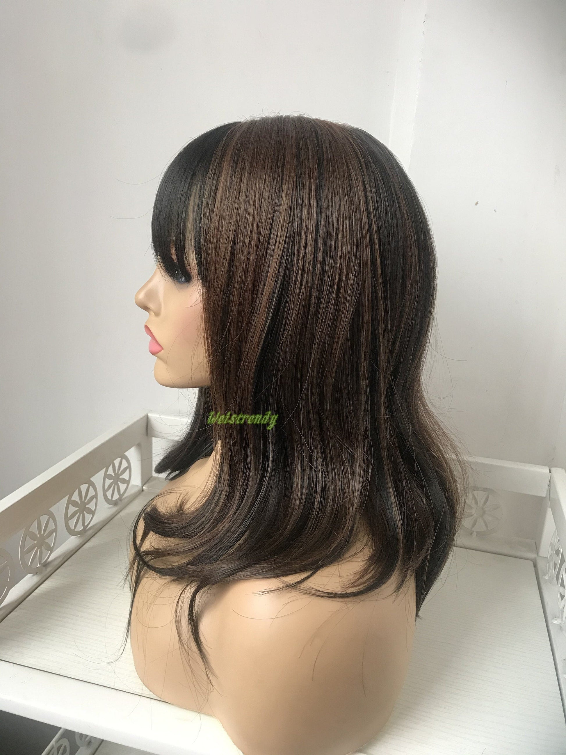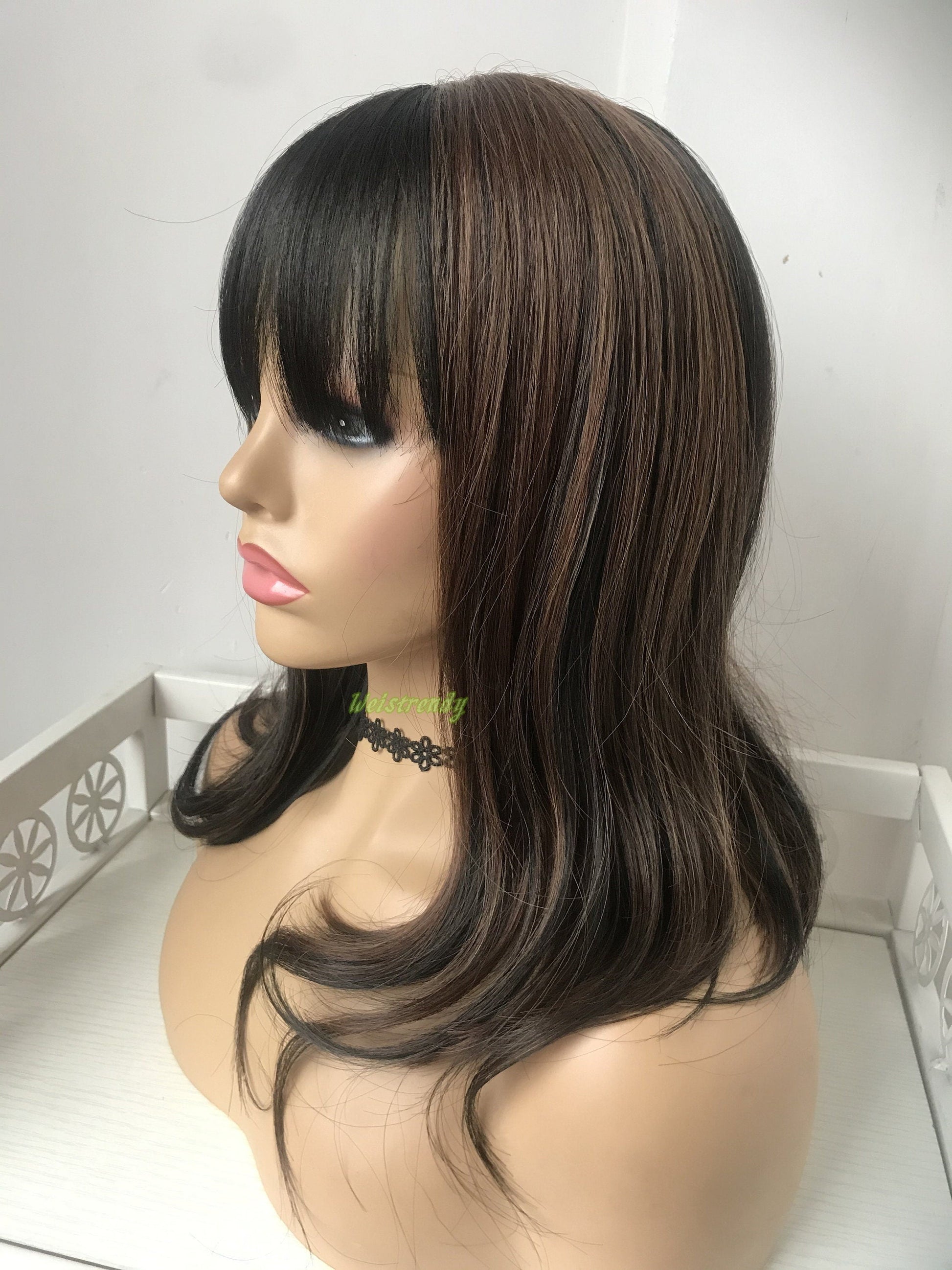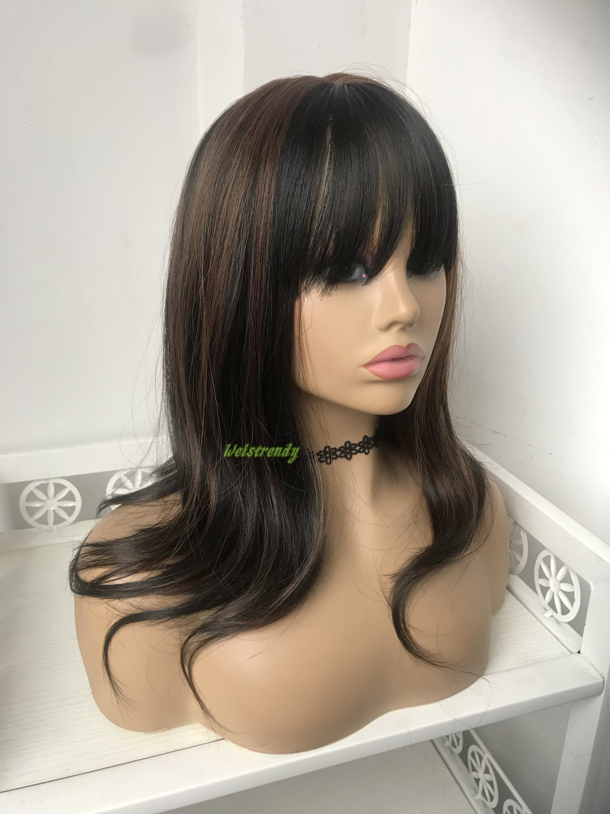 Mixed Black Brown Medium Length Straight Curl | Bangs/Fringe | Premium Synthetic Heat Safe Fibre Full cap Wig Realistic Wigs