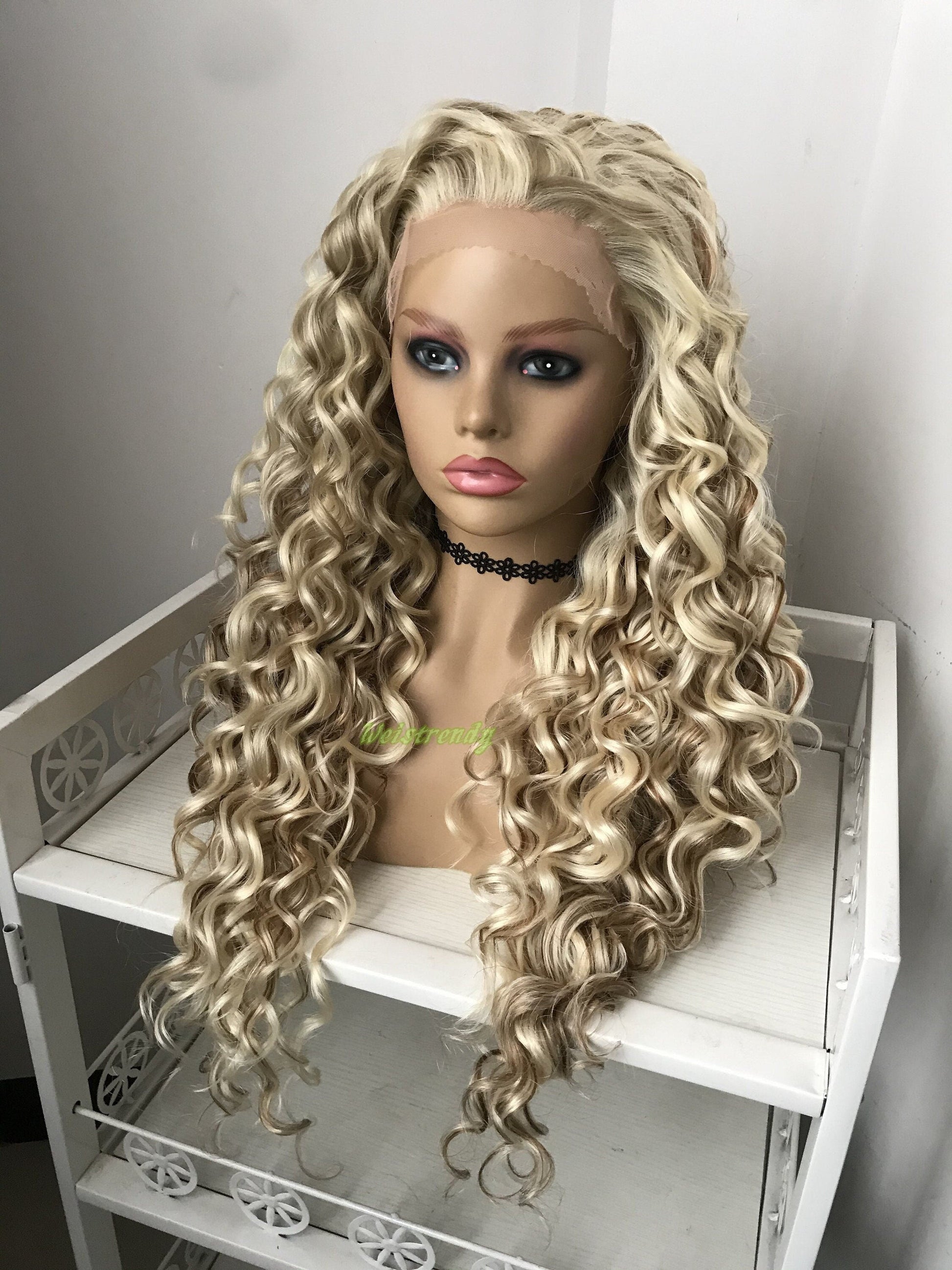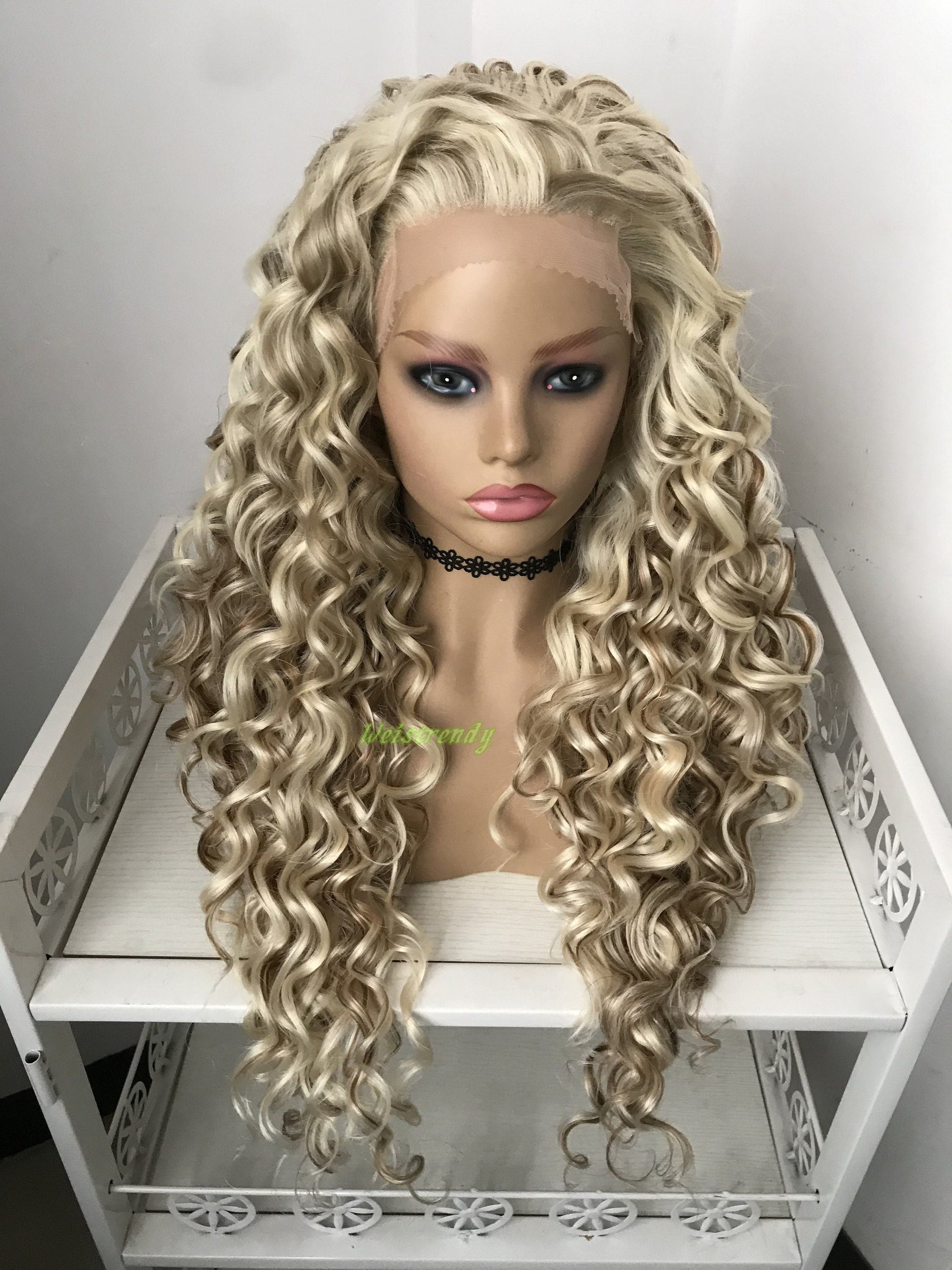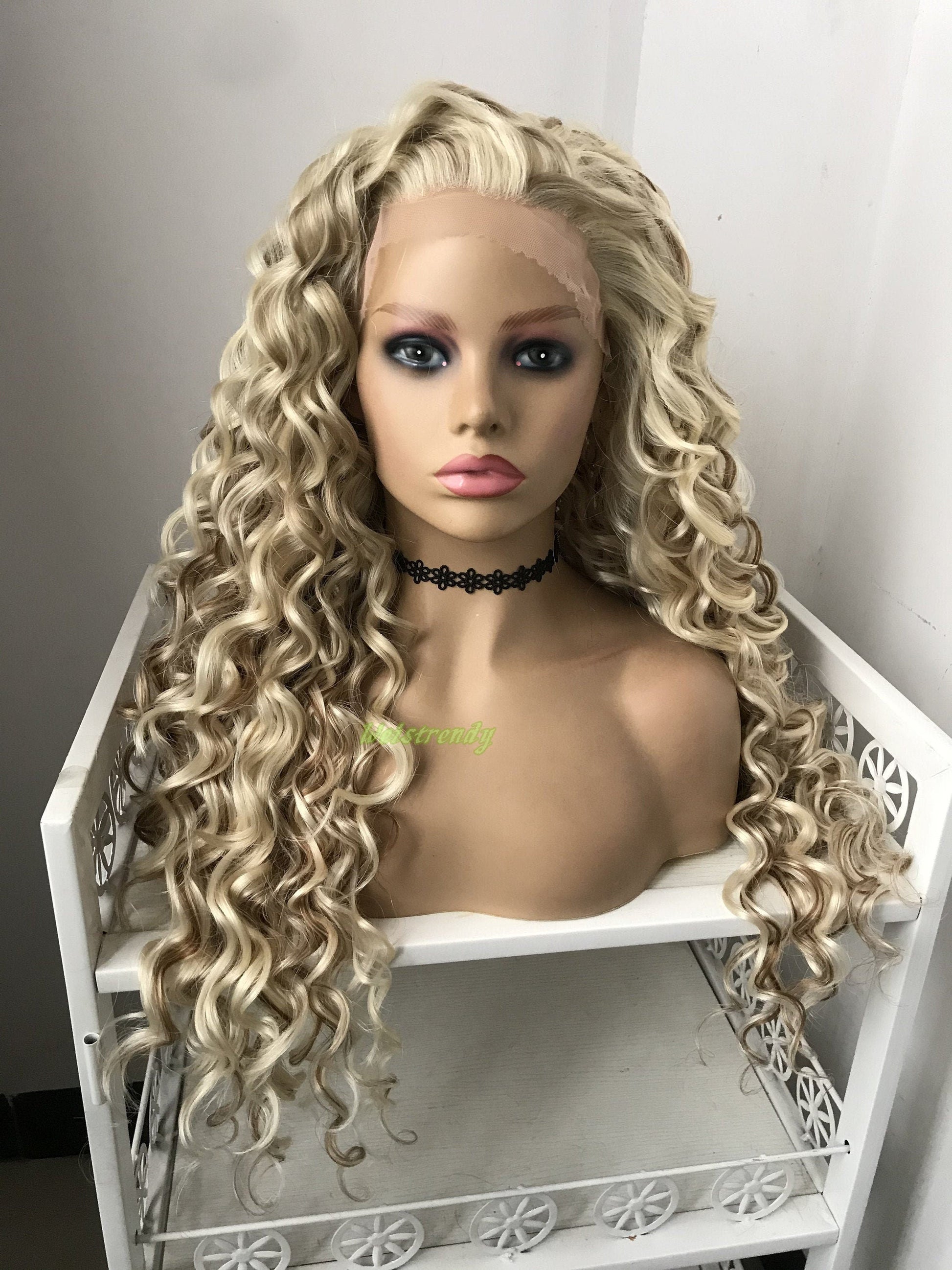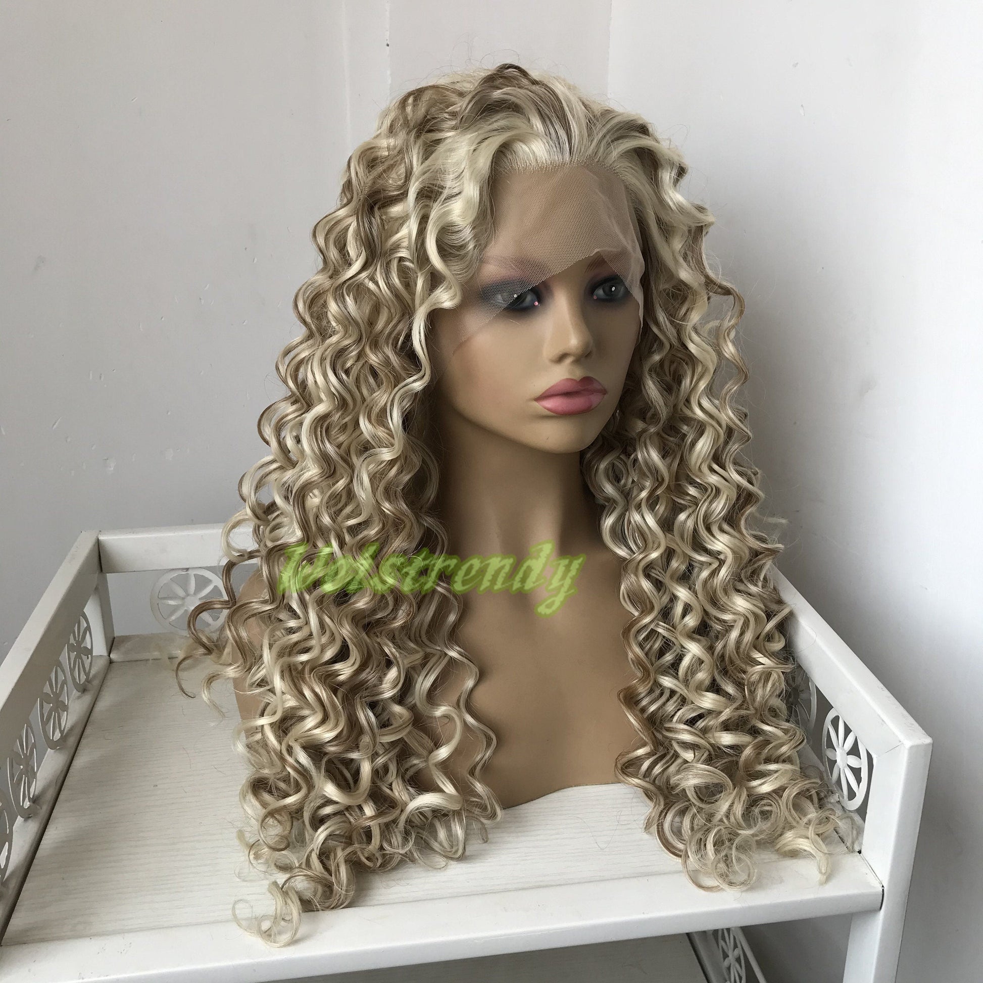 Mixed Blonde Brown Long Ring Curls Wigs Premium Synthetic Fibre Heat Safe Glueless Lace Frontal Wig