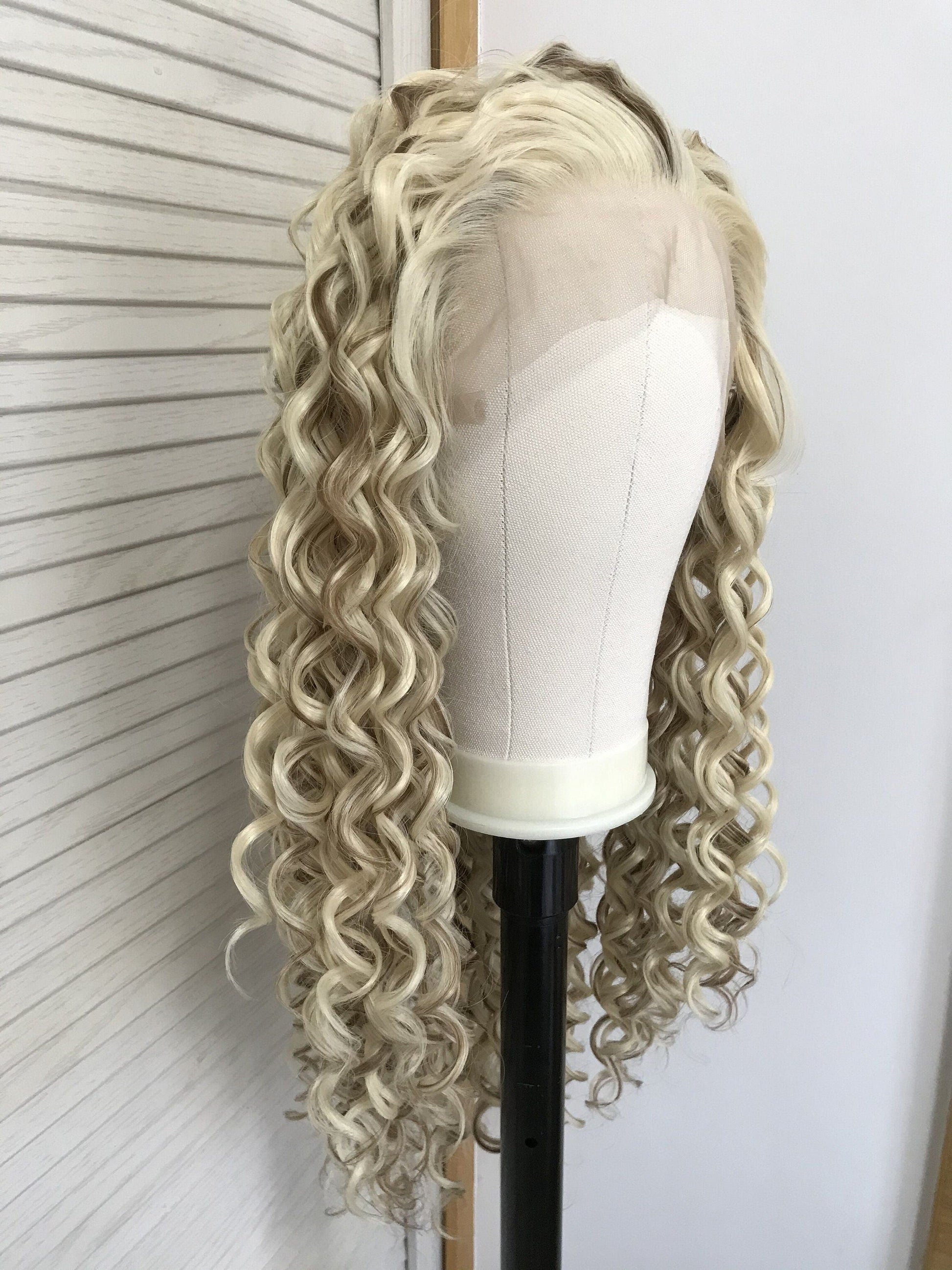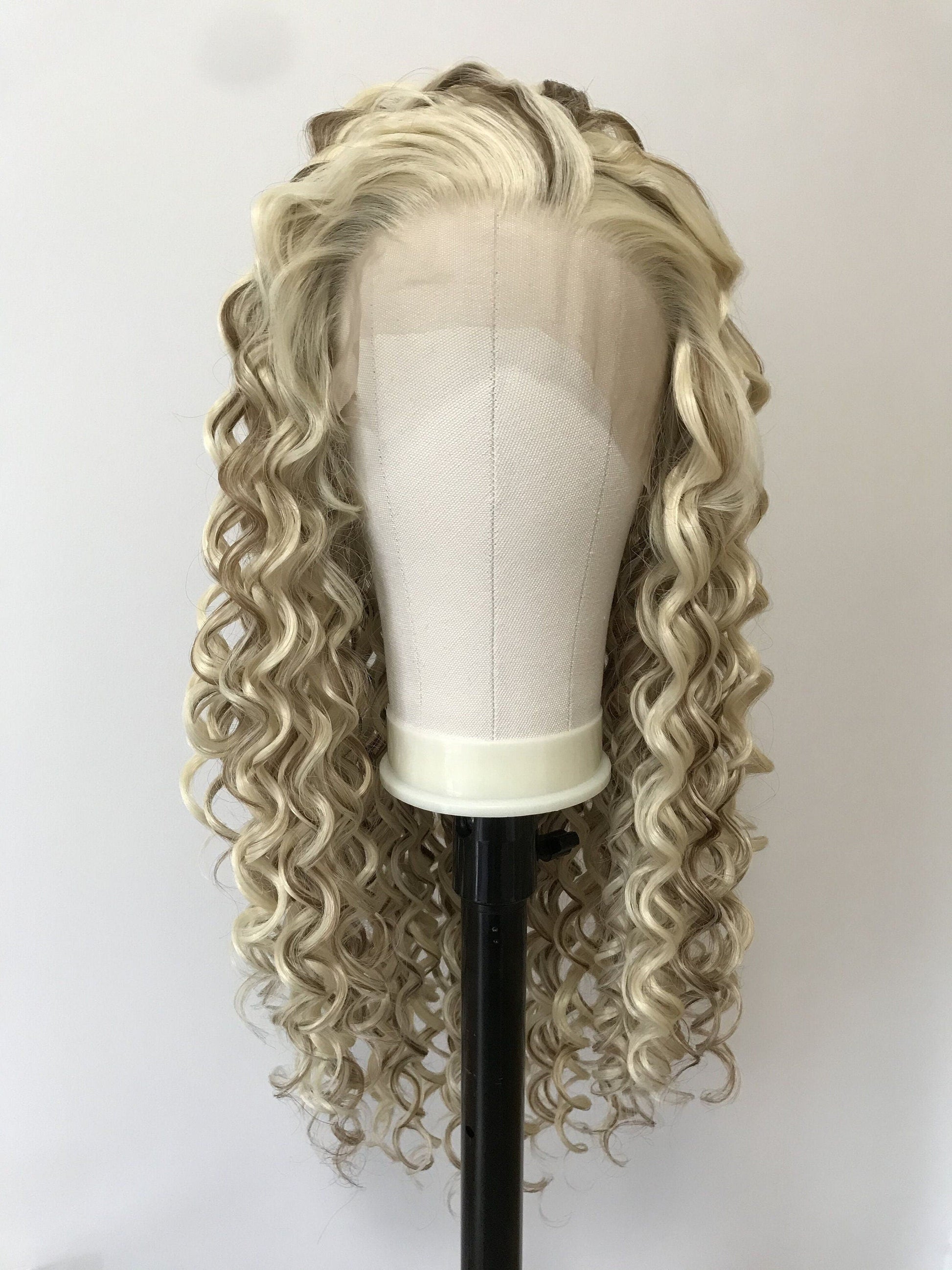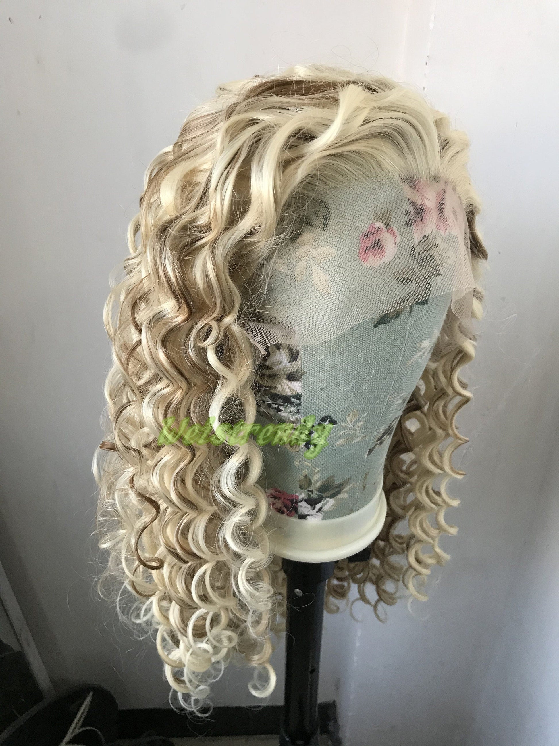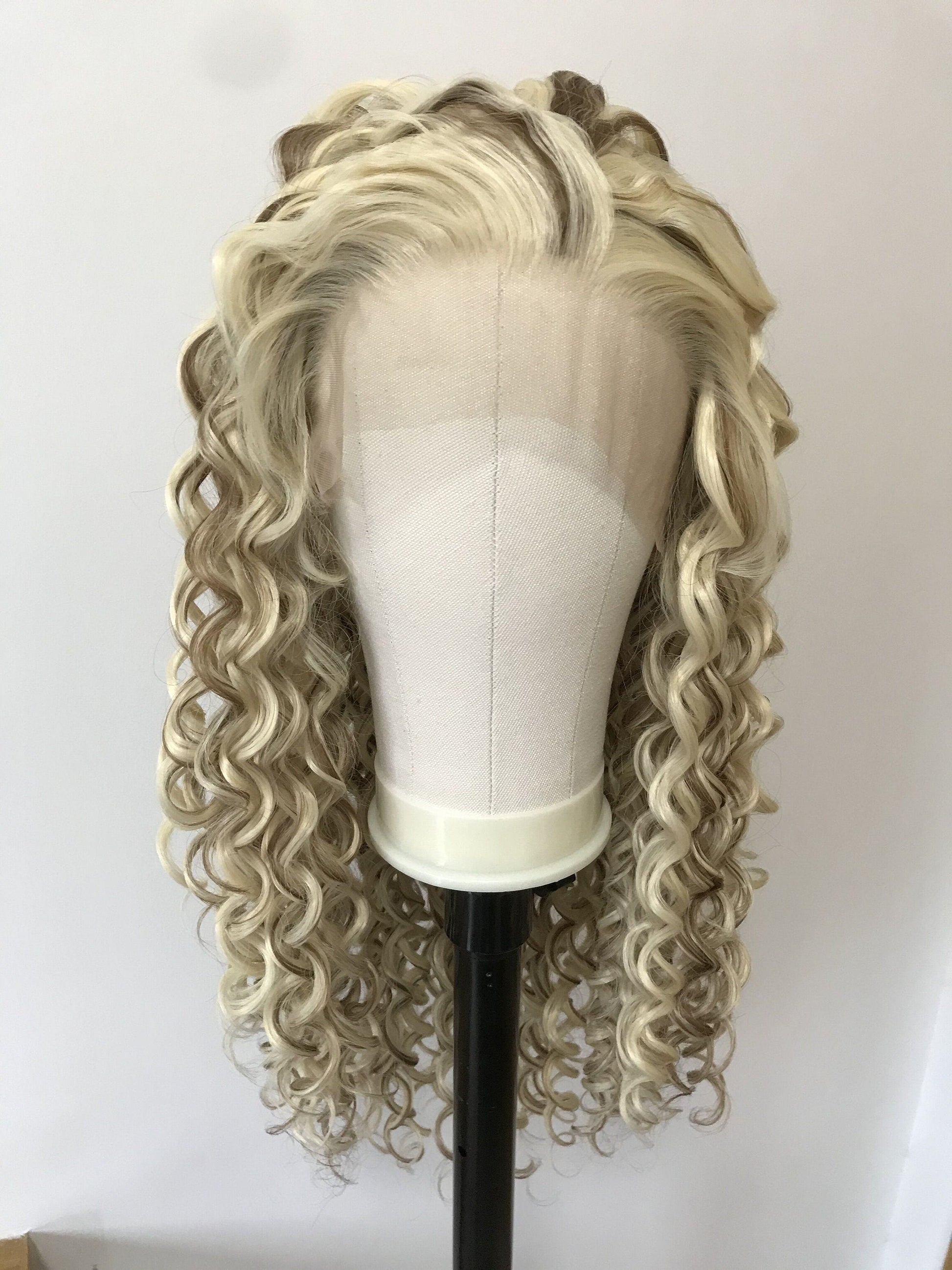 Mixed Blonde Brown Long Ring Curls Wigs Premium Synthetic Fibre Heat Safe Glueless Lace Frontal Wig