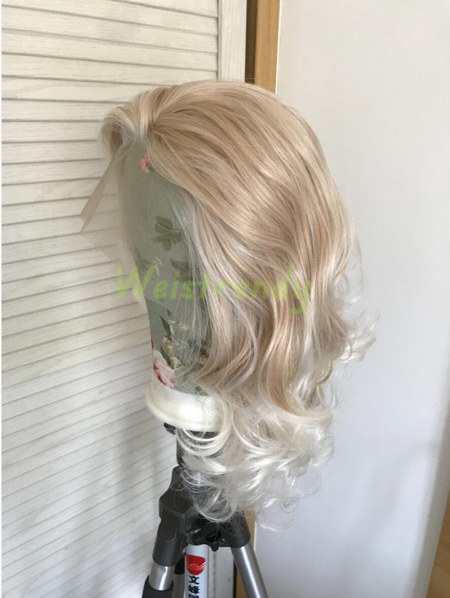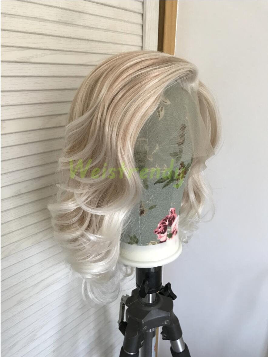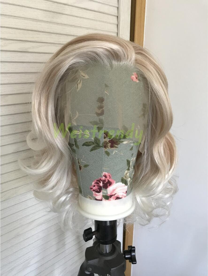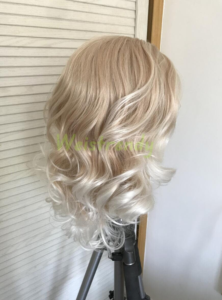 Mixed Blonde Ombre White Blonde Medium Length Curls Wavy Hair with White Frame | Premium Synthetic Lace Front Wig Free Part Heat Safe