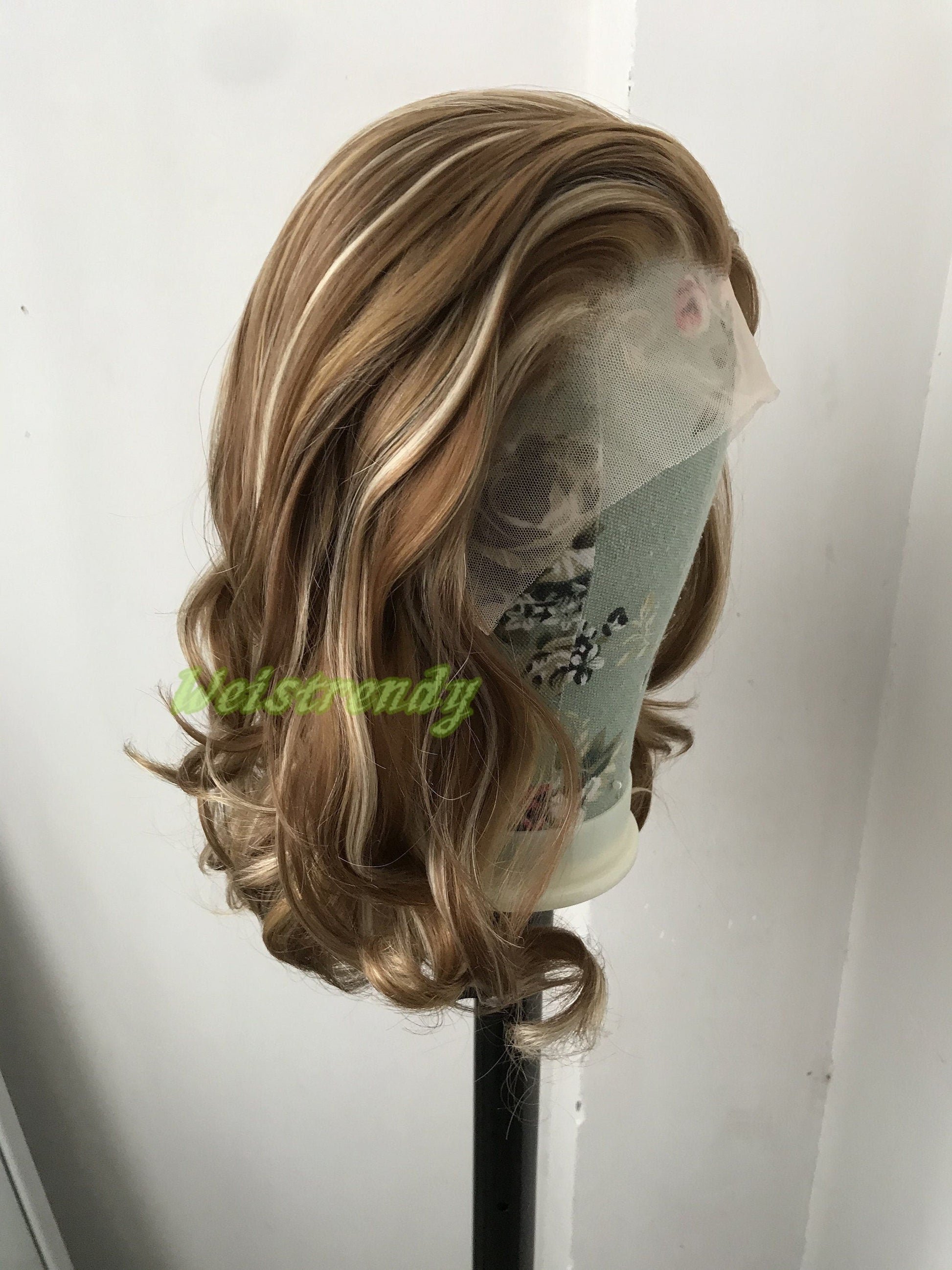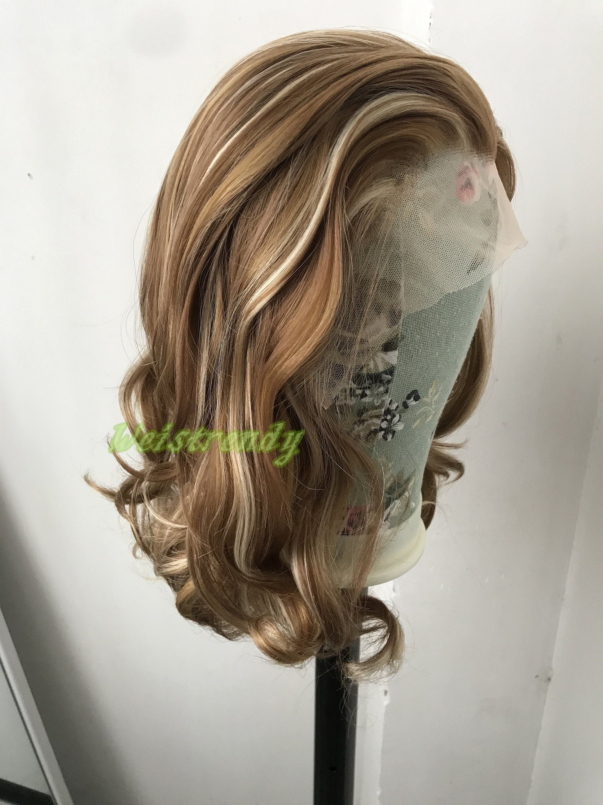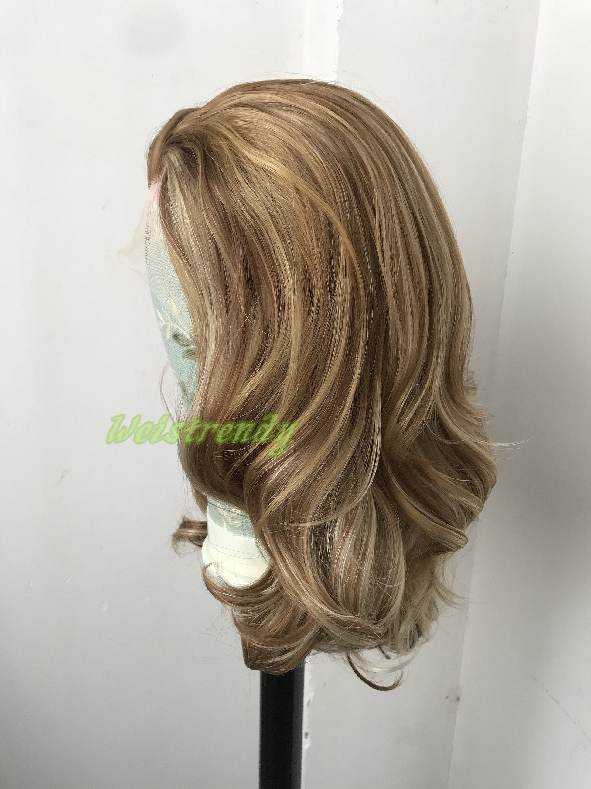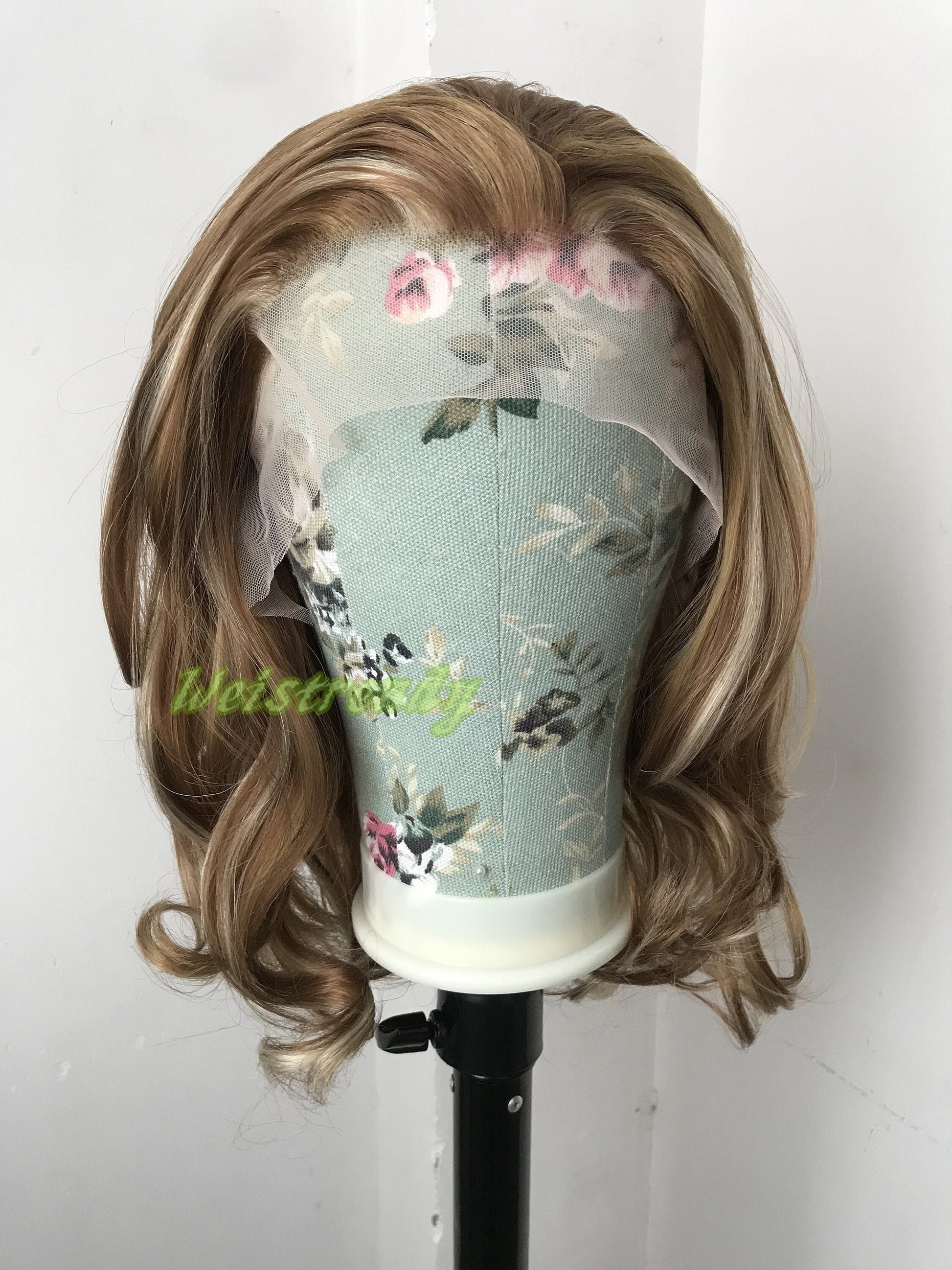 Mixed Brown Blonde Hightlights Medium Length Waves Hair Synthetic Soft Swiss Lace Frontal Wig Free Part Heat Friendly