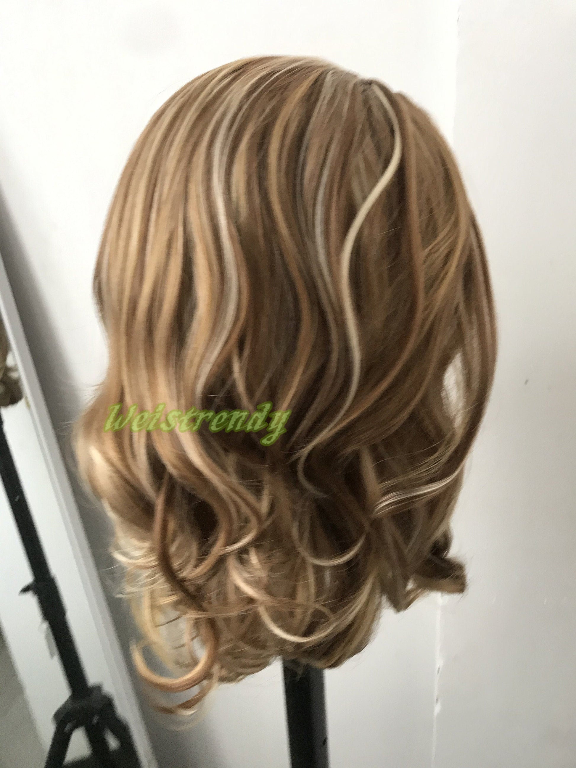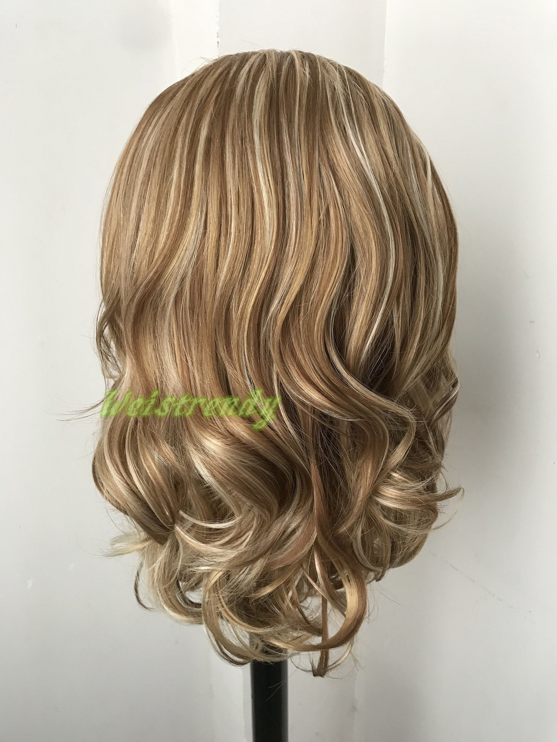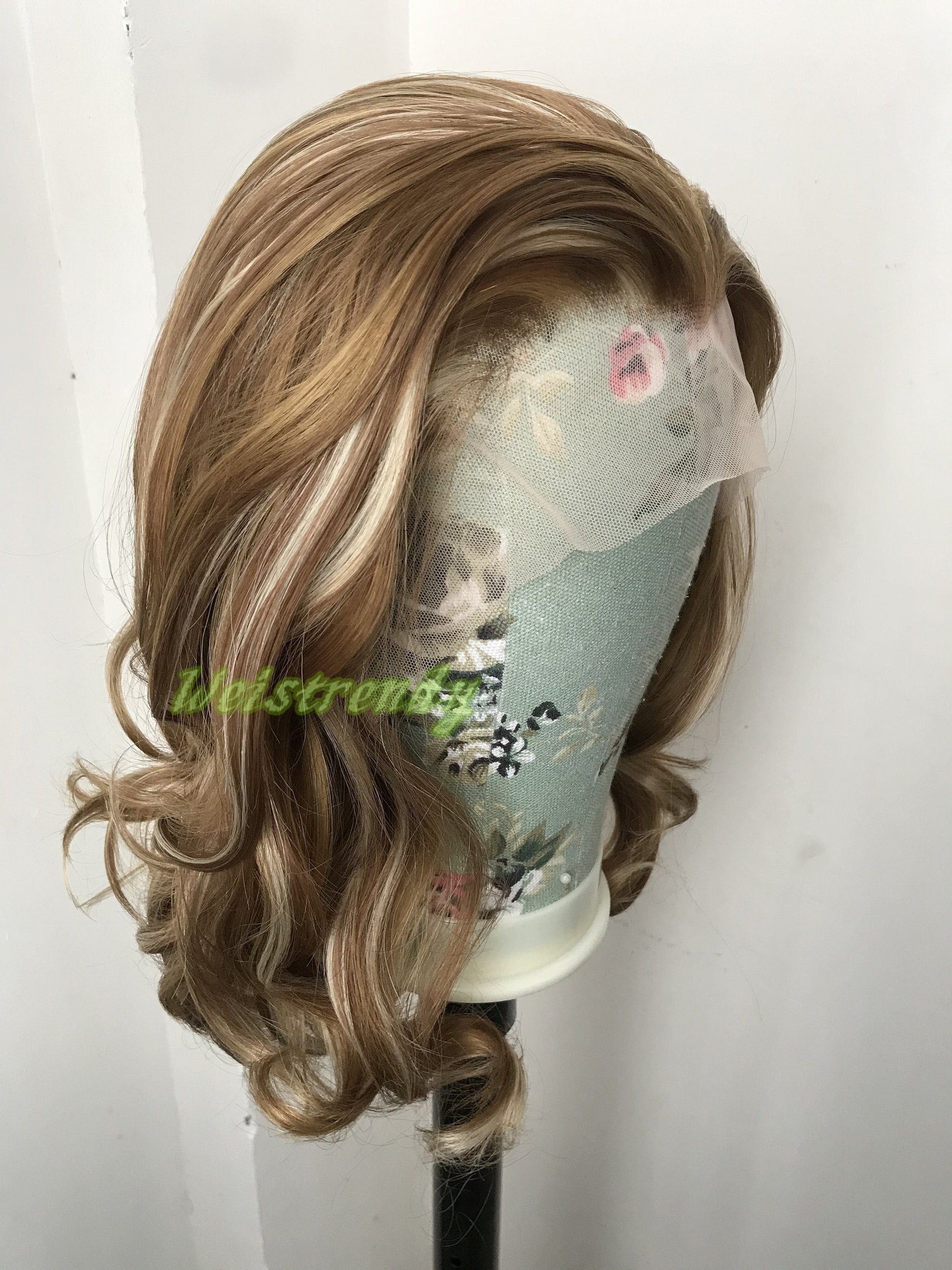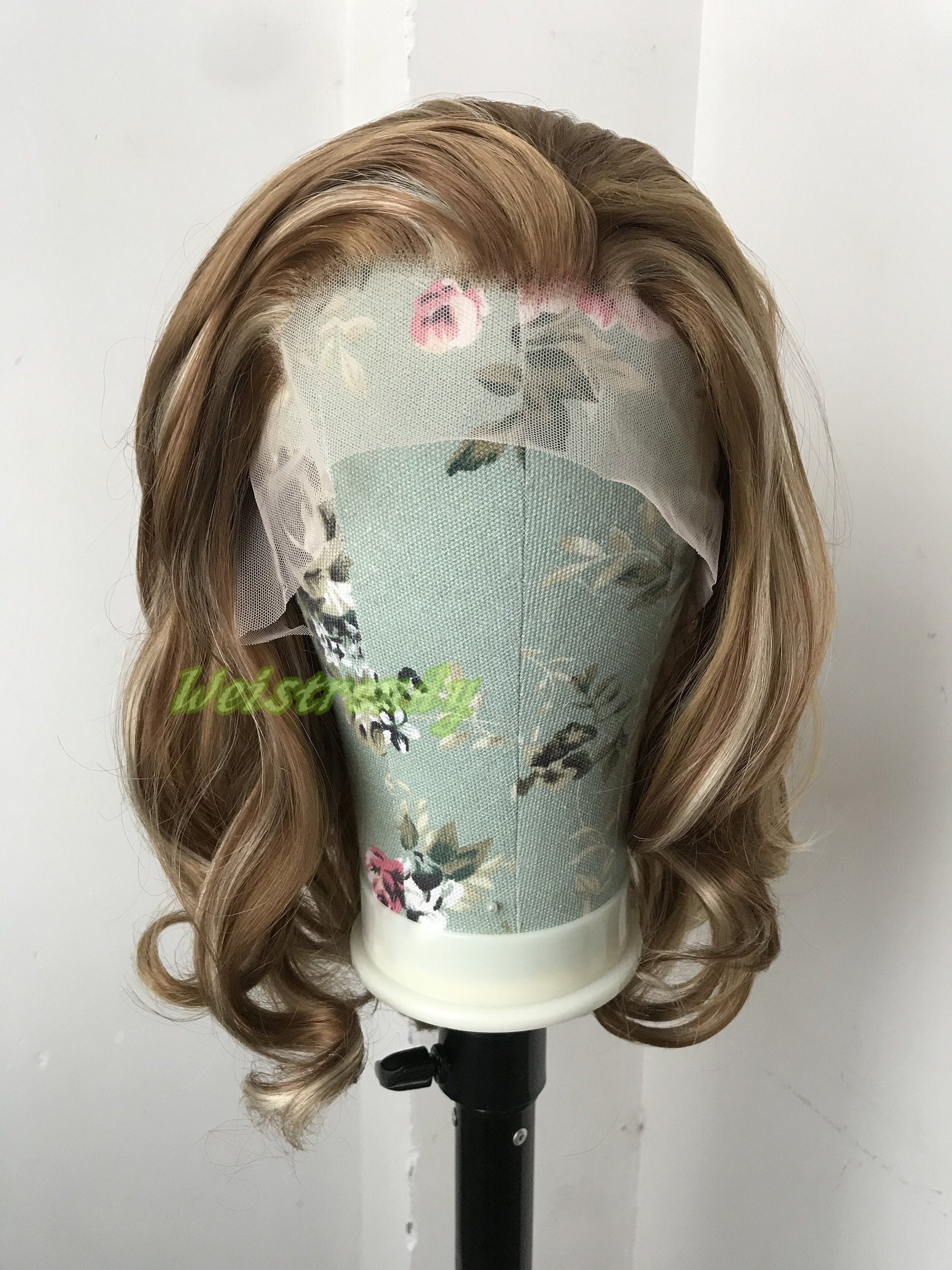 Mixed Brown Blonde Hightlights Medium Length Waves Hair Synthetic Soft Swiss Lace Frontal Wig Free Part Heat Friendly