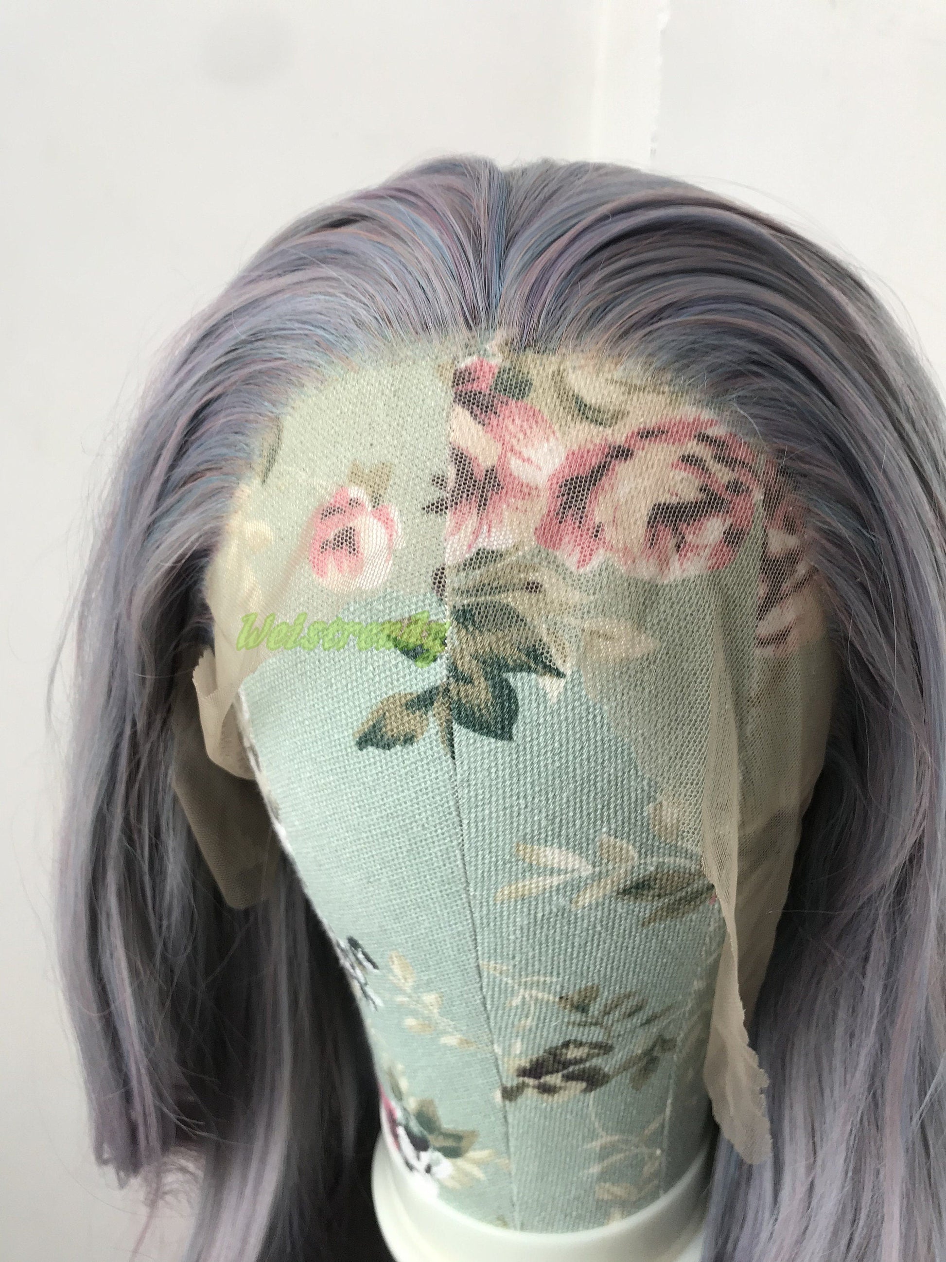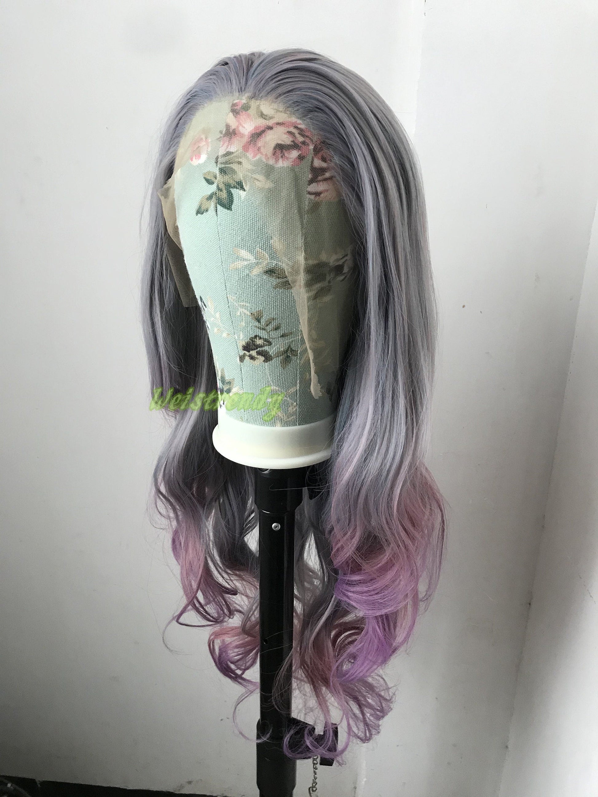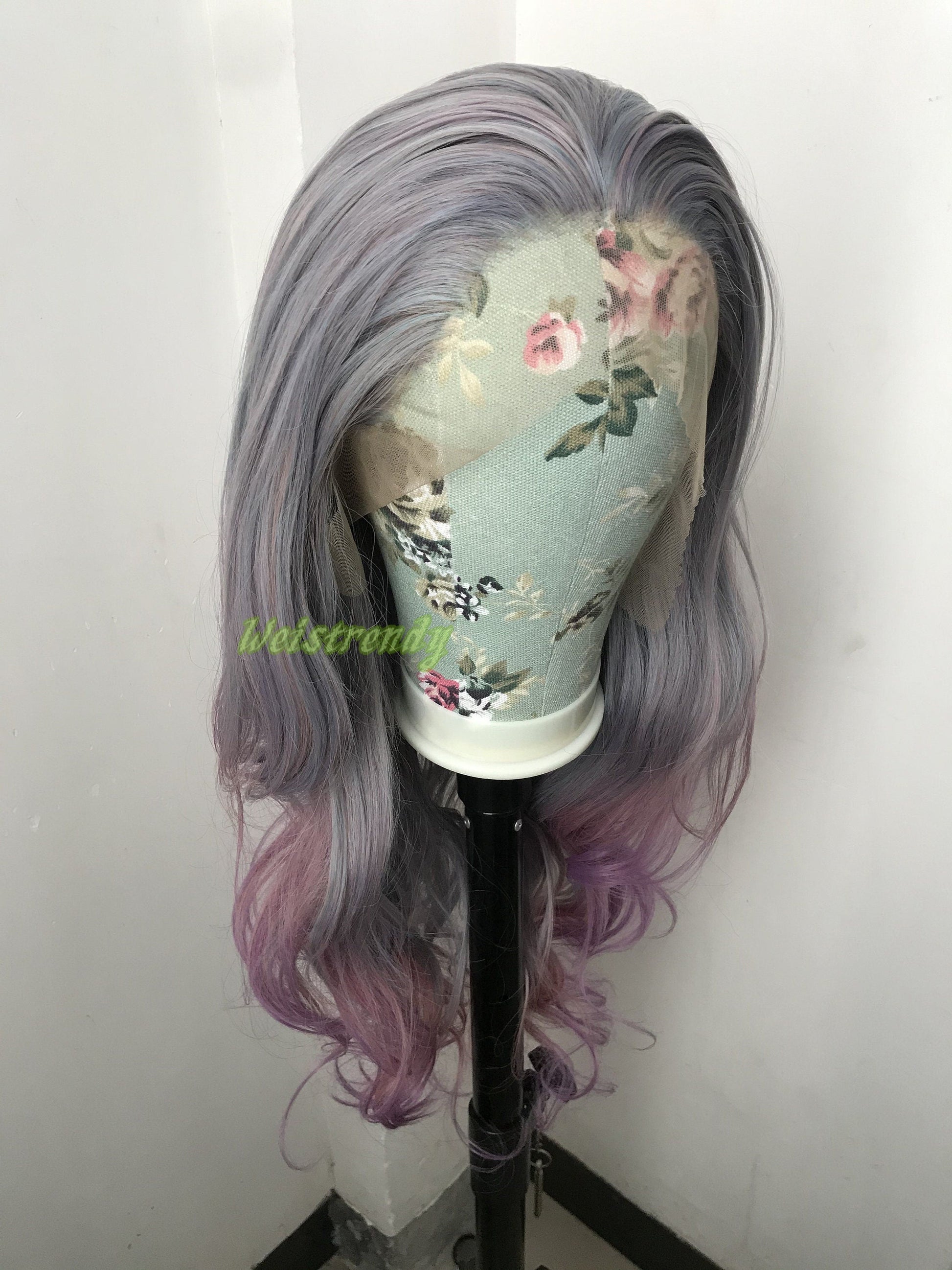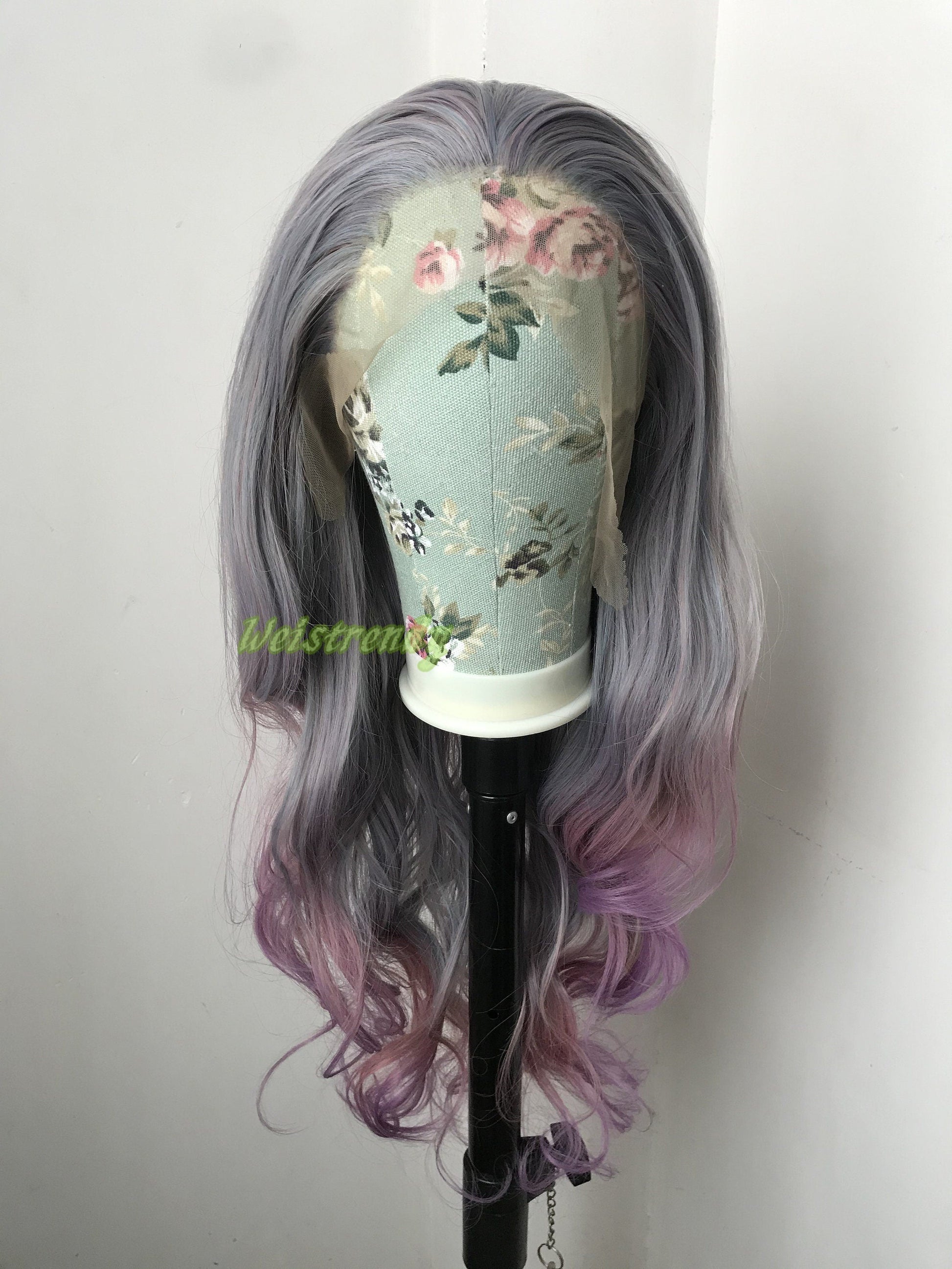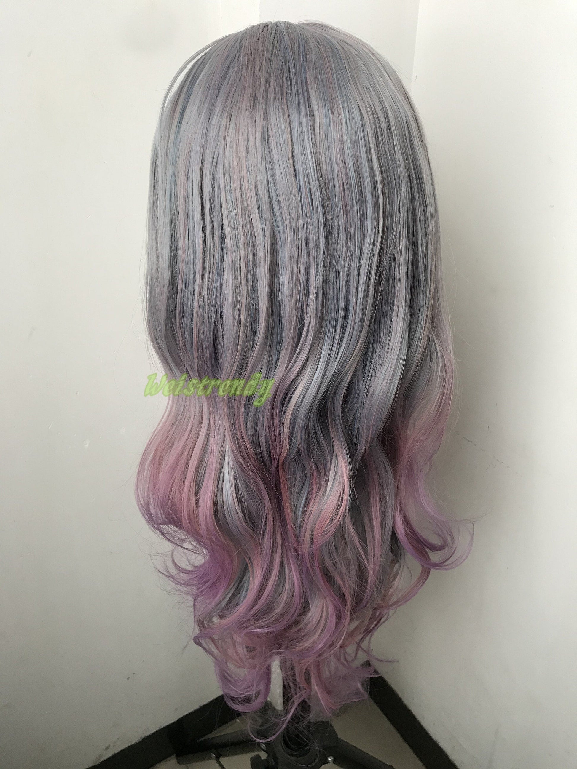 Mixed Purple Grey into Pink Purple Red 3 Tones Long Straight Wavy Hair Multi Part Premium Synthetic Soft Swiss Lace Wig Heat Friendly