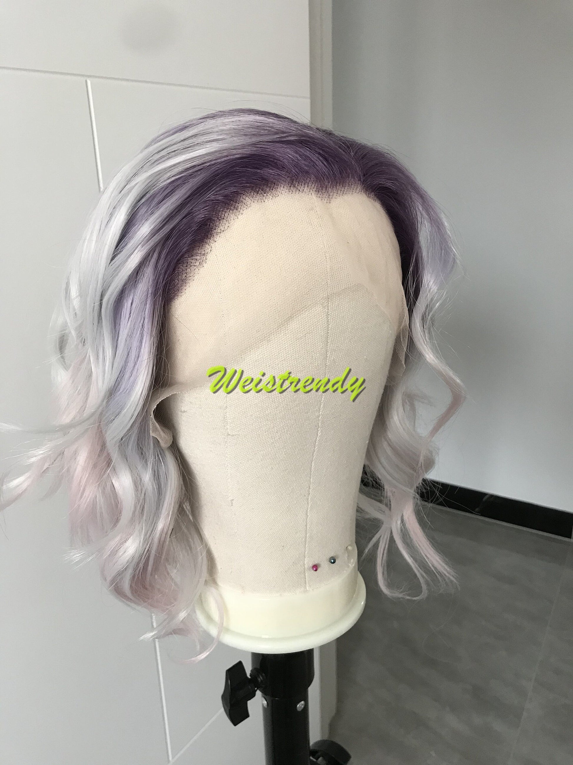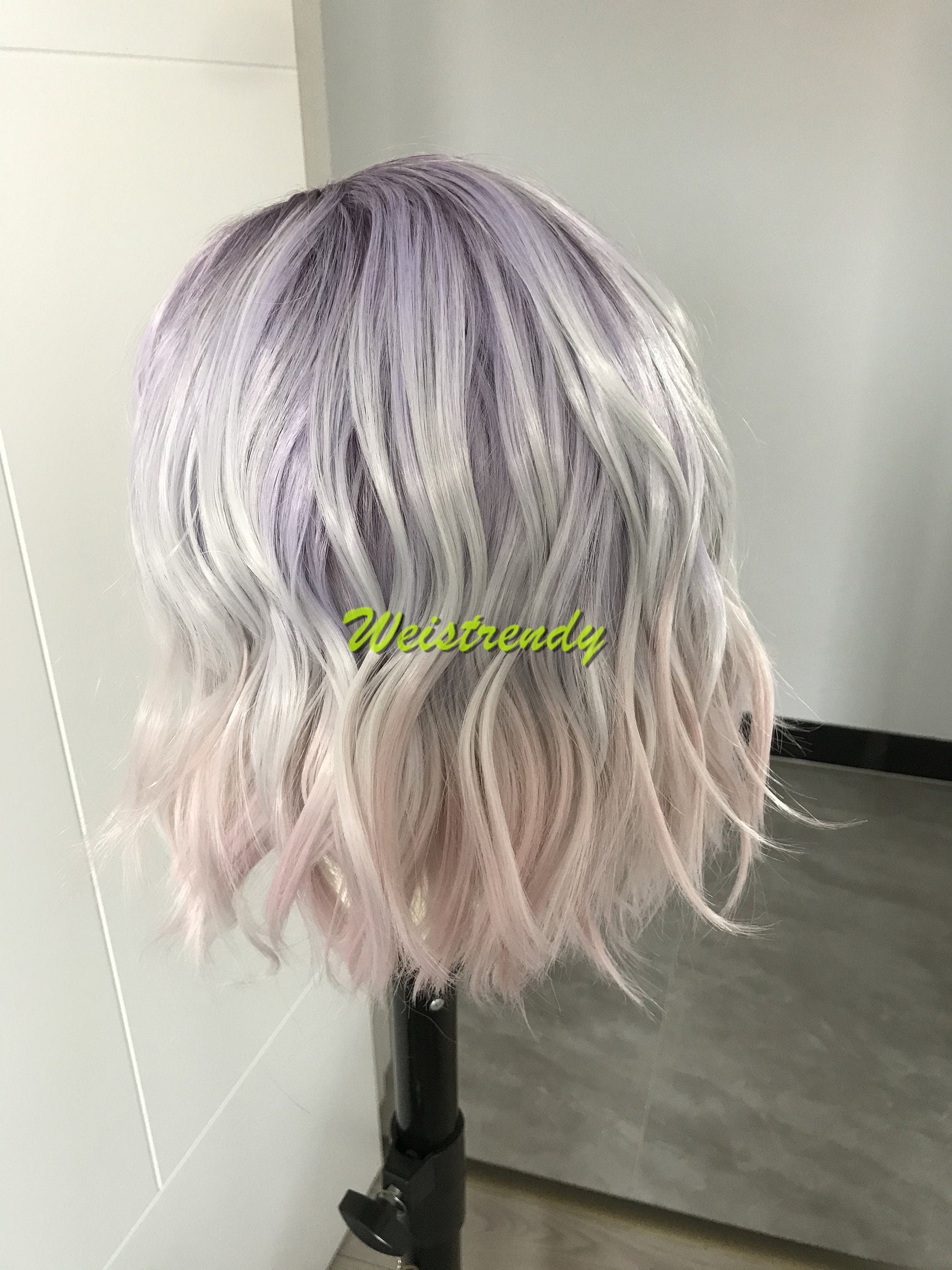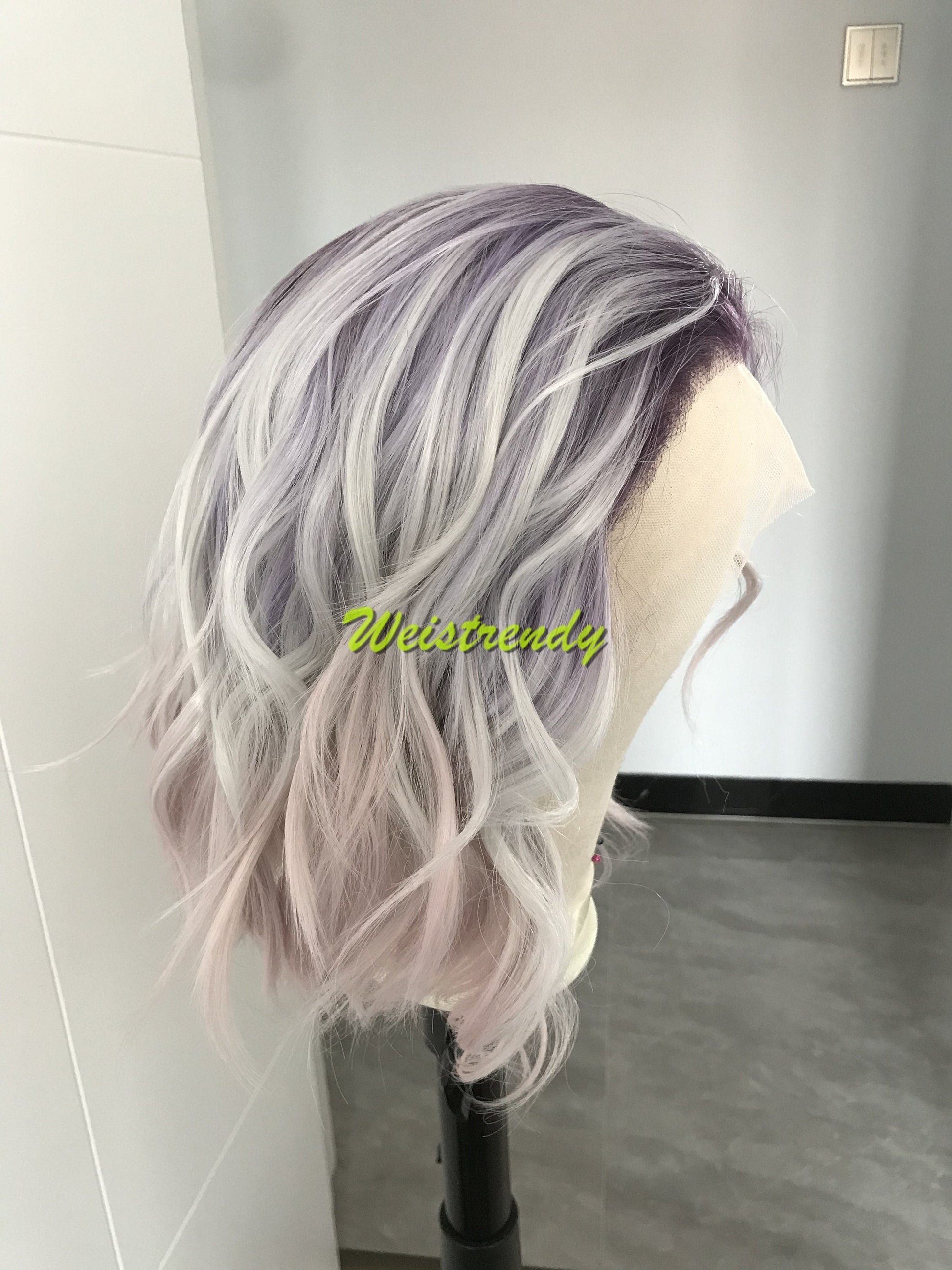 Mystery Pastel Purple Rainbow Lilac into Light Pink in 10 Stylish Wavy Bob Hair Lace frontal Synthetic Wig