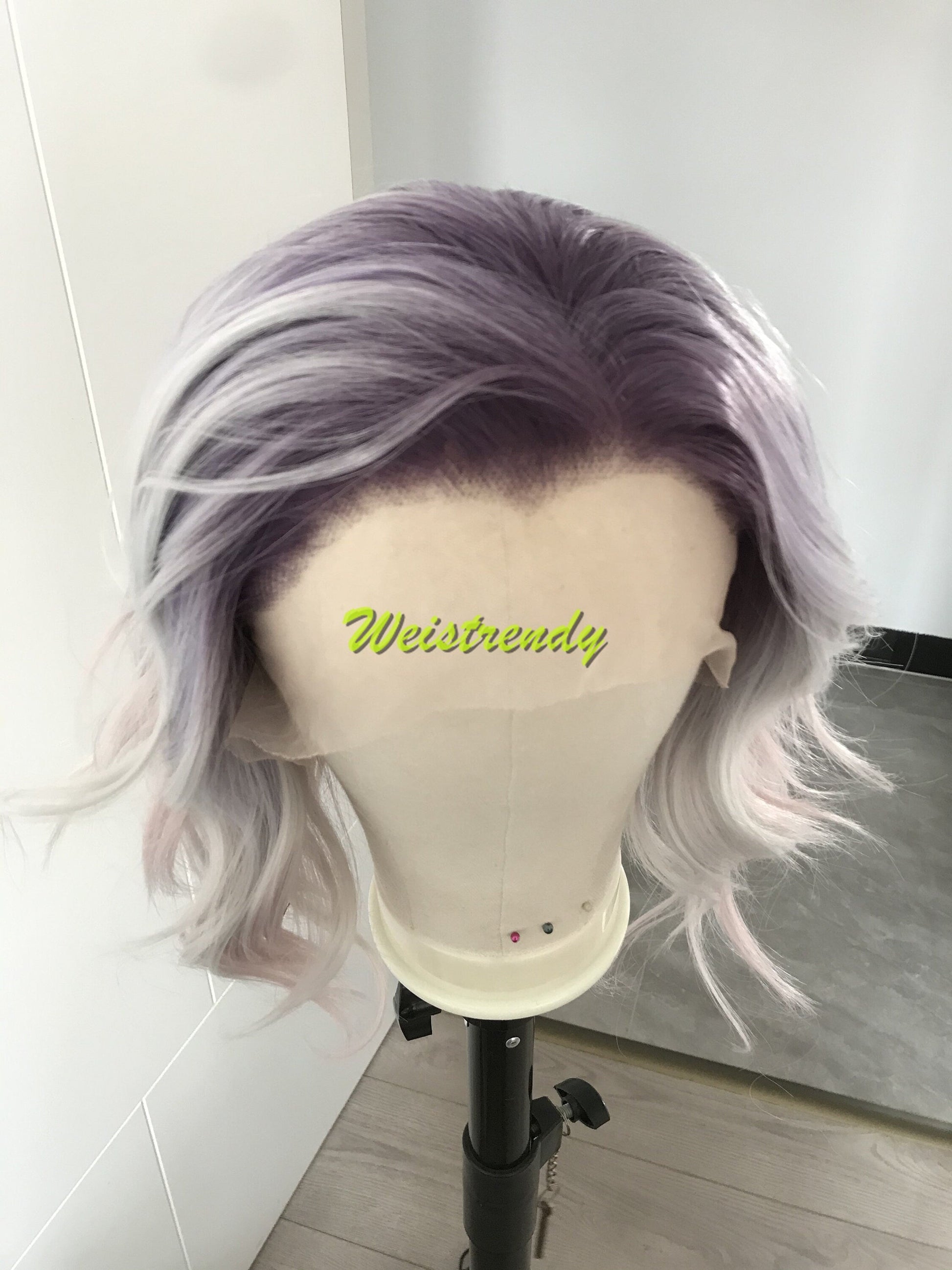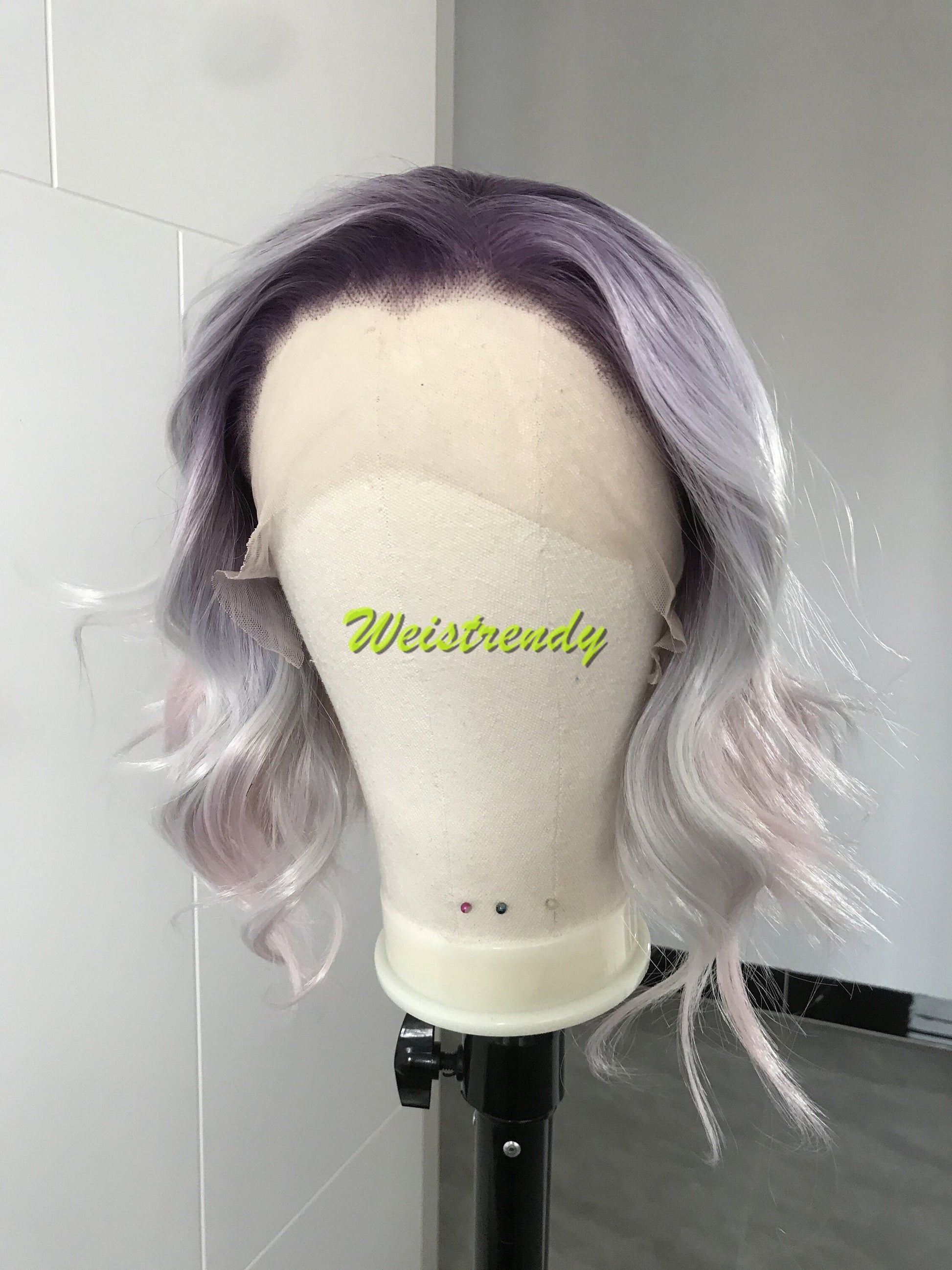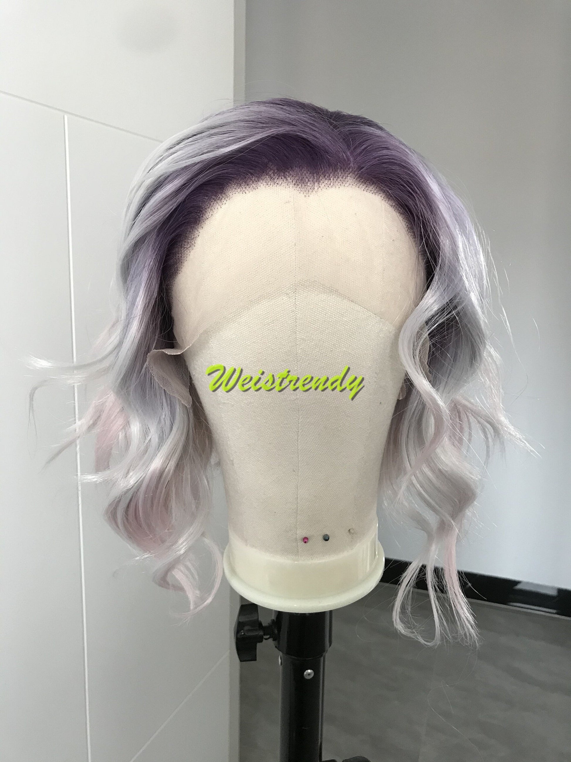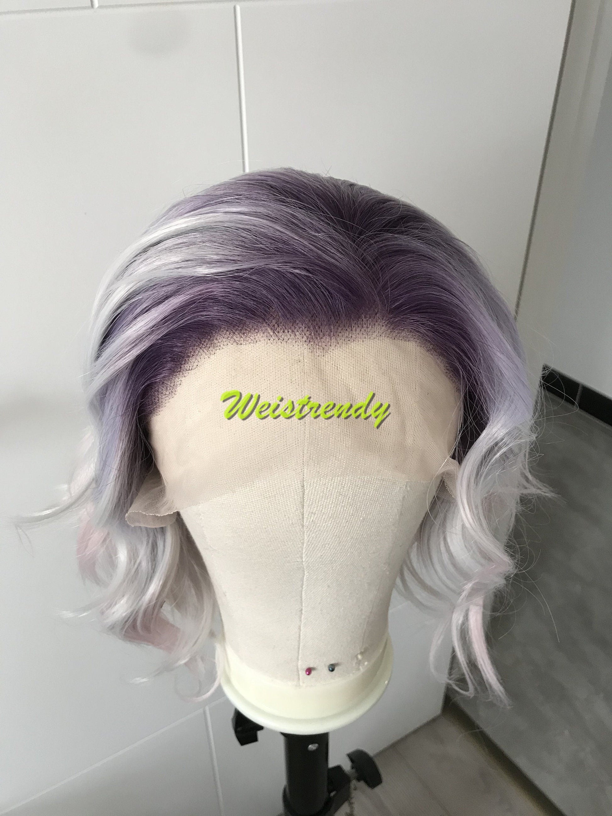 Mystery Pastel Purple Rainbow Lilac into Light Pink in 10 Stylish Wavy Bob Hair Lace frontal Synthetic Wig