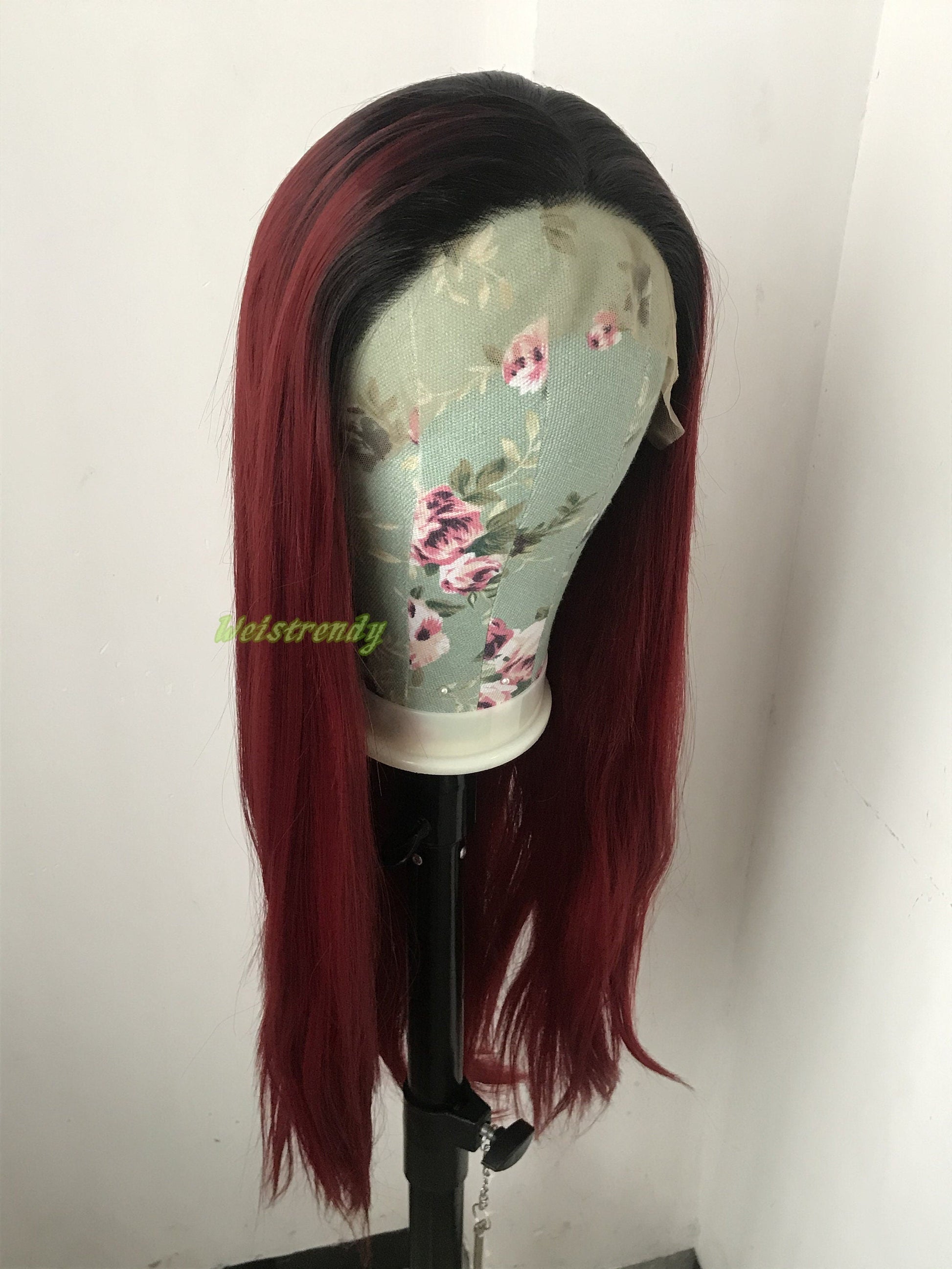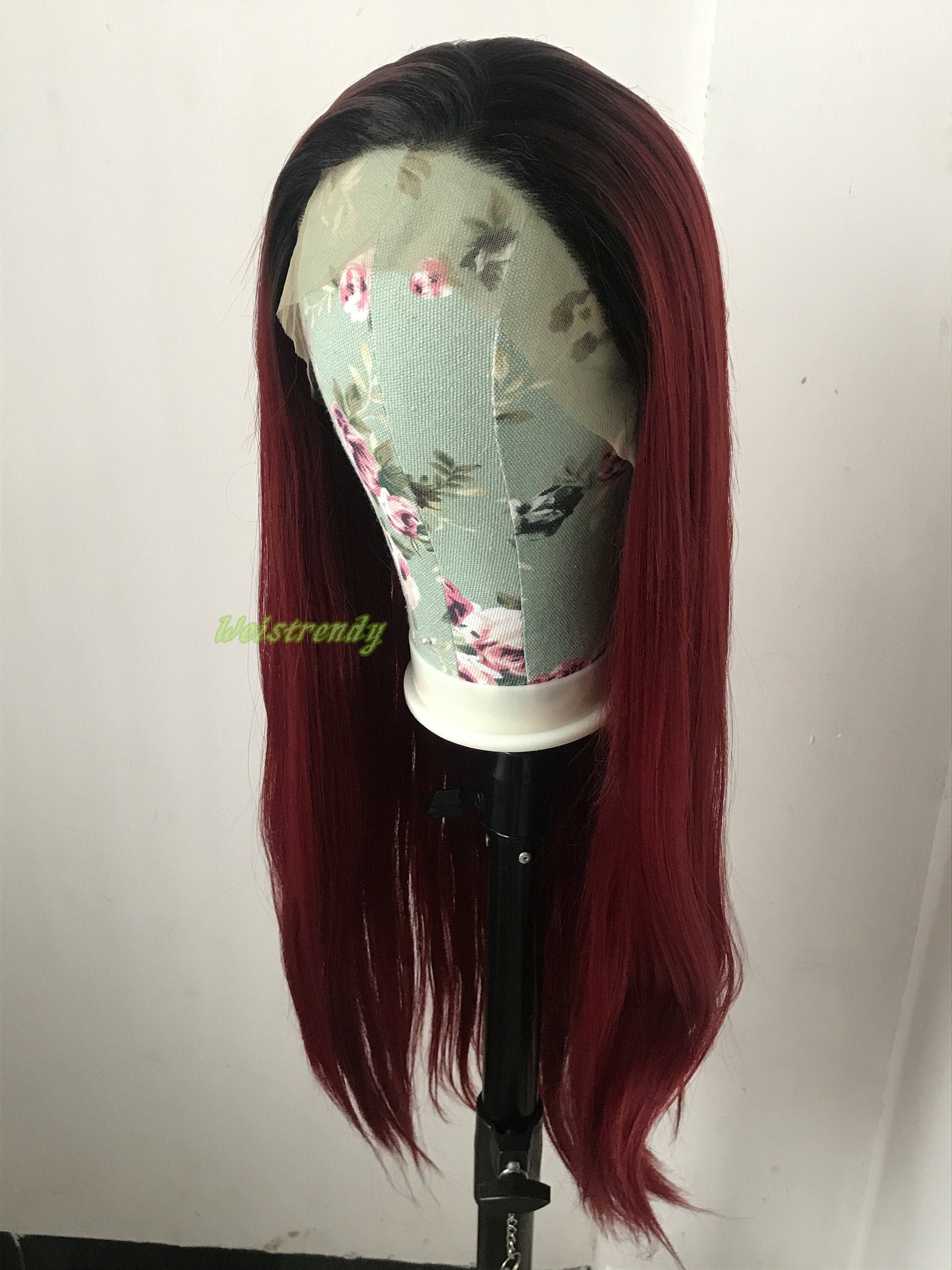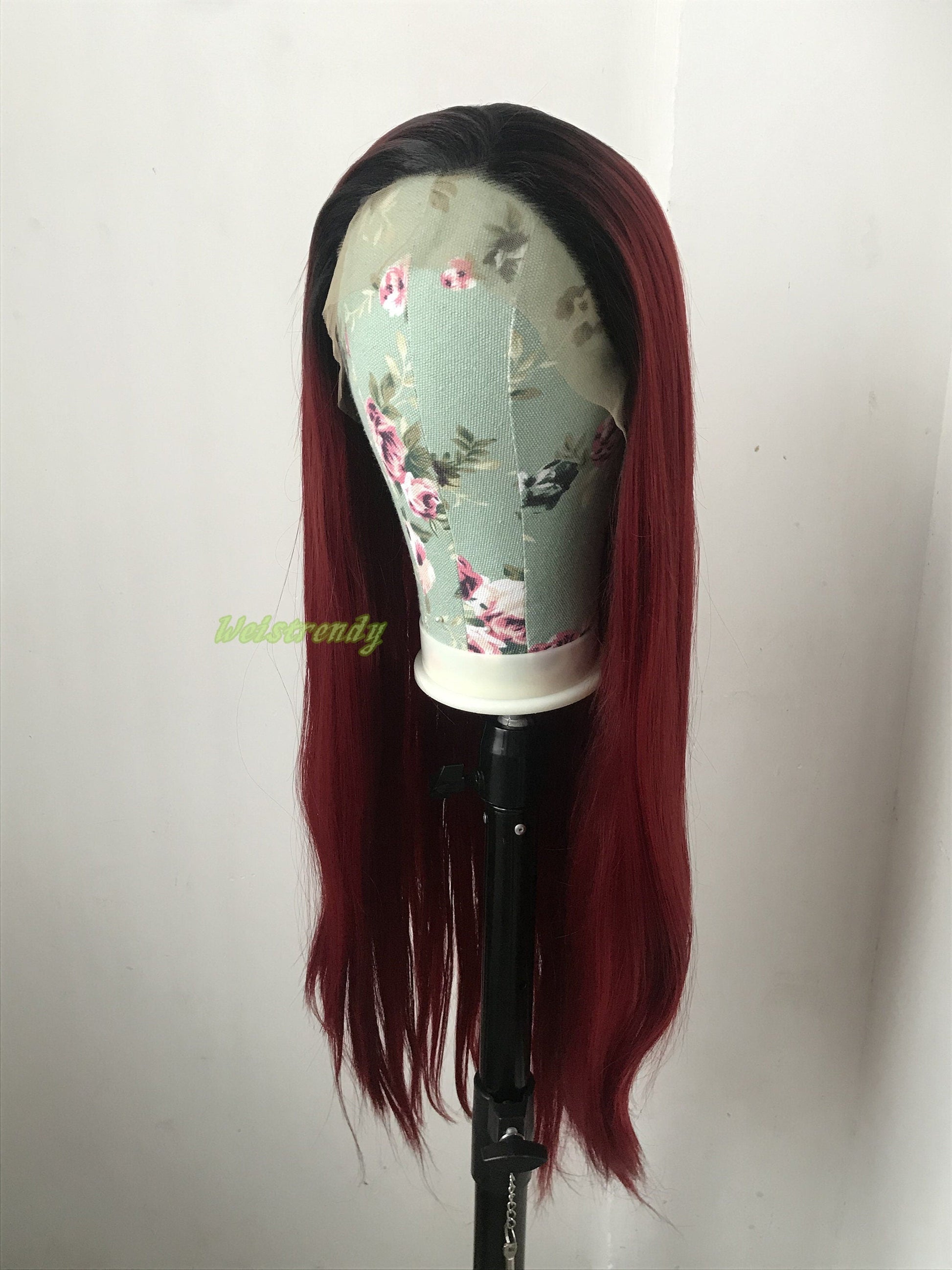 Ombré Dark Red Long Straight Hair with Black Roots Premium Synthetic Soft Swiss Lace Frontal Wig Multi Parting