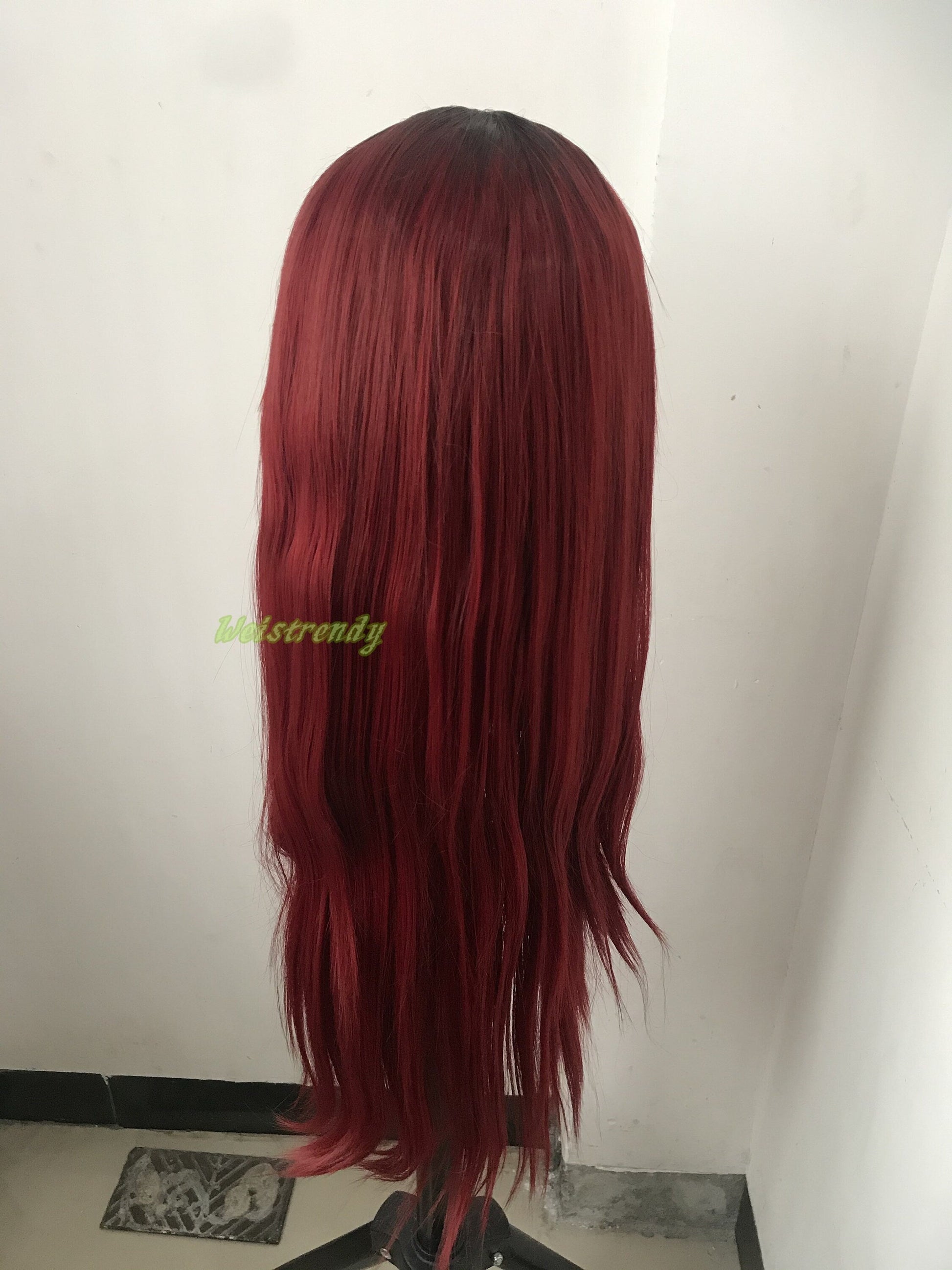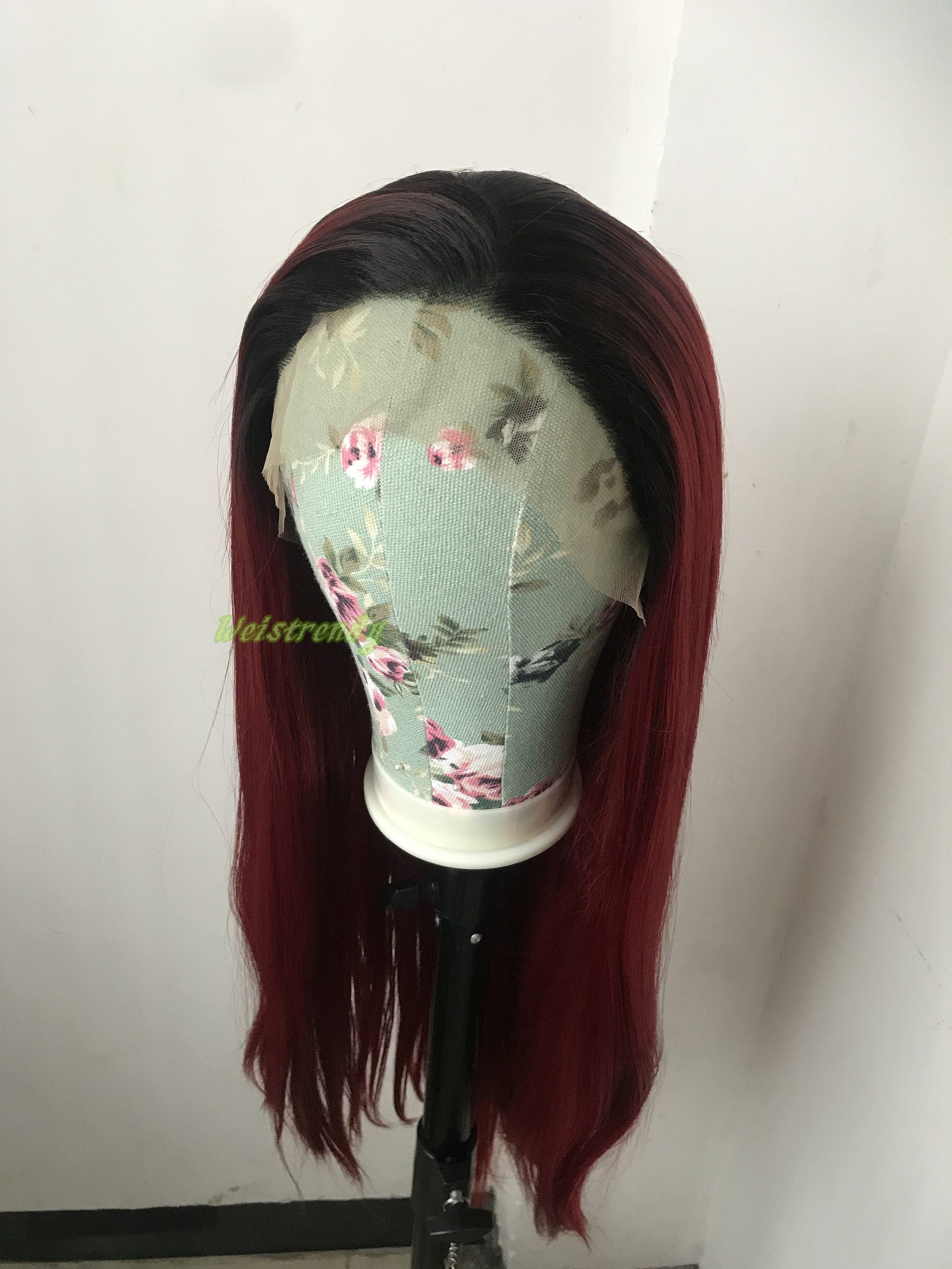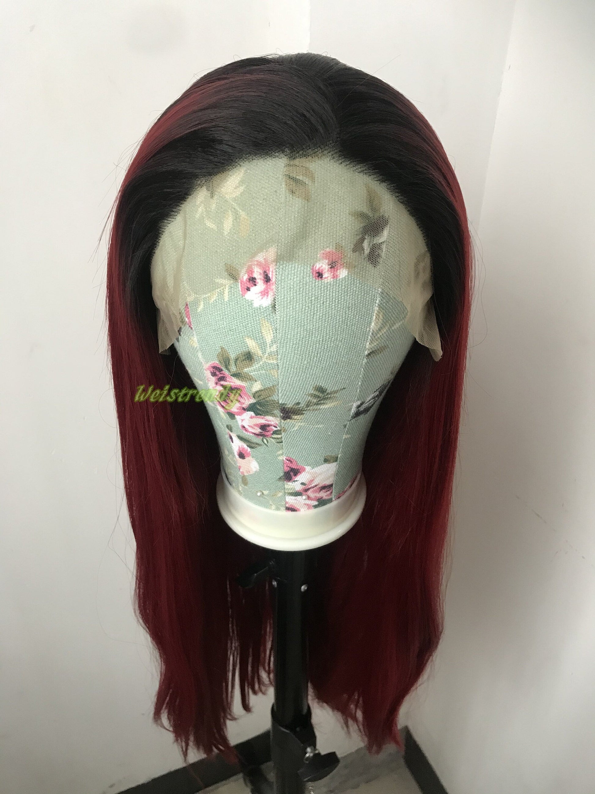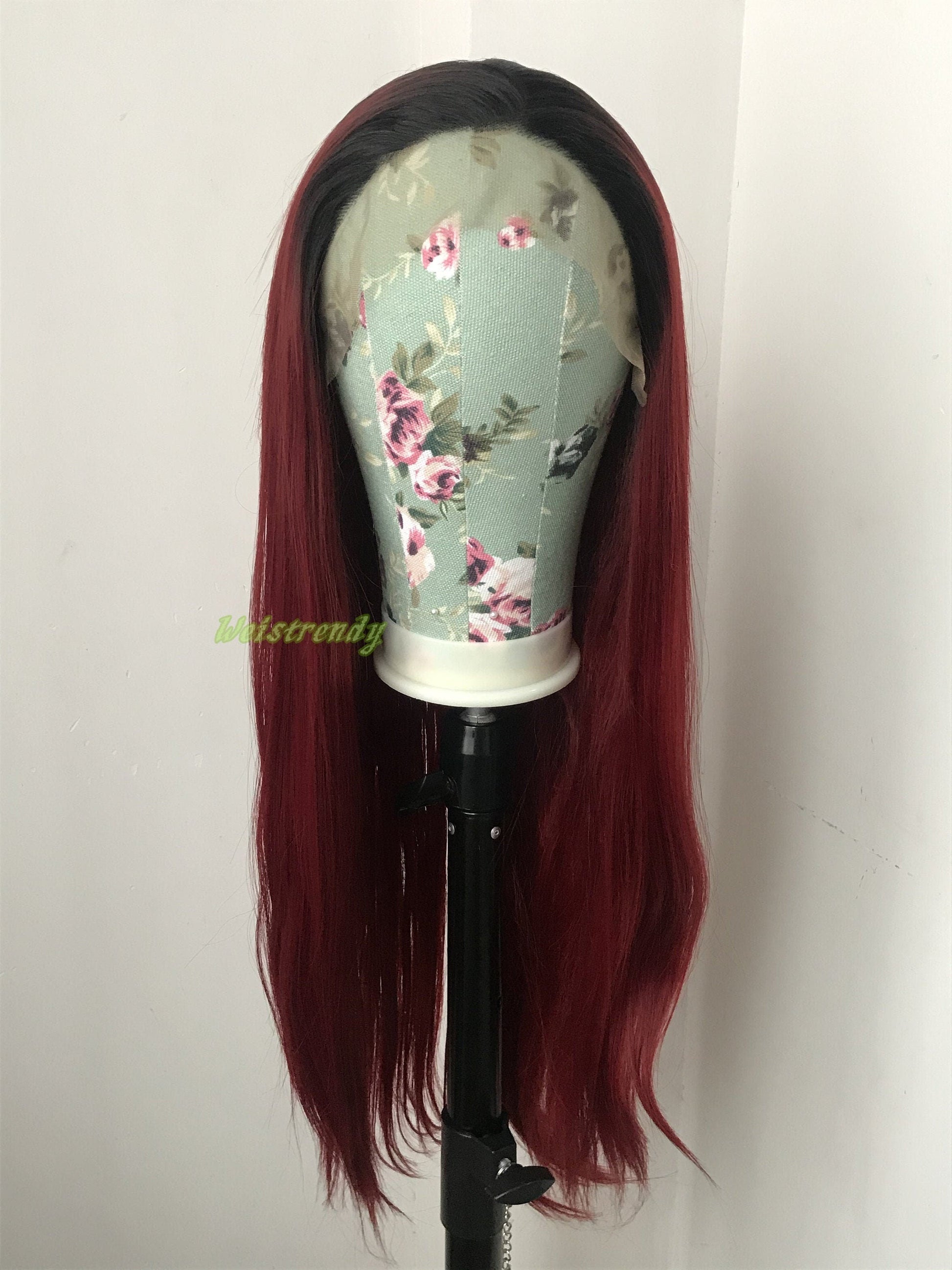Ombré Dark Red Long Straight Hair with Black Roots Premium Synthetic Soft Swiss Lace Frontal Wig Multi Parting
