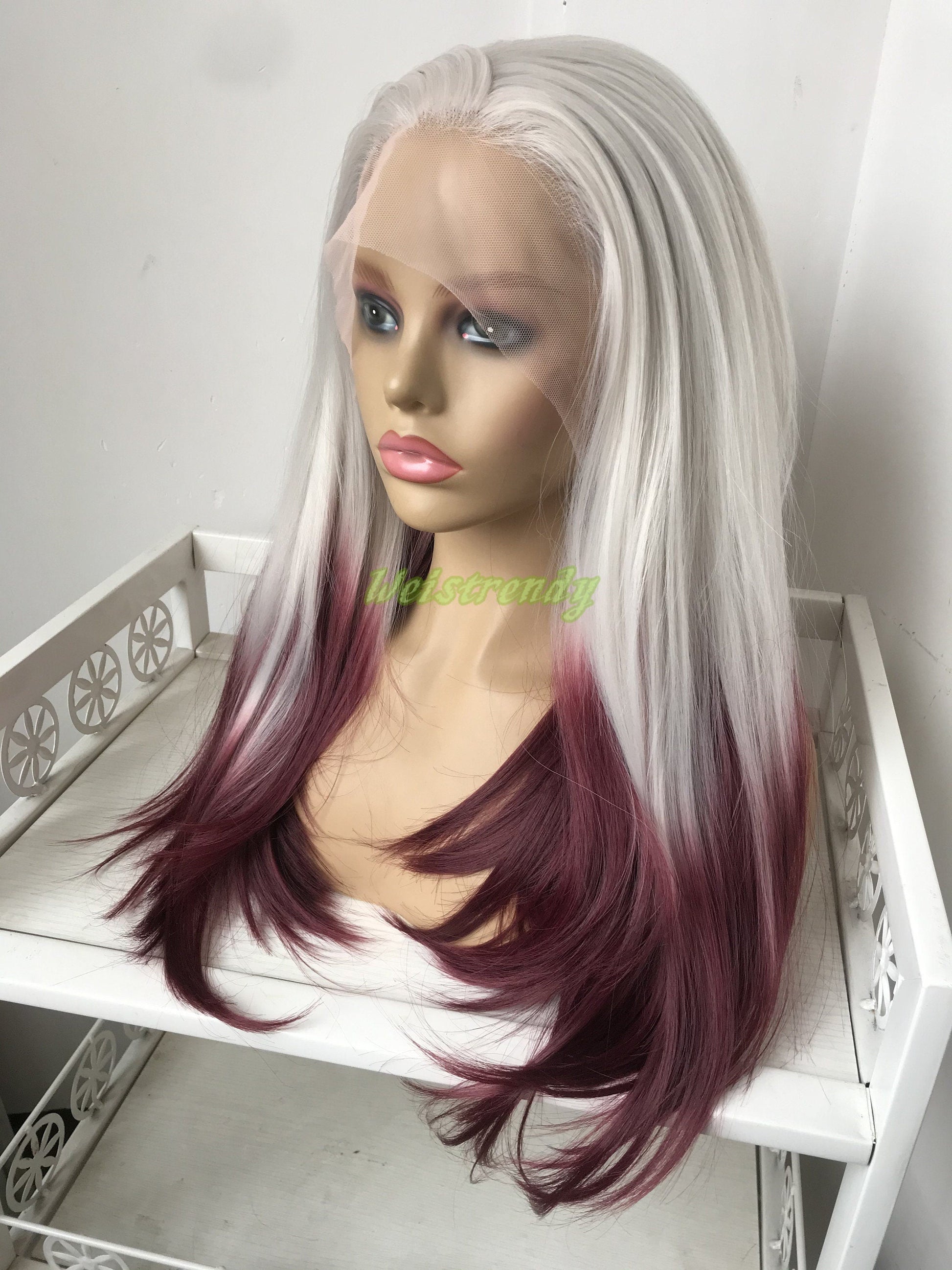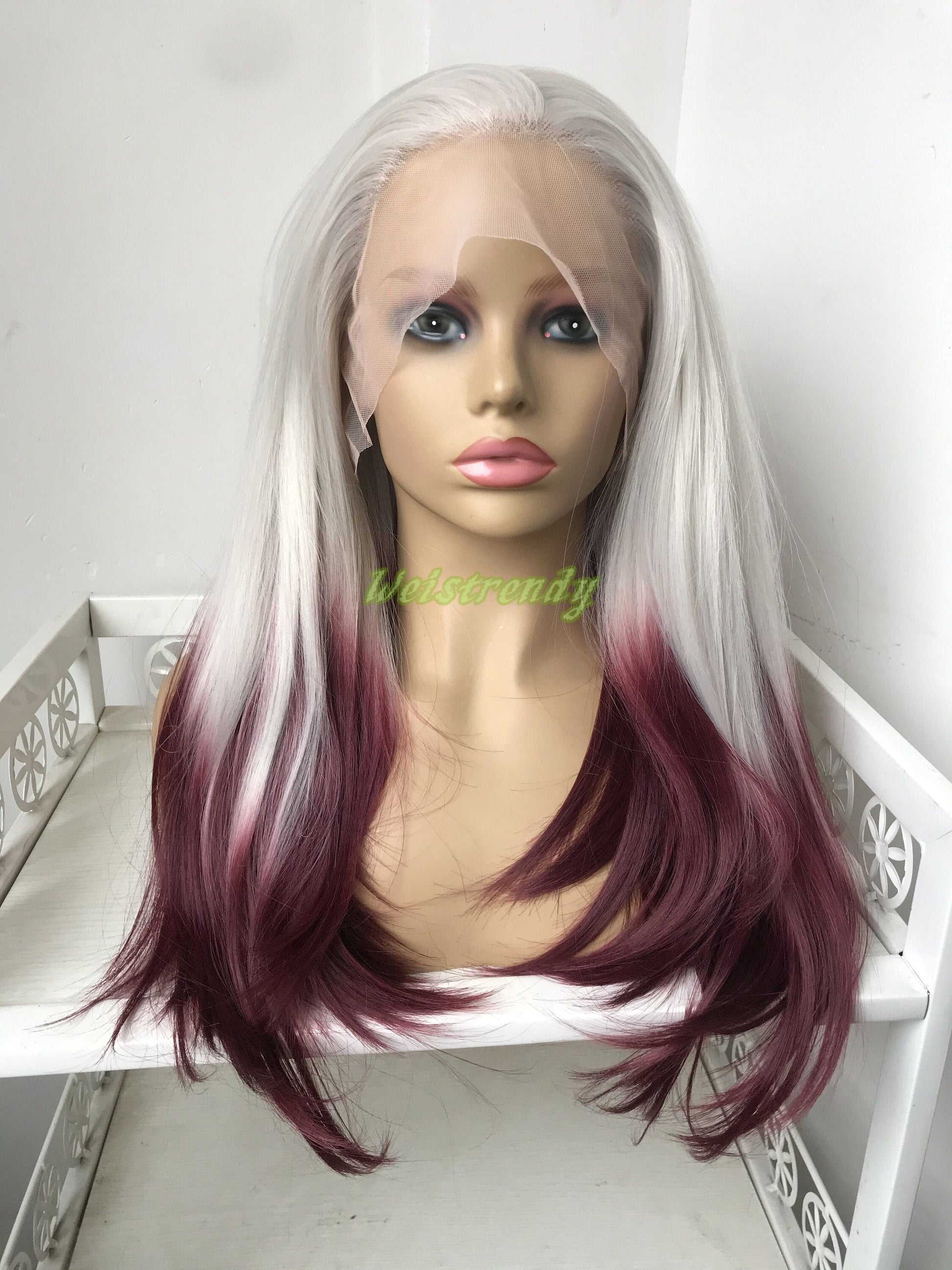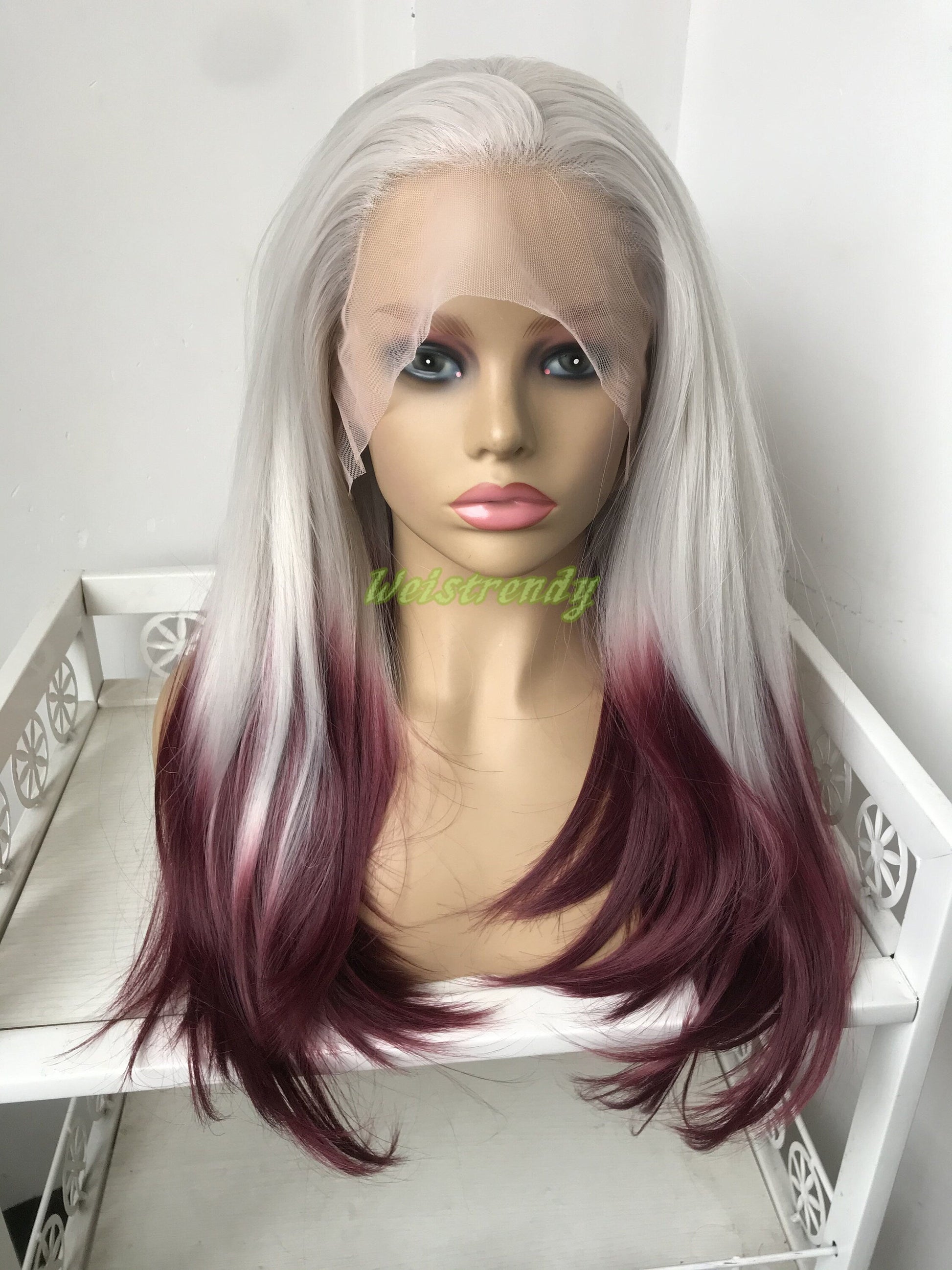 Pastel Grey Wine Red Ombre Long Straight Hair Premium Synthetic Lace Front Wig Free Part