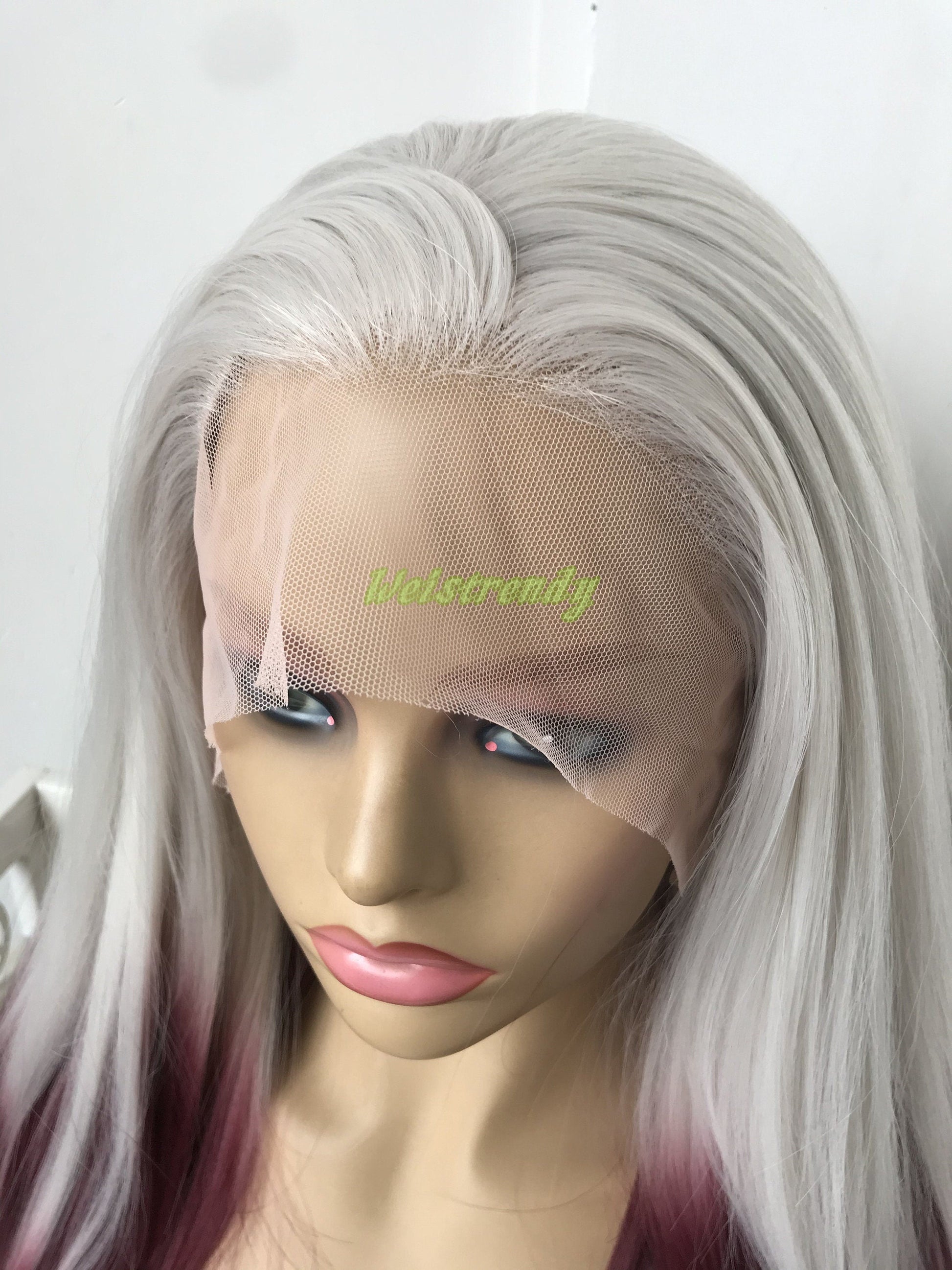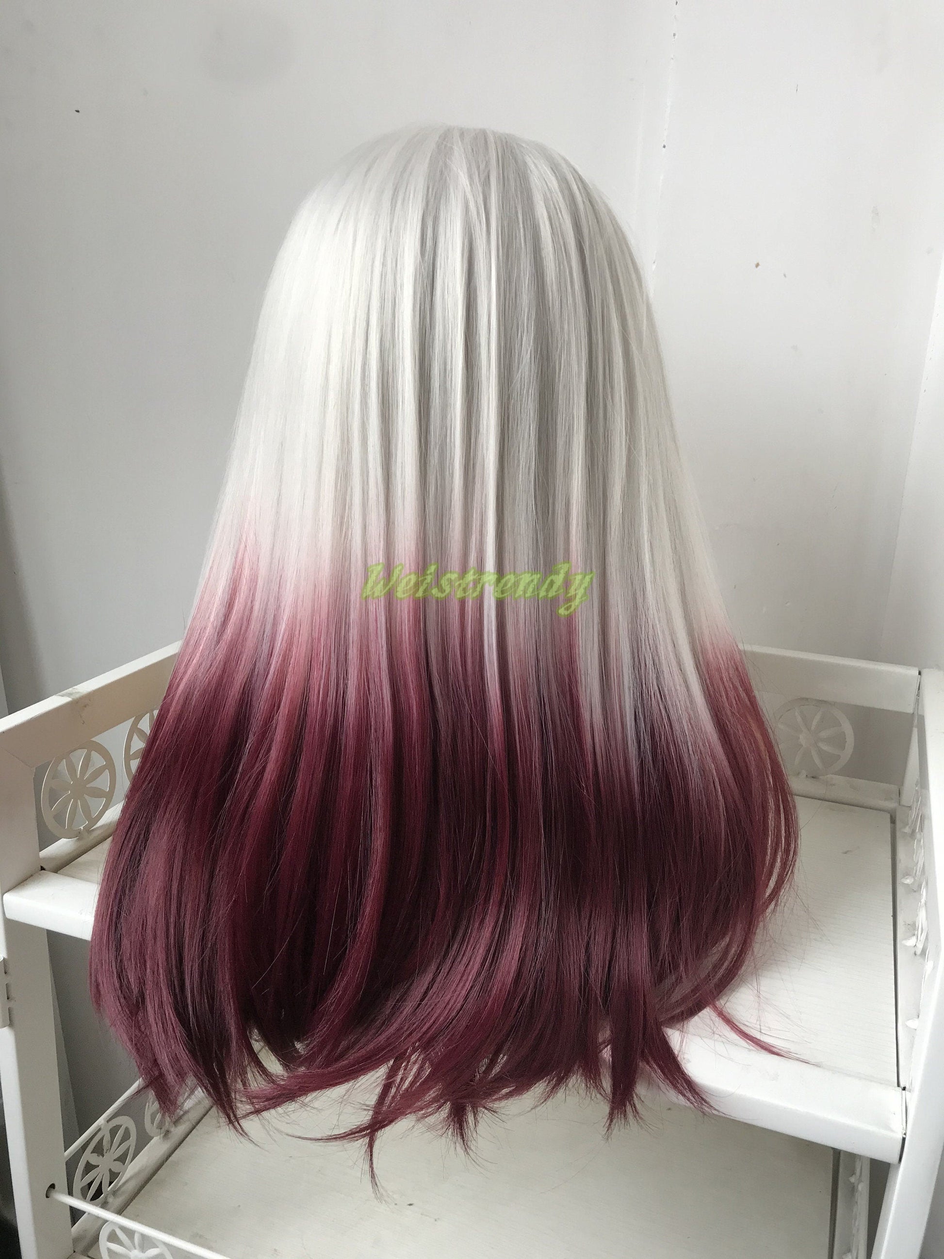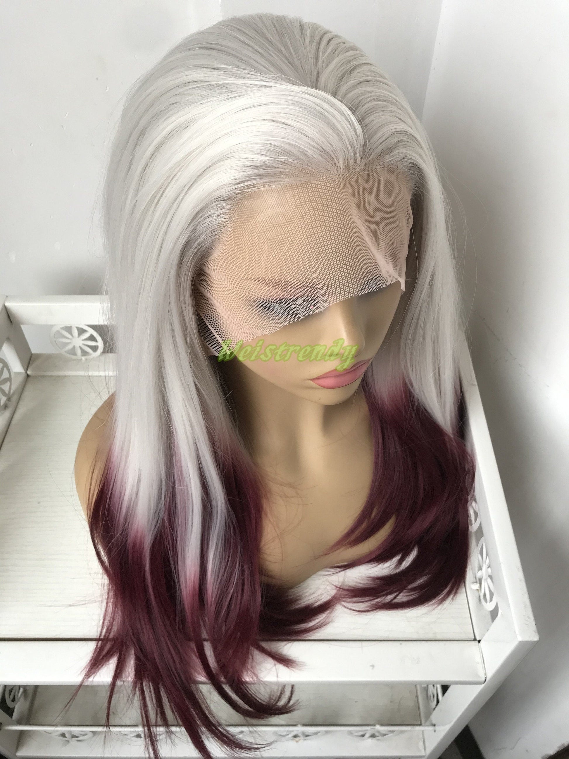 Pastel Grey Wine Red Ombre Long Straight Hair Premium Synthetic Lace Front Wig Free Part