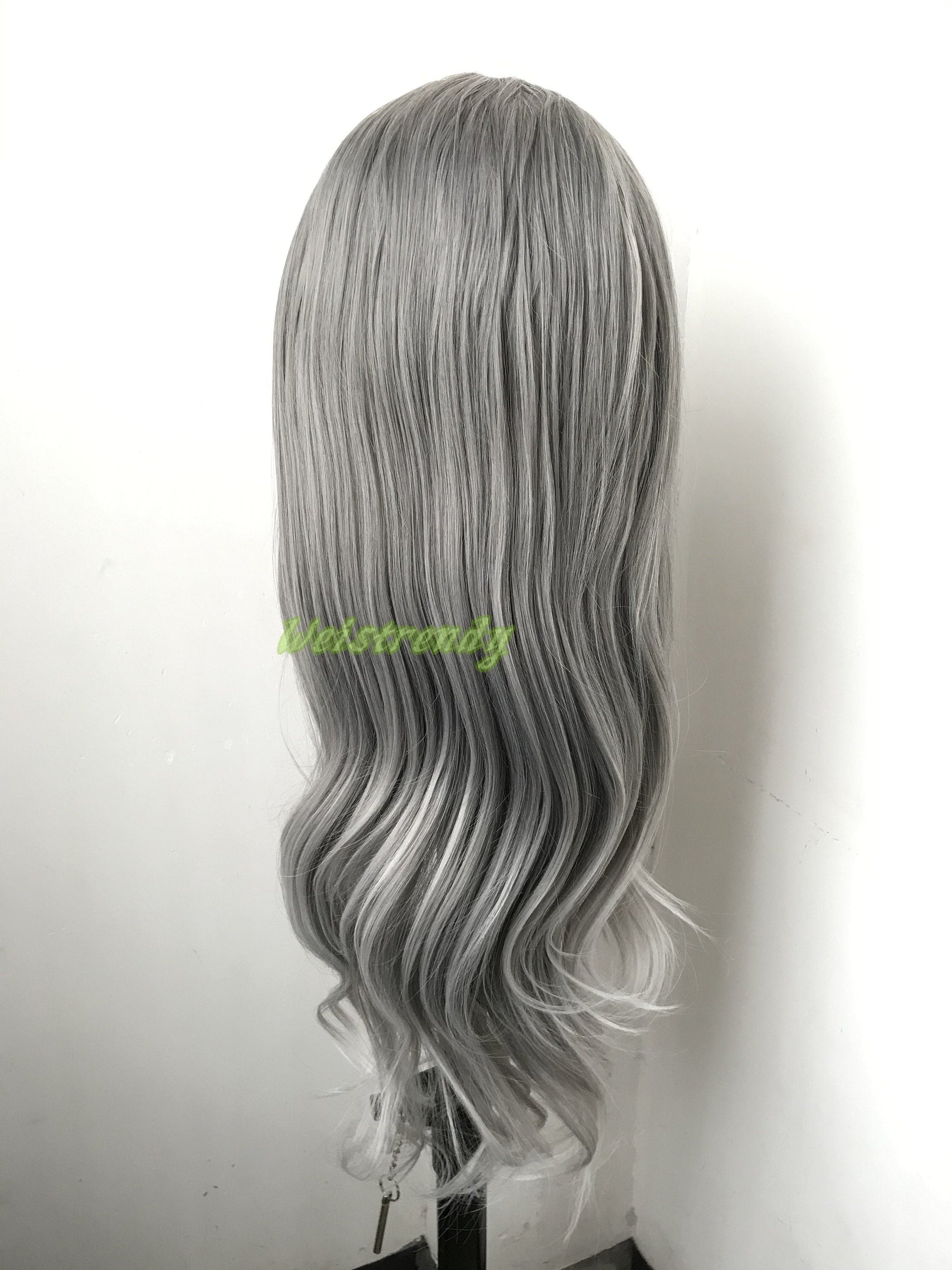 Realistic Dark Grey | Silver Grey into Light Grey | White Grey ends Long Straight Wavy Hair Premium Synthetic Lace frontal Wig Multi Part