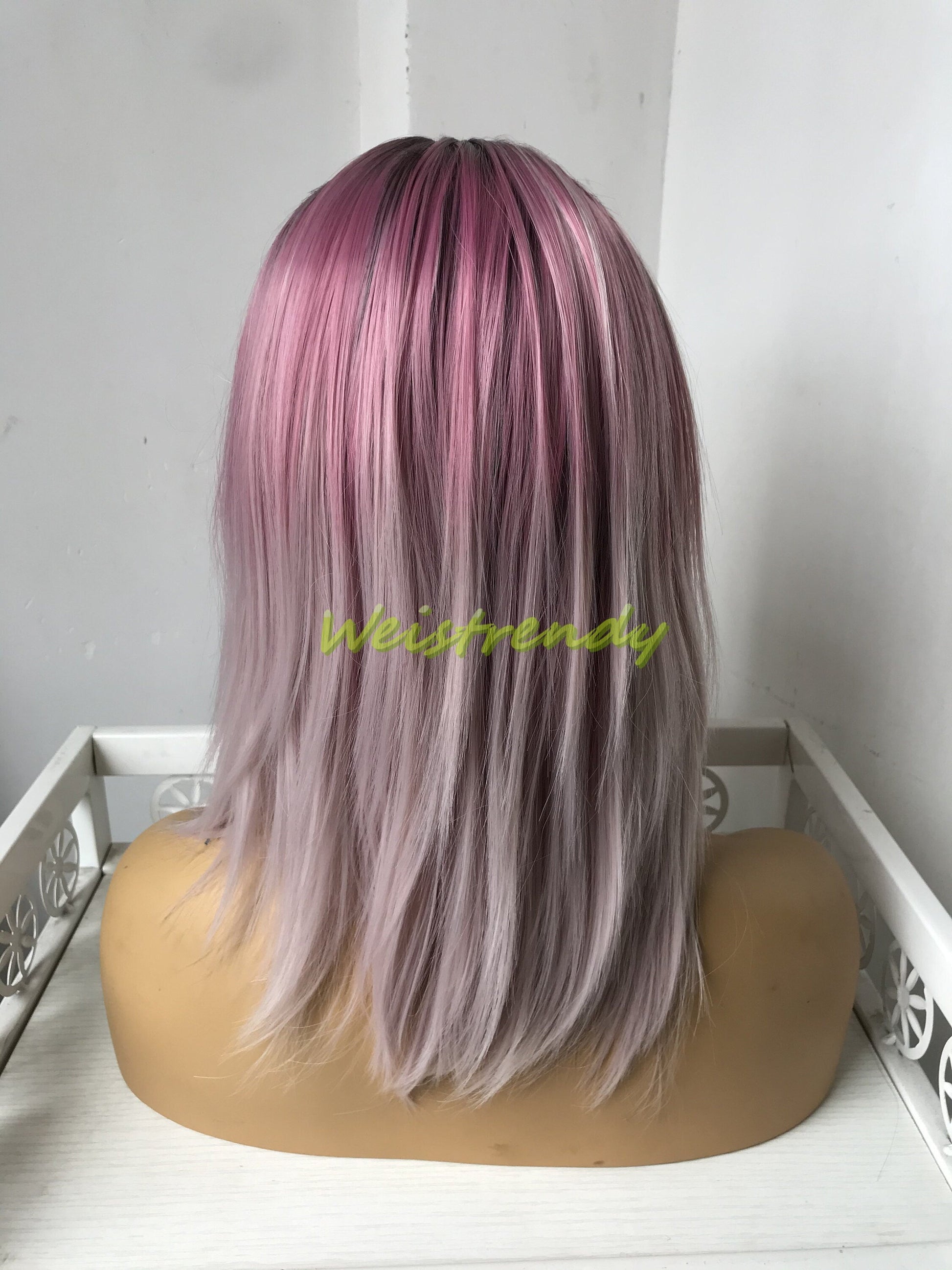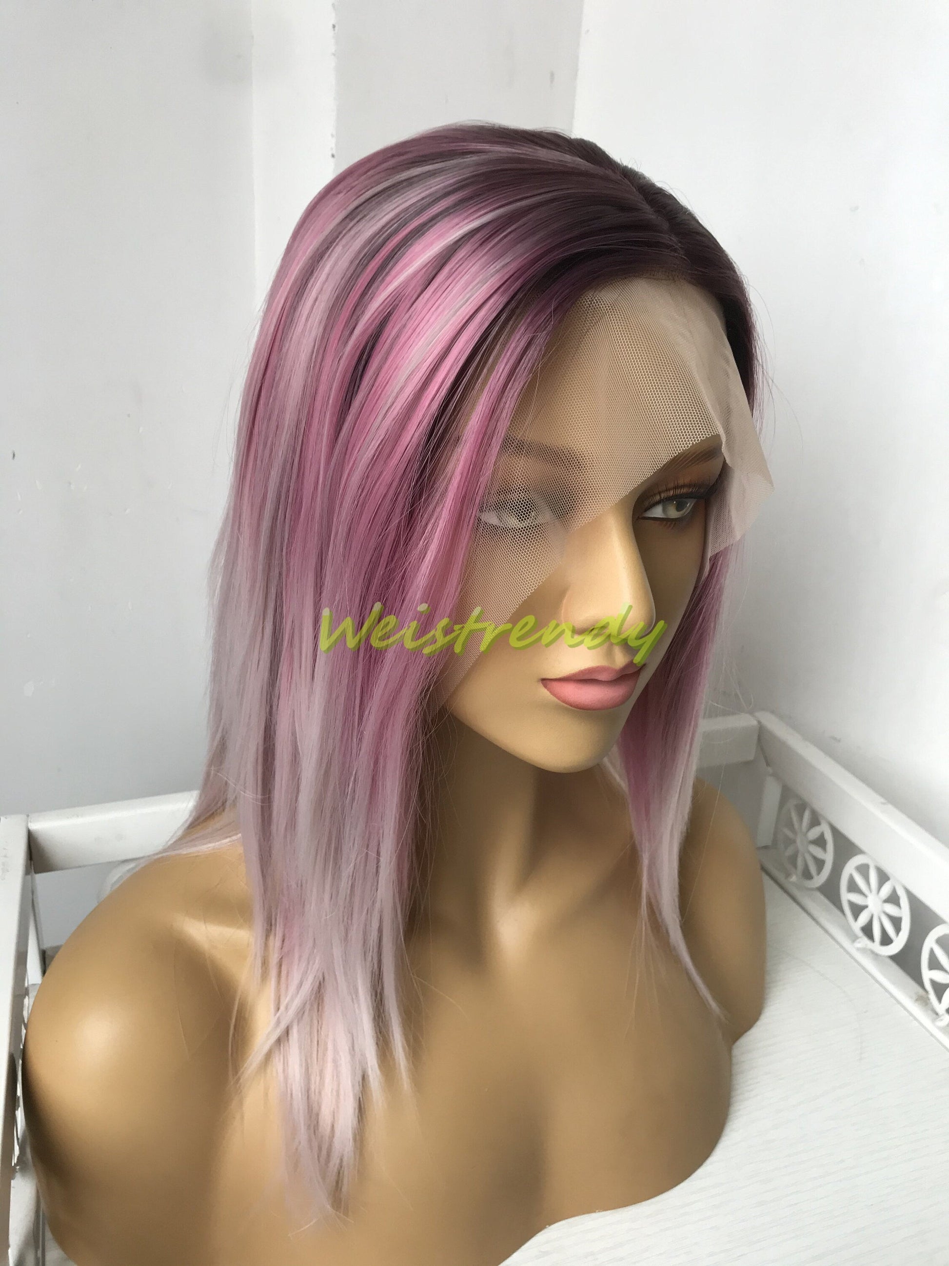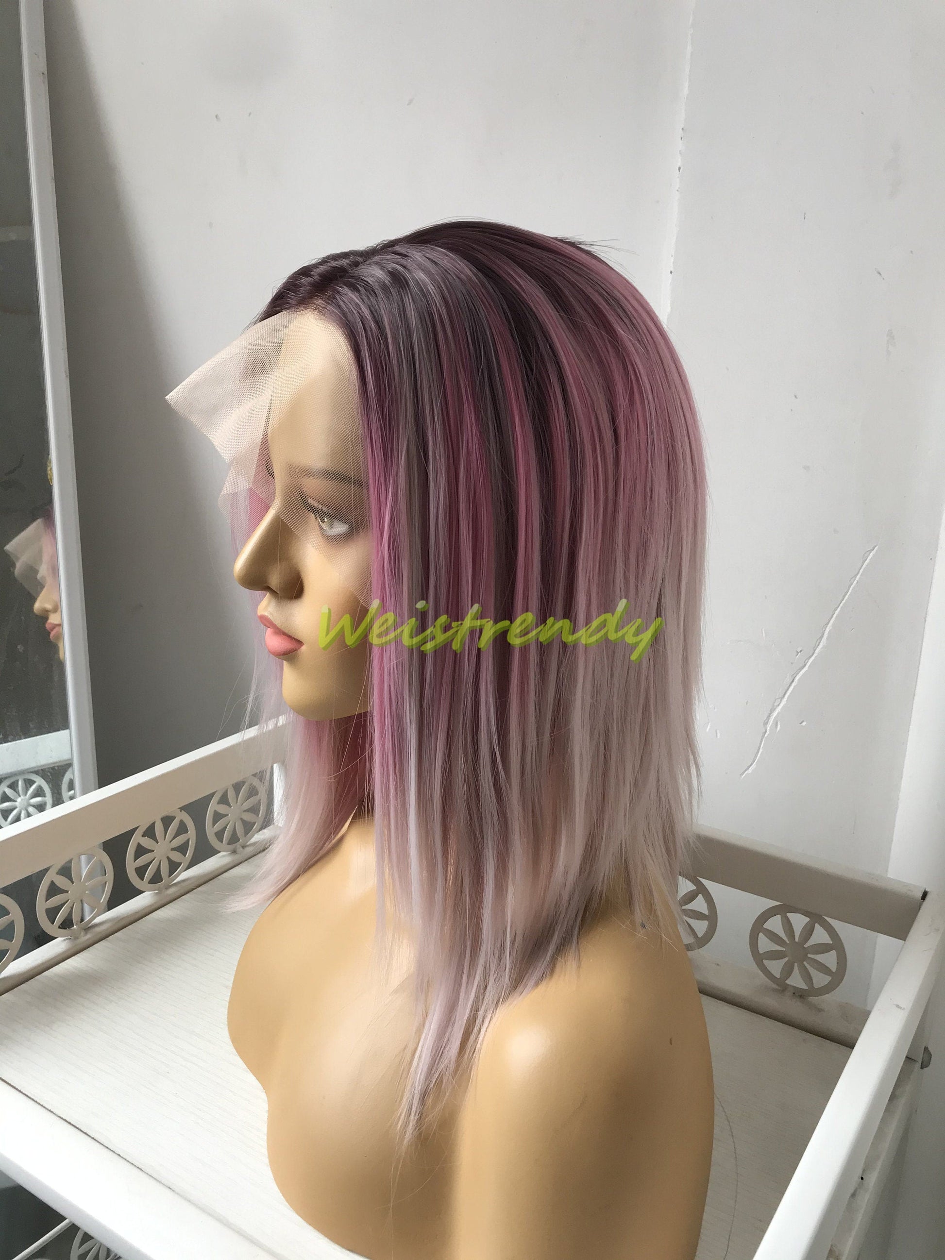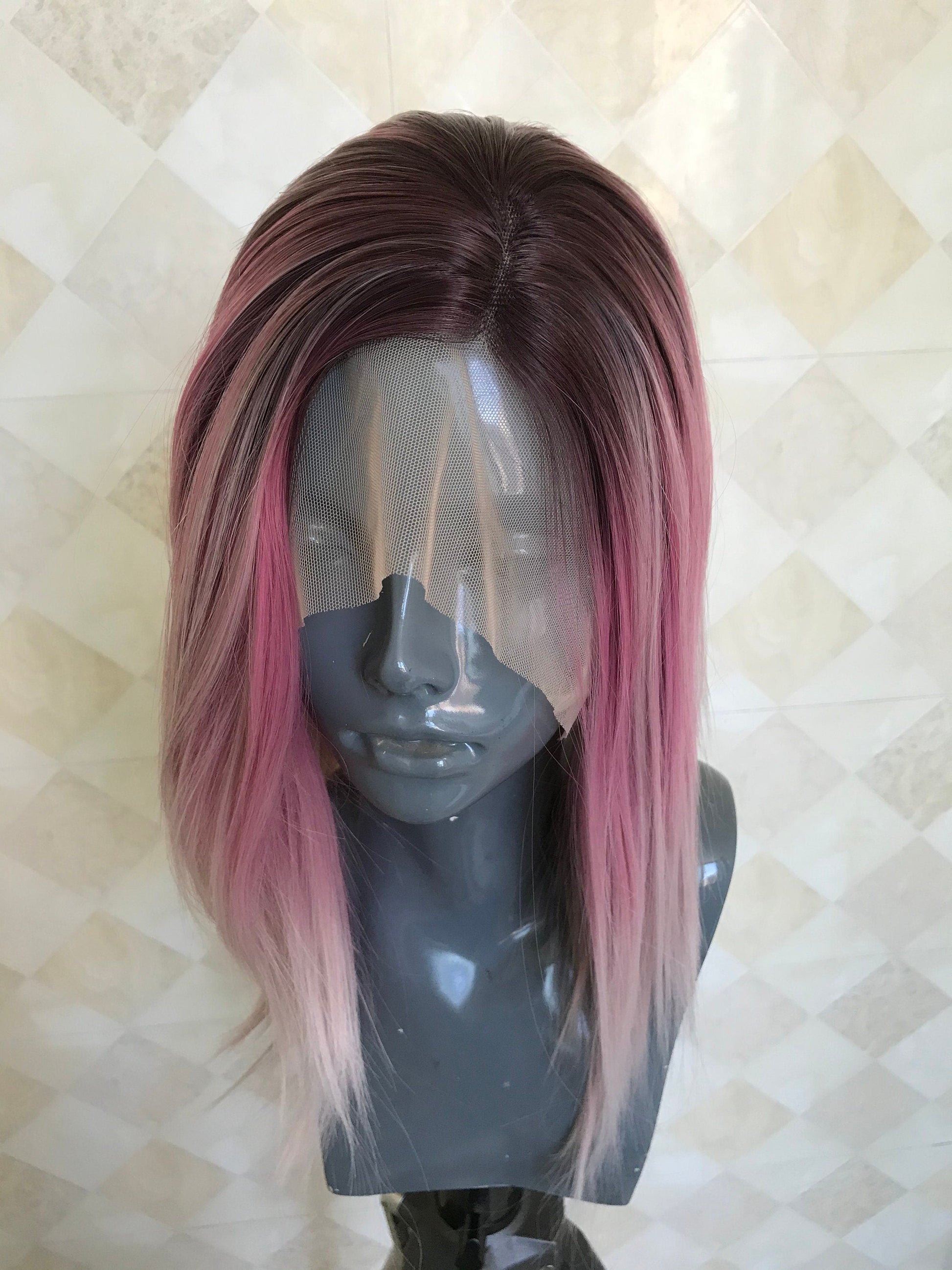 Rooted Blush Pink OmbreShort Straight Hair Premium Synthetic Lace frontal Wig Heat Safe Side Parting