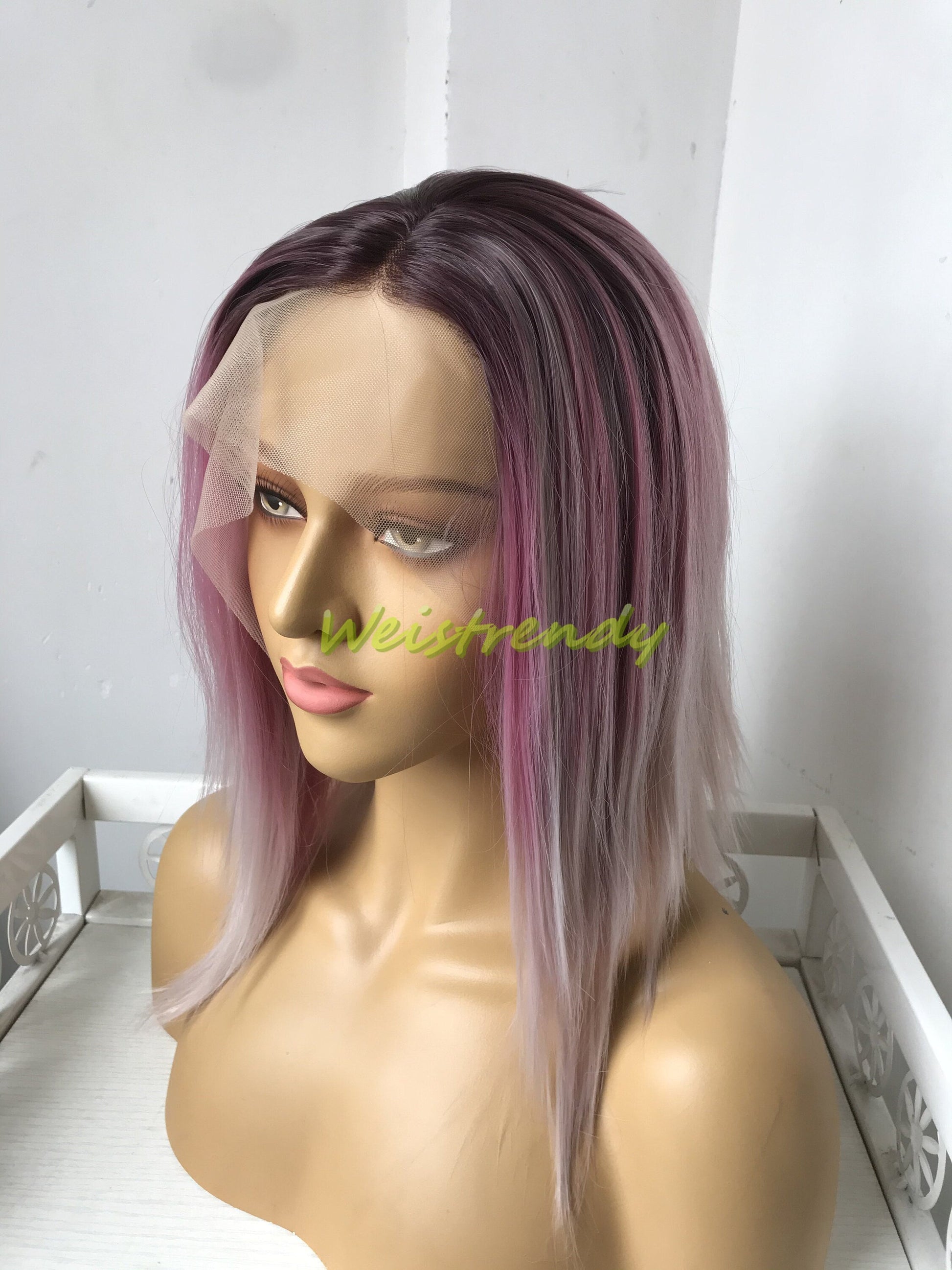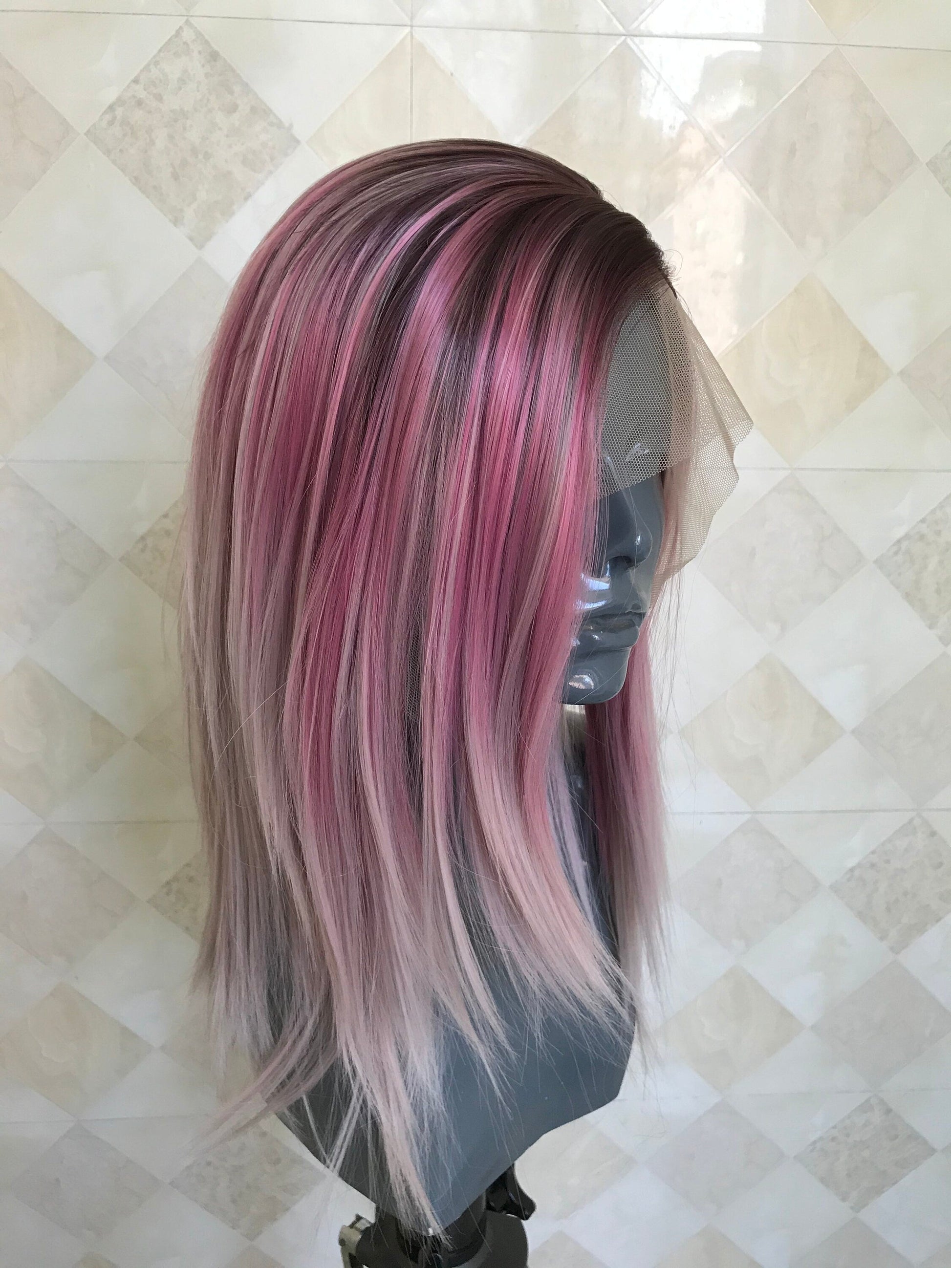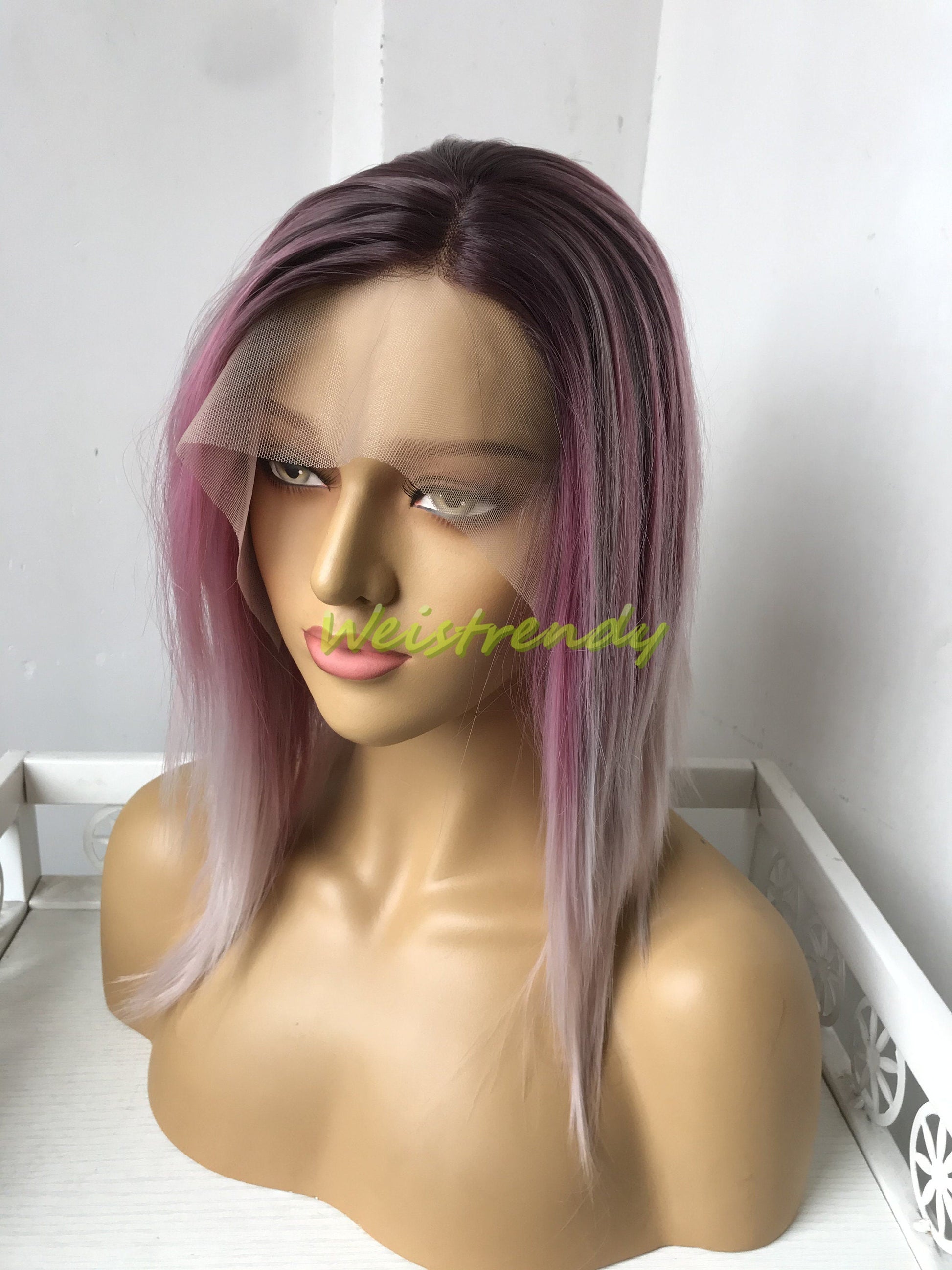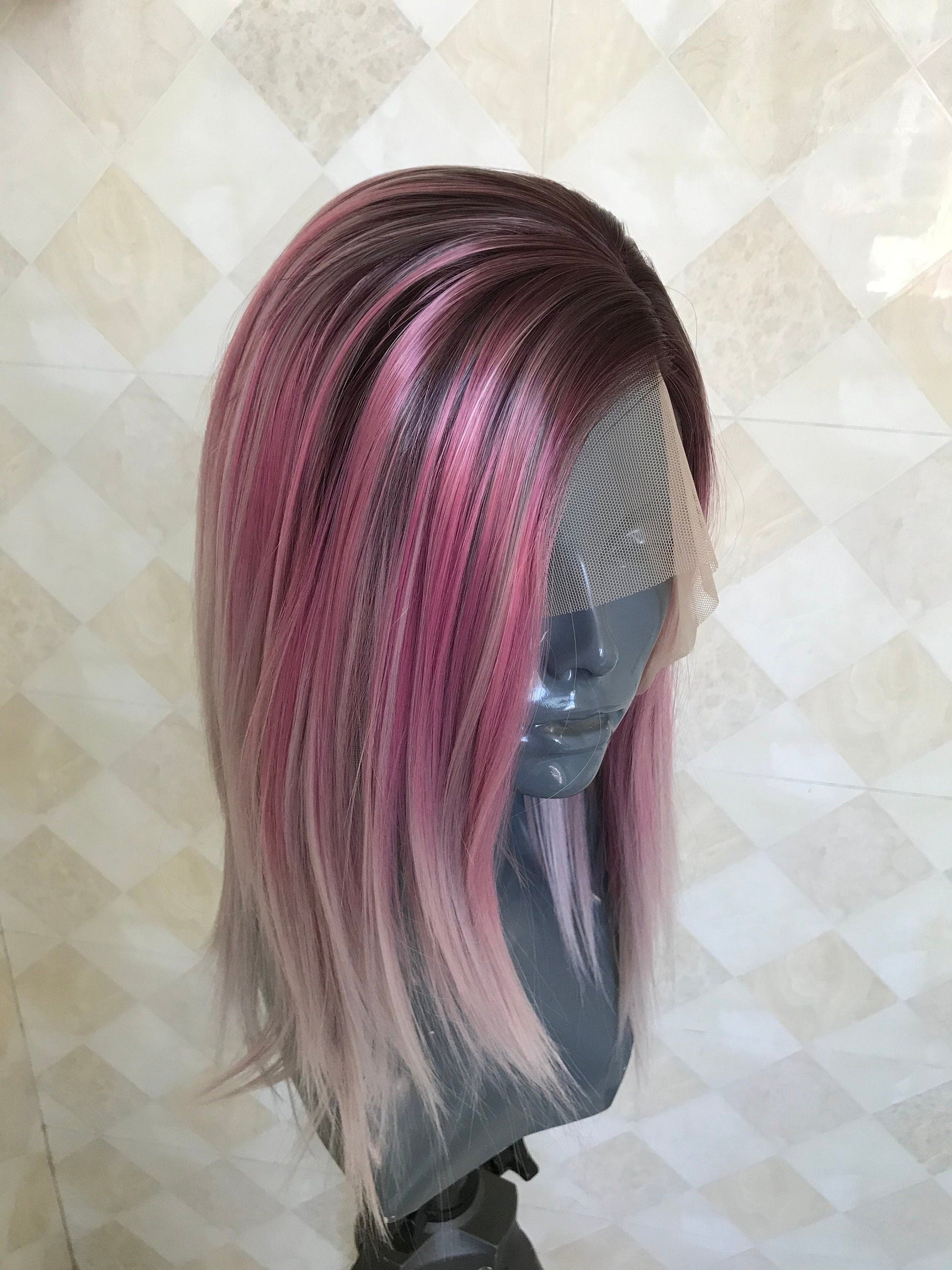 Rooted Blush Pink OmbreShort Straight Hair Premium Synthetic Lace frontal Wig Heat Safe Side Parting