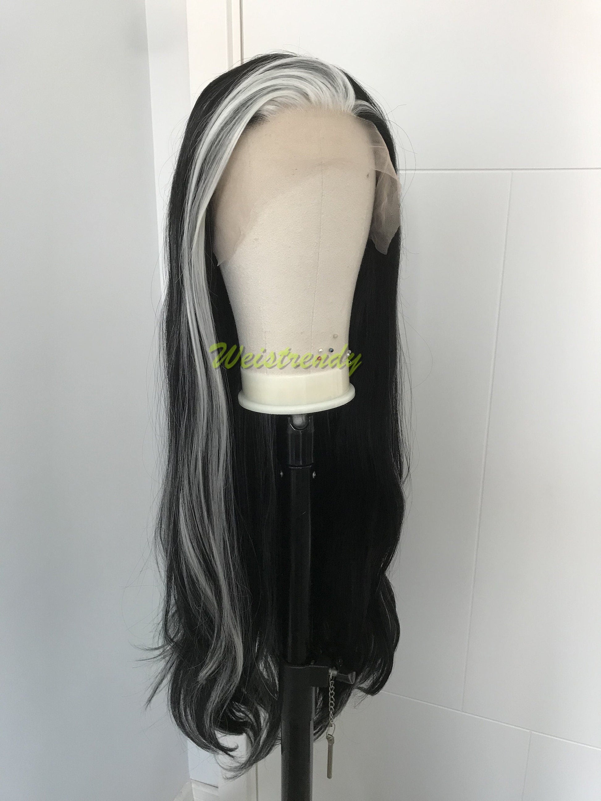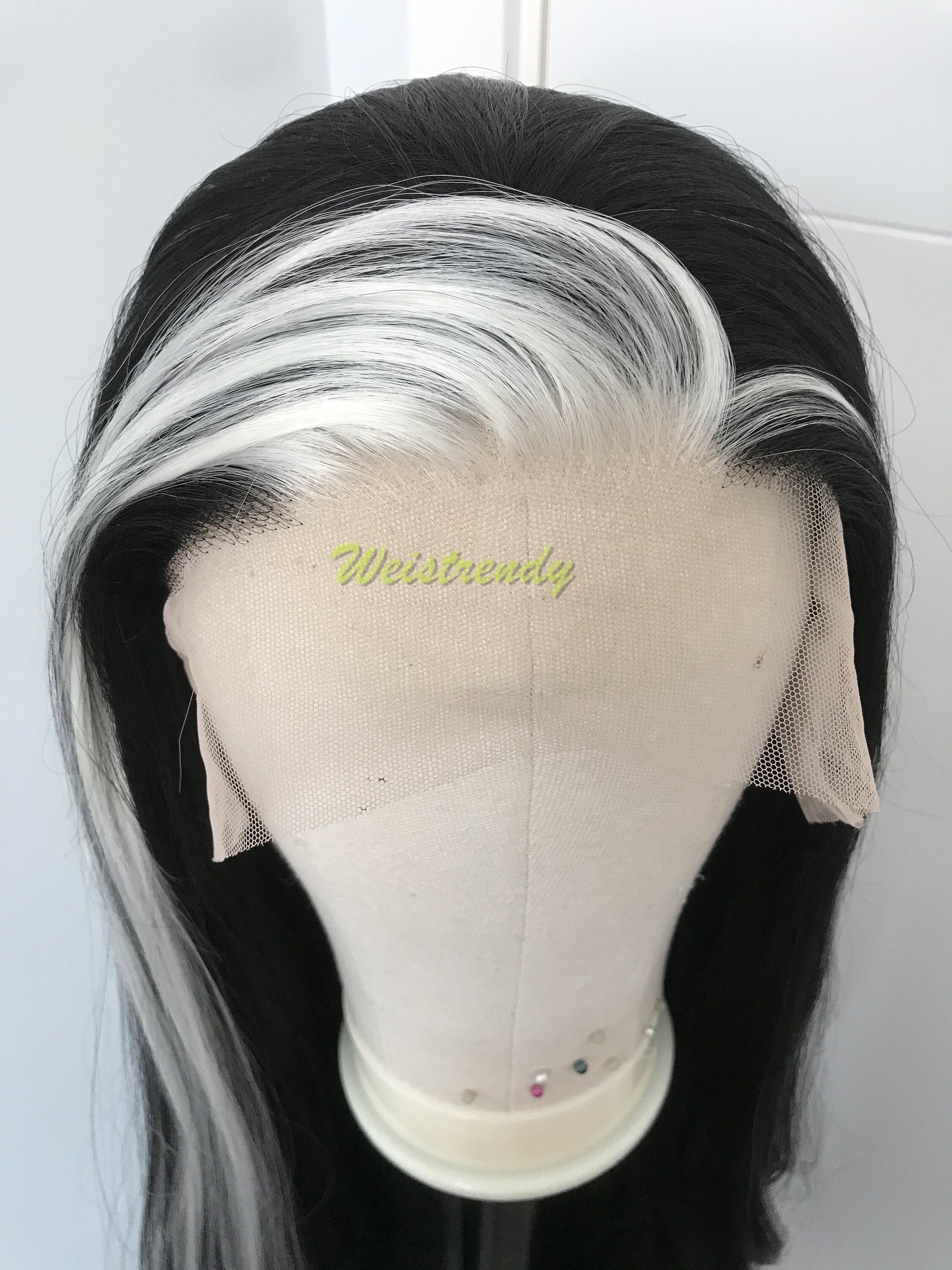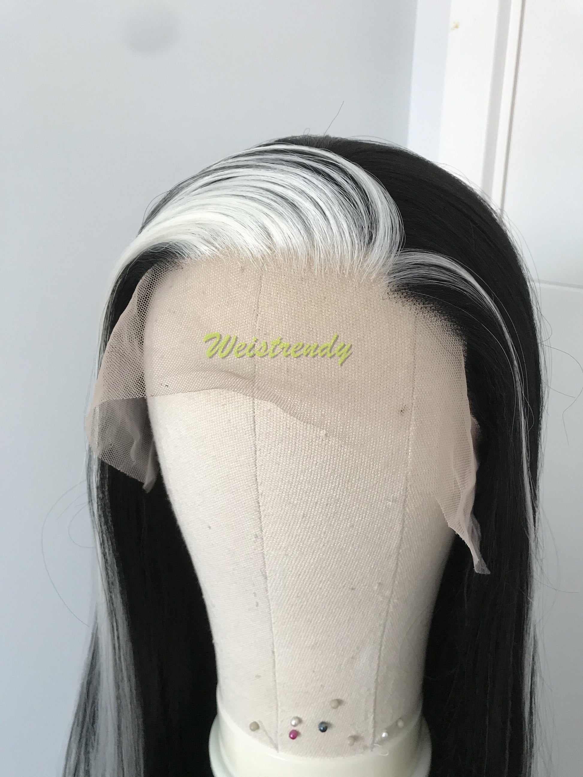 Silver Fronted Black Wig Jet Black with Pale Silver front edge Long Straight Hair Wigs Soft Swiss Lace Front Synthetic Wig Heat Safe