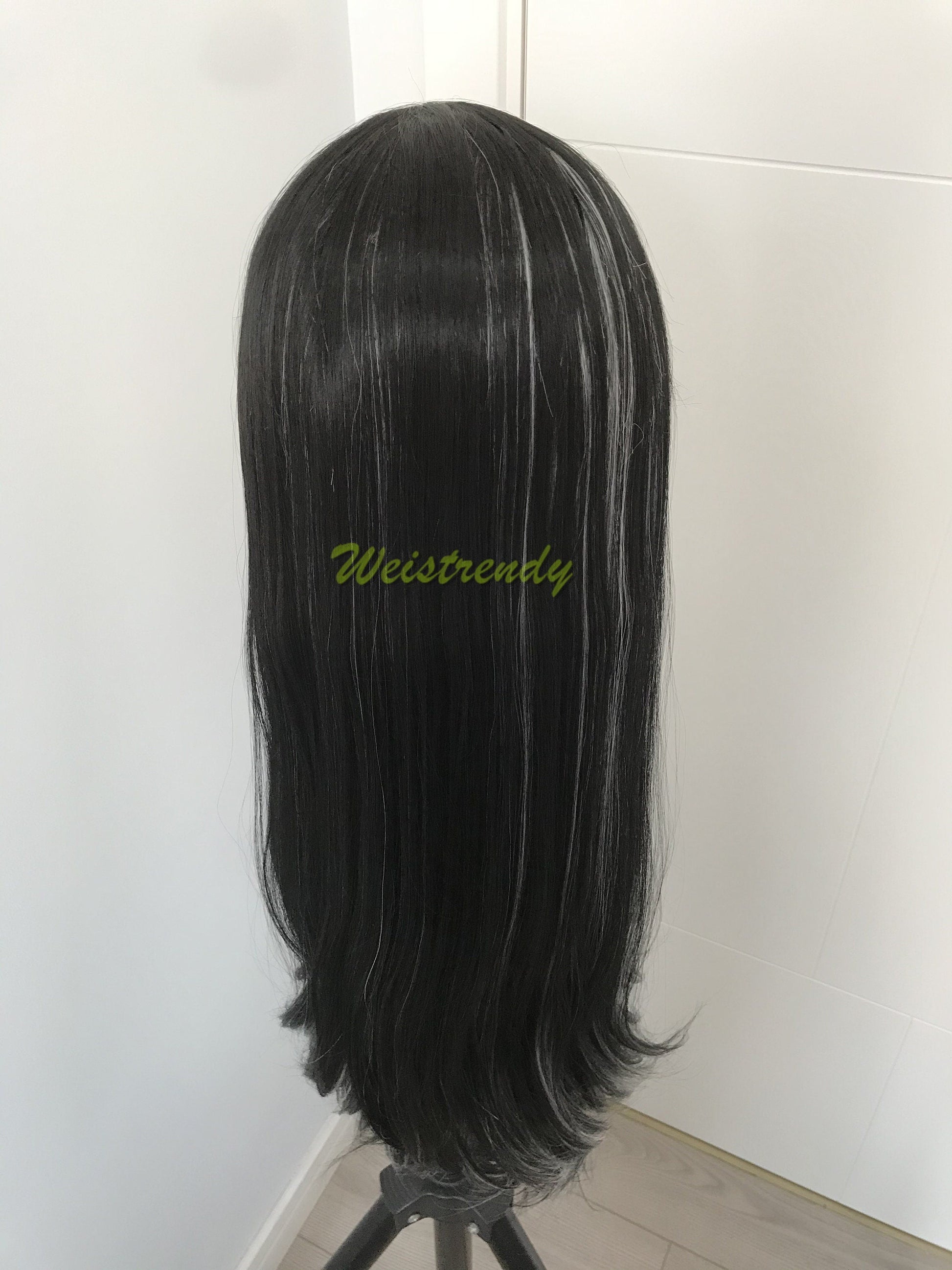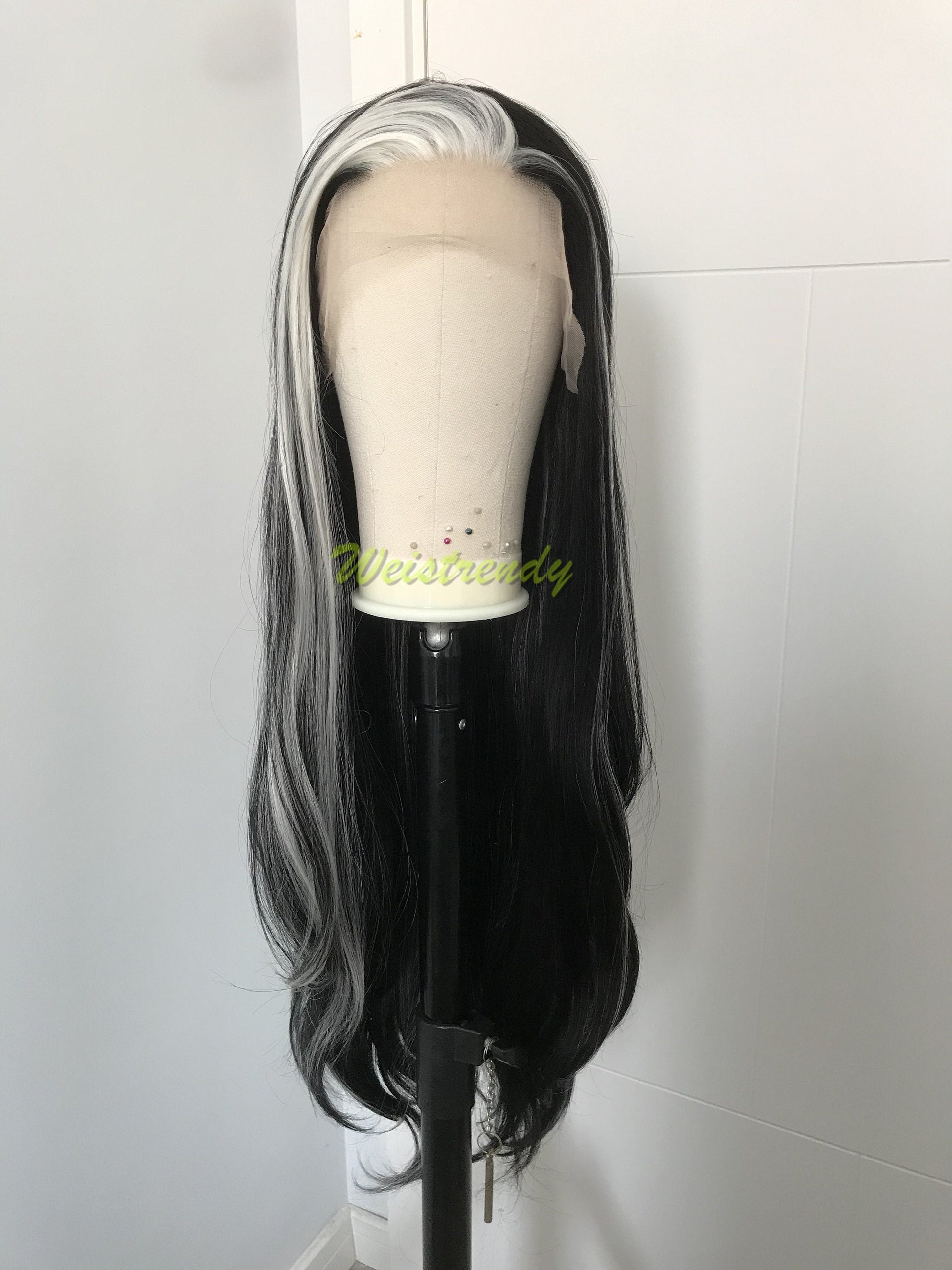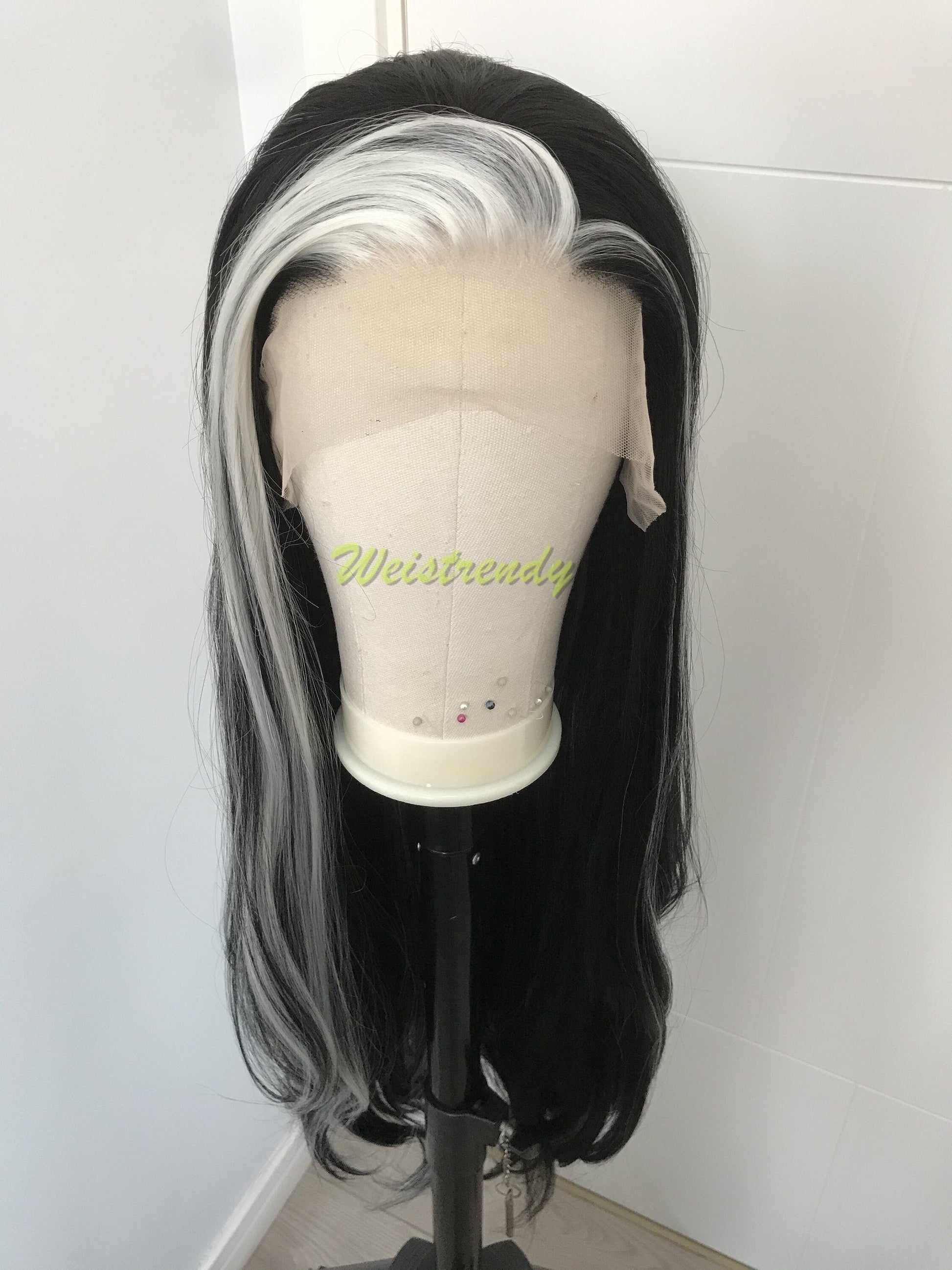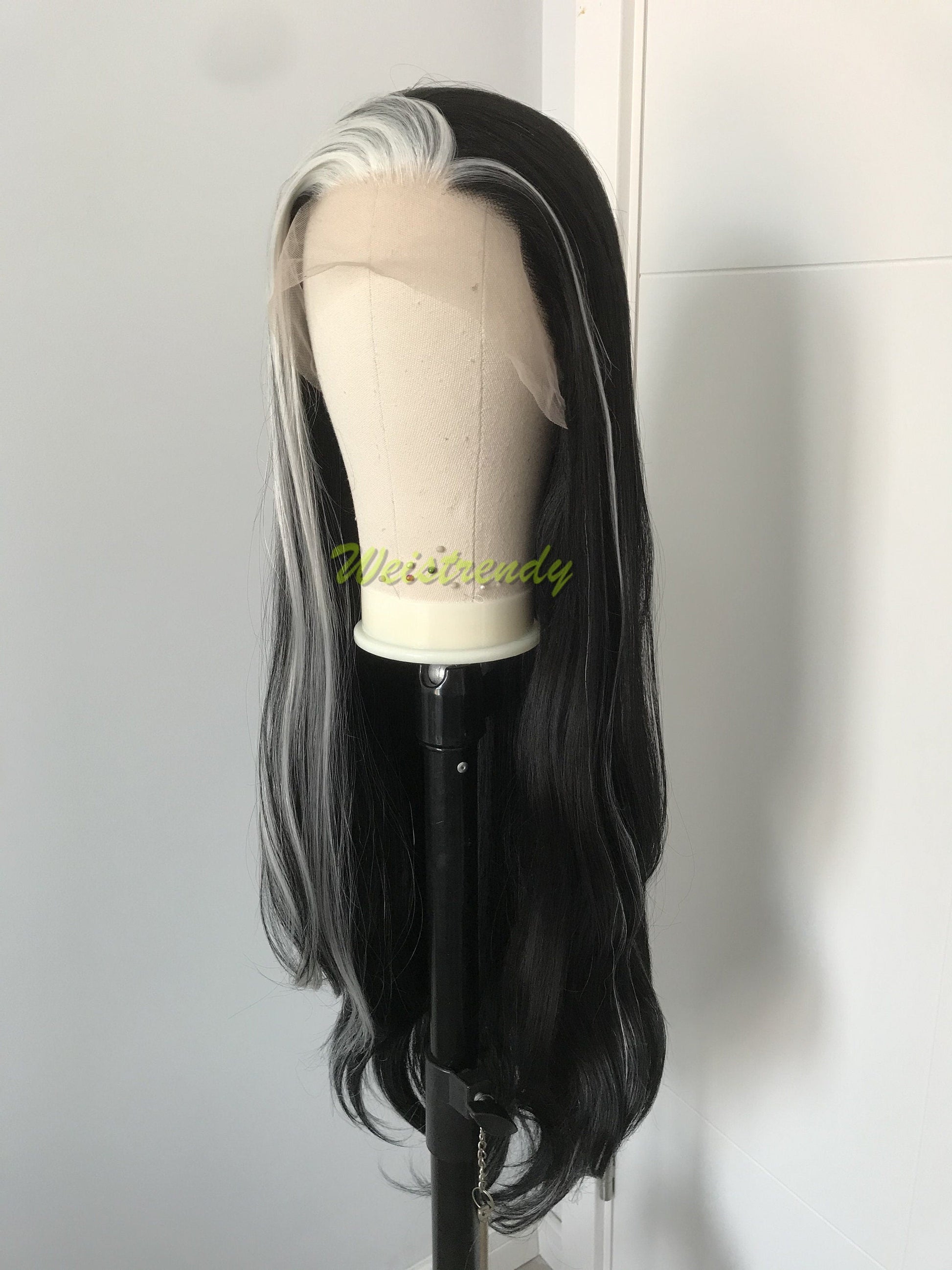 Silver Fronted Black Wig Jet Black with Pale Silver front edge Long Straight Hair Wigs Soft Swiss Lace Front Synthetic Wig Heat Safe